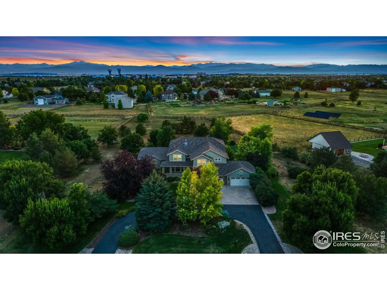 Welcome home to this beautifully appointed two-story in the highly sought-after Steeplechase subdivision! Perfectly situated on a rare 2-acre equestrian lot within Windsor city limits, this property offers incredible mountain views, room for up to two horses, and the ability to build an outbuilding-bring your toys, there's space to spread out and enjoy! A newly seal-coated circle driveway and irrigated mature landscaping-with over 50 trees-elevate the curb appeal and functionality of this already impressive property. The charming home features a wraparound front porch, vaulted ceilings, and a thoughtfully designed layout filled with natural light and custom details throughout. The main level offers a formal living room, a dining room with a butler's pantry, and a spacious island kitchen with double wall ovens. Sliding doors off the kitchen lead to the expansive back deck-complete with a pergola-making it ideal for outdoor entertaining. The stunning two-story family room boasts a gas fireplace and soaring ceilings, creating a warm and inviting space to gather. Upstairs, the primary suite features double-door entry, a cozy double-sided fireplace, and a spacious layout. Two additional bedrooms share a full bath, while a fourth bedroom includes a private en-suite. The finished basement offers a fifth bedroom and additional space to customize to your needs. Additional highlights include a large utility/mudroom, curved staircase, oversized 3-car garage, newer AC (July 2022), new furnace (Jan 2024) and water heater, and NO Metro Tax. Enjoy the convenience of being close to shopping, restaurants, golf courses, and I-25 - all while having the space and freedom of country living.