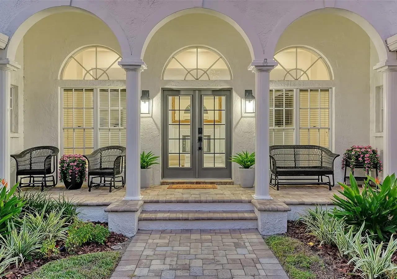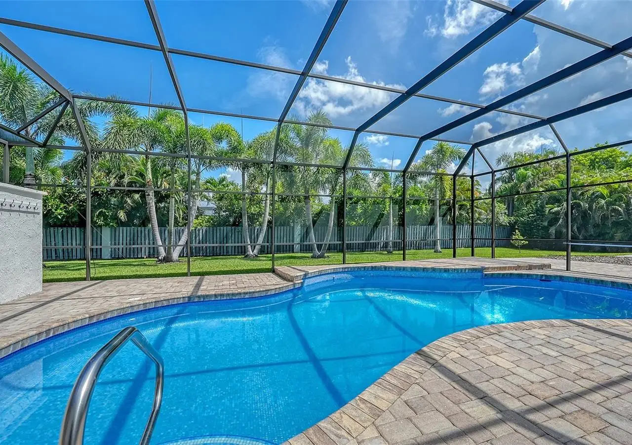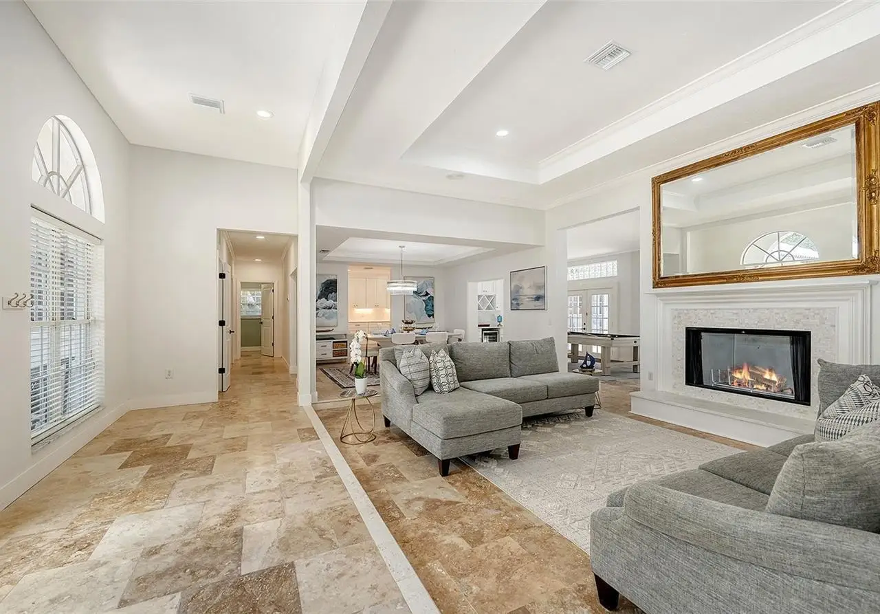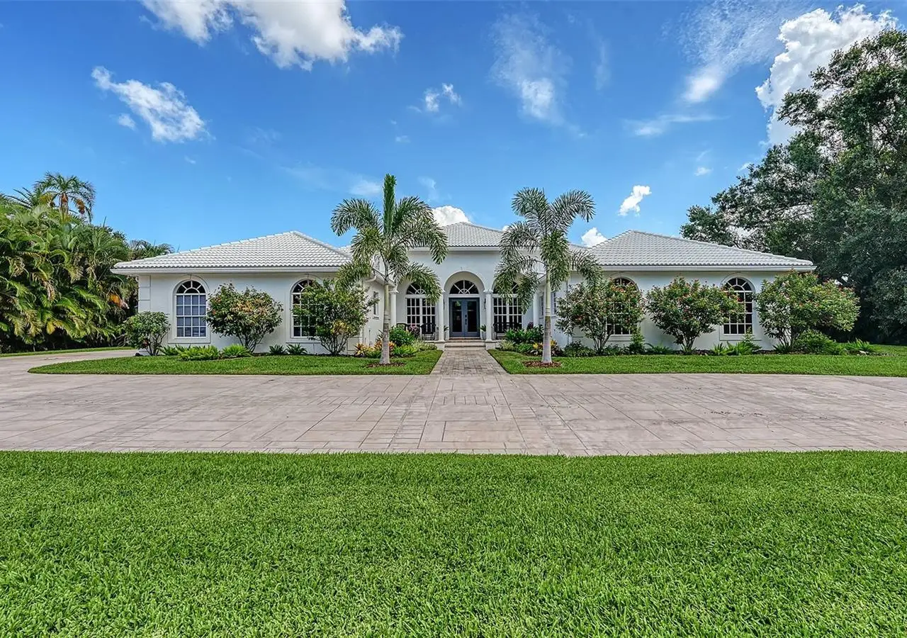 Tucked within the prestigious, gated enclave of Beneva Oaks, where centuries-old live oaks line meandering streets, this masterfully renovated home on a ½ acre lot offers incredible 2025 updates and a wonderful 4-bedroom, 3.5-bath, 1-story floor plan providing both grandeur and comfort across the expansive space. A circular drive framed by lush landscaping leads to the elegant entry of this modern residence, where refined upgrades blend seamlessly with timeless architectural features. Inside, travertine floors flow through the main living areas, while new designer carpet enhances the comfort of the bedrooms. The heart of the home is the extraordinary new eat-in kitchen featuring gleaming quartz countertops, crisp white wood cabinetry, stainless appliances including an induction cooktop, wide plank porcelain tile floor, and a custom tile backsplash. Accents like gold hardware, designer lighting, crown molding, and wide baseboards add the feel of luxury, while four sets of French doors connect the interior seamlessly with the lush exterior surroundings. An elegant dual-sided wood-burning fireplace with brick and tile surround and quartz and travertine hearths anchors the living and sitting areas, creating inviting spaces for conversation or quiet moments. With multiple entertaining areas designed for both intimate gatherings, grand-scale events or even a game of pool, the home's layout flows effortlessly from indoors to the screened lanai with paver deck, where a heated pool enhanced by Iconic Pools with sparkling new glass tile surface invites year-round enjoyment. The spacious primary suite, is a sanctuary unto itself, offering three walk-in closets with custom closet systems, and an extraordinary spa-inspired bath with bespoke tile work, frameless glass shower, gold fixtures, and a quartz-topped dual-sink vanity that exudes luxury. Two additional guest bedrooms enjoy new carpet, large closets, and generous natural light, while the newly redesigned guest bath impresses with design-forward flooring, quartz dual-sink vanity, and clean, modern finishes. The 4th bedroom can also be used as in-law suite, enjoying its own private French door entry and full bath with walk-in shower. The office with a custom built-in loft, closet, and a front facing window is ideal as a workspace, study, play, or creative escape. A chic updated powder bath adds further convenience. The thoughtfully designed laundry room features quartz countertops, utility sink, abundant cabinetry, and front-load GE Whirlpool washer/dryer. The oversized 2-car garage and beautifully landscaped grounds complete this exceptional property in one of Sarasota's most serene and sought-after neighborhoods. Located in a top rated school district, X flood zone and within close proximity to Sarasota's dining, shopping, culture, and the pristine Gulf of Mexico beaches, this exceptional property offers an unparalleled combination of design and craftsmanship in one of Sarasota's best-kept secret neighborhoods, presenting a rare opportunity to experience refined Florida living at its finest!