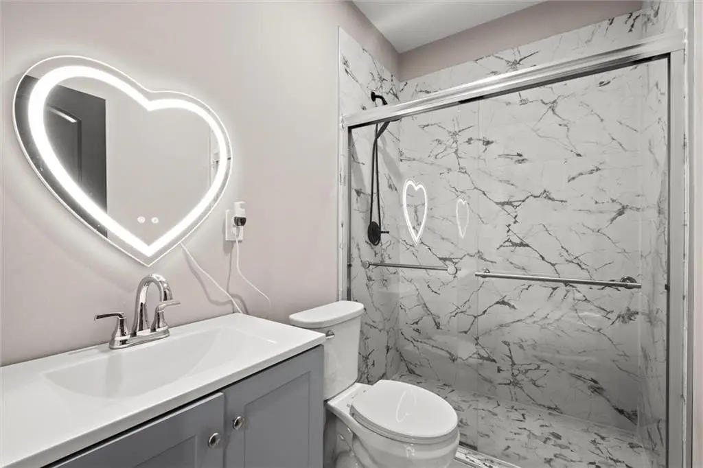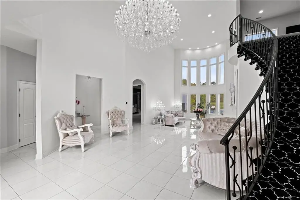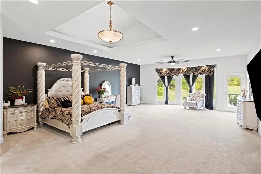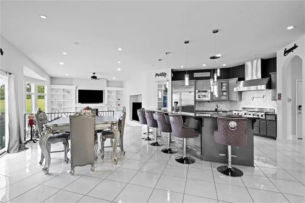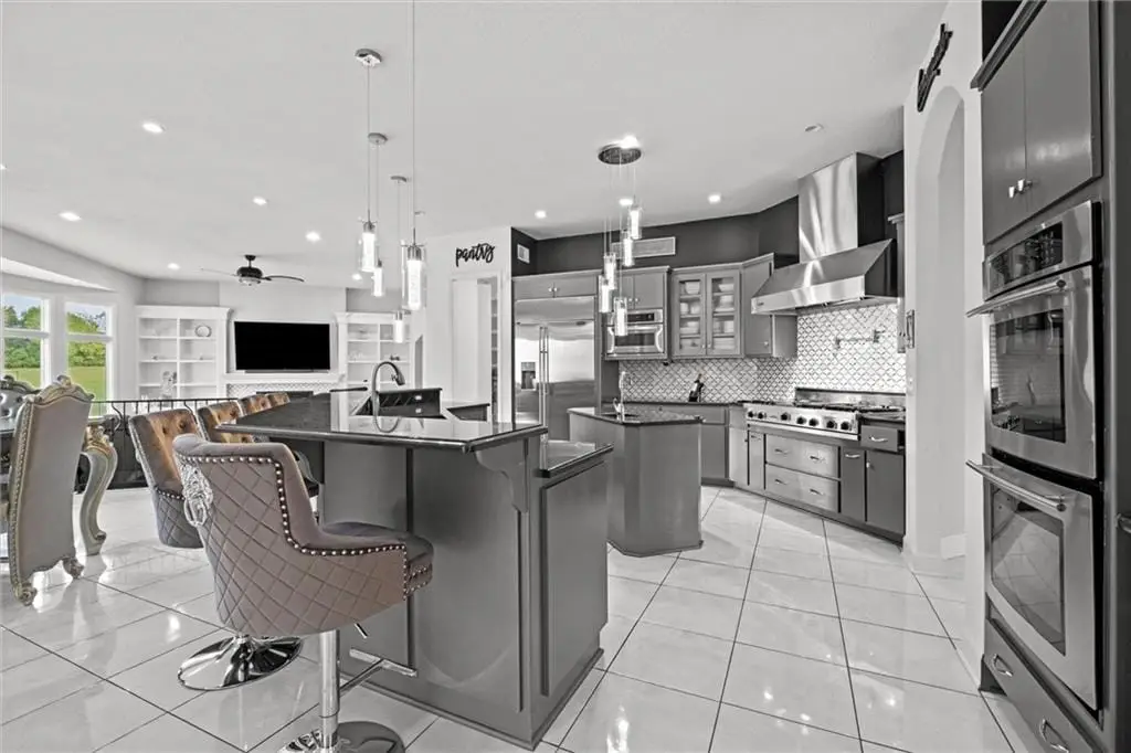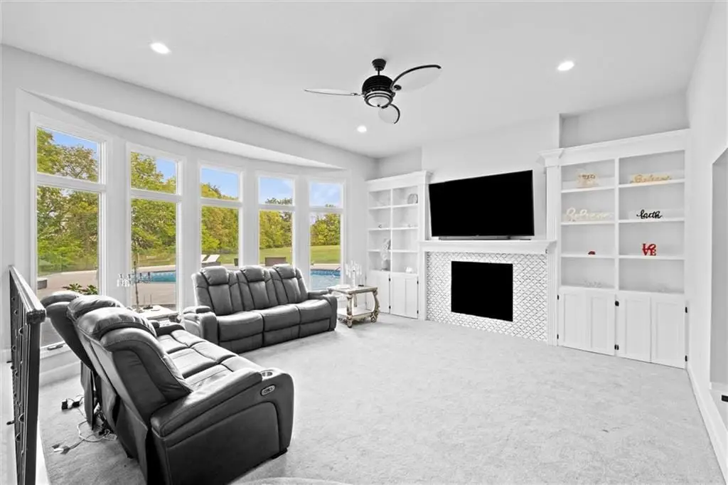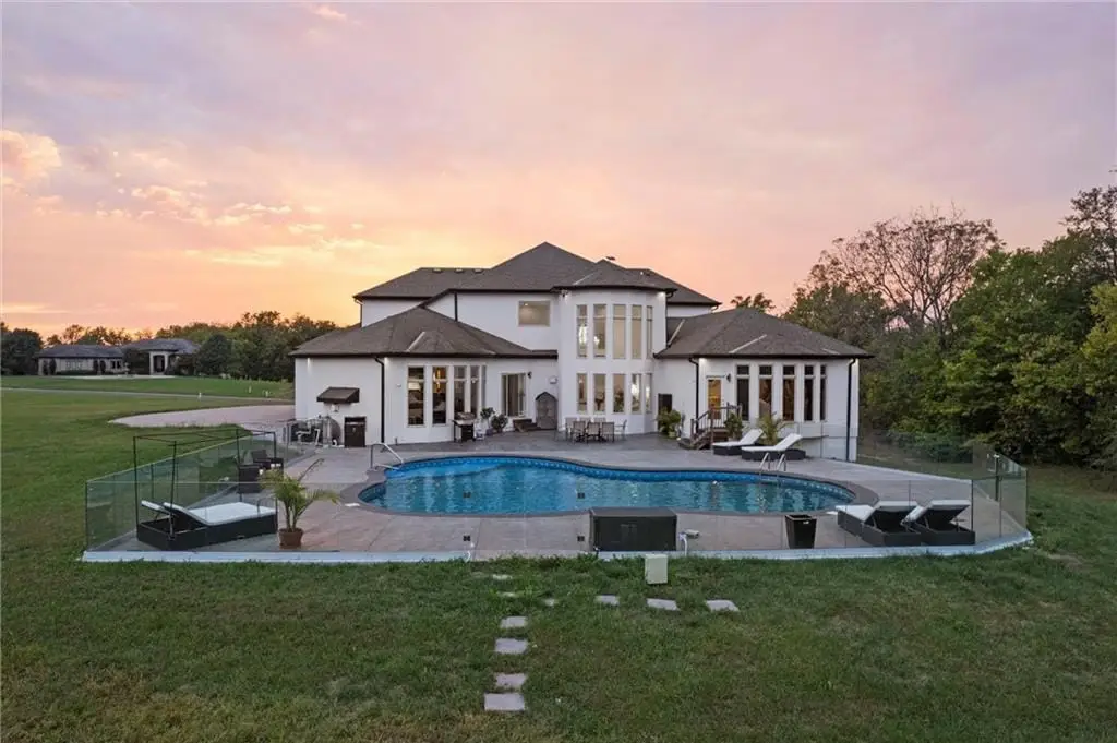 Stunning luxury estate on four acres in the coveted Wildflower Subdivision! Centrally located in highly desired Lee's Summit, featuring top-rated schools, and bordering the communities Legacy Park Complex where you will find 692-acres with softball, baseball, football and soccer complexes. The park also includes 3 shelters, Lovell Community Center, a 22-acre lake with fishing dock, disc golf course, amphitheater, playground, and a 4.7-mile trail. This home offers 5 bedrooms plus a 6th & 7th nonconforming in basement, a dedicated office on main level, 4 full and 3 half baths, and oversized 4-car garages. Soaring 20' entry ceiling & 22' formal living ceilings with floor-to-ceiling windows and a see-through fireplace into the chef's kitchen, which features a top-of-the-line Viking Refrigerator, 6-burner gas stove, Dual Islands with Prep Sink, 2 dishwashers, Pot Filler, Granite Counters, and a large walk-in pantry with built-in counter space. The oversized primary suite includes direct access to the pool, a see-through fireplace into the spa-like bath with whirlpool tub, dual vanities, dual-head shower, and a huge 3-tier walk-in closet with private laundry. Upstairs features a large loft, walk-in closets in every room, and a second laundry. The newly finished walkout basement was just finished in 2025 w/ upgraded tile throughout and offers true multigenerational living potential with its own 4th car garage, full kitchen with New SS appliances and walk-in pantry, 3rd laundry area, 3 living room/recreational areas, theatre room, 3 bedrooms (2 non-confirming), 3 bathrooms, and a walkout to the side yard. The backyard is an entertainer's dream w/ a nearly new heated vinyl pool, new stamped concrete patio, & glass fencing, plus tons of open backyard space for recreational sports. Additional features include a Reolink hardwired security system w/ 16 cameras, oversized deep garage bays, a beautiful circle driveway, & abundant storage. Upgraded lighting and plumbing throughout.