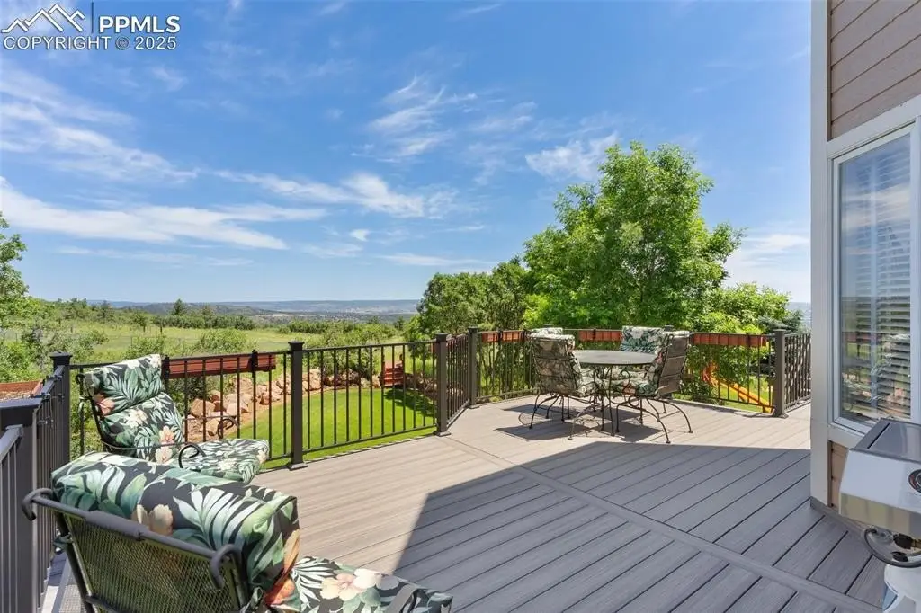 Your Dream Home Awaits! Nestled in the highly sought-after Peregrine neighborhood in NW Colorado Springs, this extraordinary 6-bedroom, 5-bath residence redefines luxury living with its sweeping mountain and city views. Spanning 4,507 square feet, the home perfectly balances elegance and functionality in one of Academy District 20’s most desirable communities. Freshly painted throughout, this home welcomes you with soaring ceilings, hardwood floors, and a dramatic staircase. The spacious dining and living rooms set the tone for gatherings, while the sun-filled family room (don’t miss the sizable hidden storage!) impresses with oversized windows, a cozy gas fireplace, and captivating views of the city, mountains and Air Force Academy. The kitchen is a true entertainer’s delight, offering stone countertops, sleek cabinetry, and an island designed for conversation and function. The floor plan shines with thoughtful touches, including a private office just off the staircase and expansive windows framing views in every direction. Upstairs, the primary suite is a retreat with breathtaking panoramas, a spa-like 5-piece en suite, and walk-in closet. A junior primary with updated bath, two additional bedrooms with a shared Jack & Jill bath, plus tasteful updates throughout elevate the home. The walk-out basement offers two more bedrooms, a full bath, and a large recreation room ready for movie nights, workouts, or hosting guests. Outside, a newer 40x20 composite deck provides the perfect vantage point for enjoying both mountain views and city lights. The lot is a rare find, backing to the AFA for maximum privacy while offering usable yard space for play, gardening, or relaxation. Additional features include updated light fixtures, central AC, security system, and oversized 3-car garage with storage. With neighborhood parks, ASD20 schools, and a prime Peregrine location, this home is more than a place to live—it’s a lifestyle. Don’t miss the chance to make it yours!