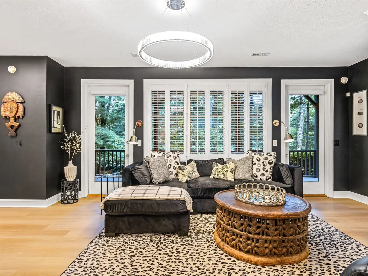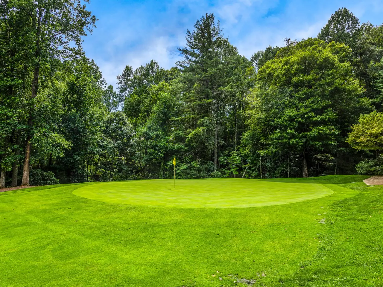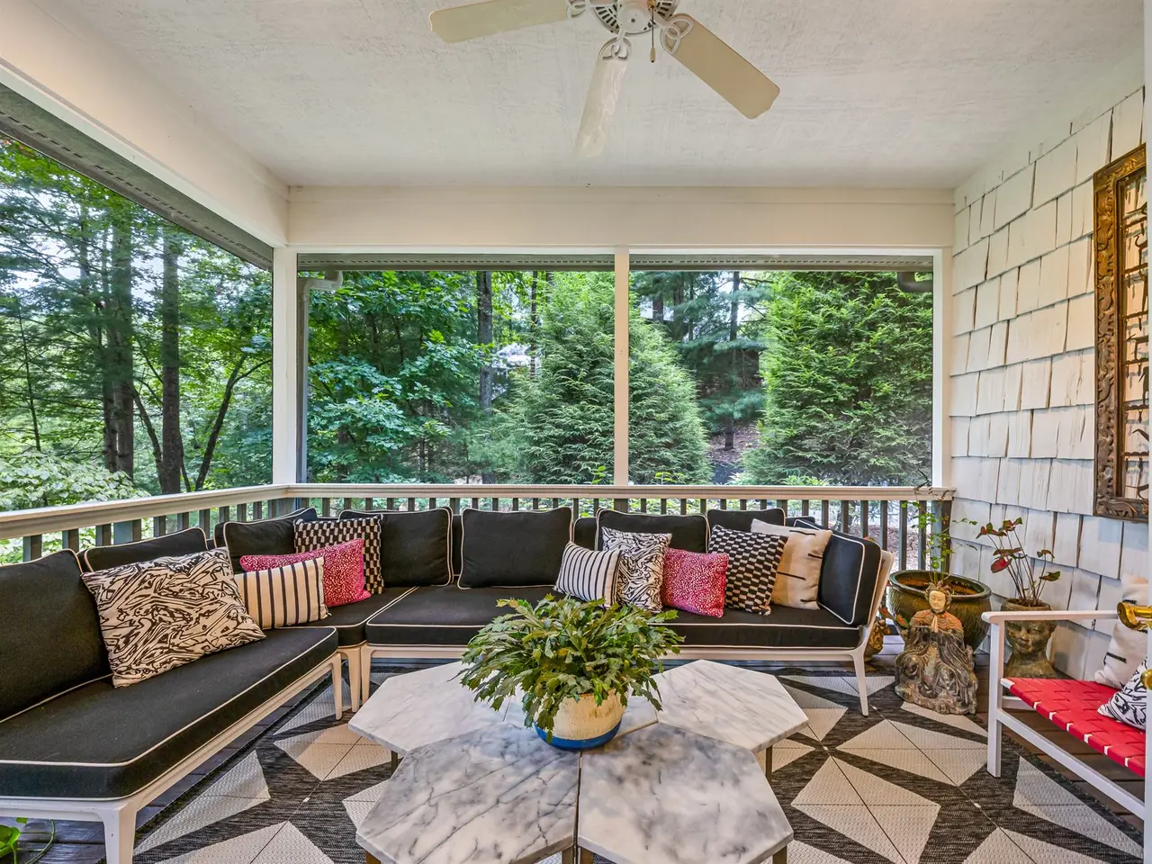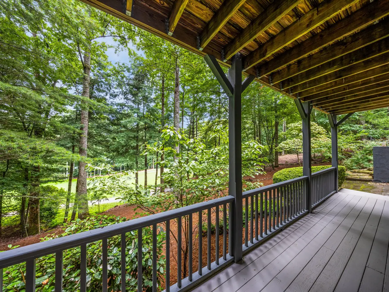 Nestled in Champion Hills above the 12th green, this artist's mountain retreat home pairs modern luxury with an eclectic, world-travel flair. Thoughtful updates and attention to detail bring comfort and style together. From the Samsung Frame TV on a hydraulic TV lift that preserves the aesthetic of the fireplace wall, Brazilian Quartzite countertops in the chef's eat-in kitchen to all the wood floors. The main level's soaring great room and primary suite offer ease of one-level living, while the terrace level is designed for both fun and function with a family room, office, guest suites, and a wet bar. Multiple porches and decks encourage life outdoors - morning coffee on the screened porch, evening wine on the open deck, or quiet afternoons on the covered terrace. Plush yet practical, with golf cart storage, workshop, and abundant space, this home invites you to live serenely in the Blue Ridge Mountains while only minutes from downtown Hendersonville.