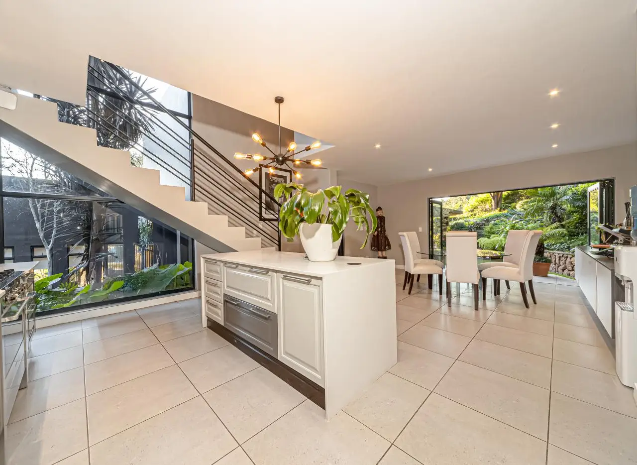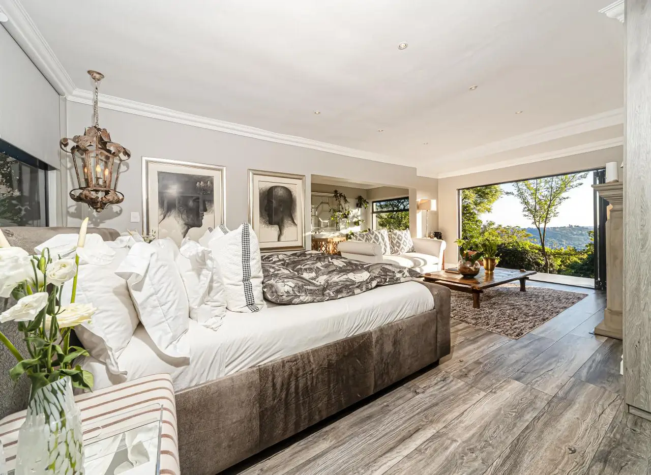 A Nature-Infused Masterpiece in Northcliff - Where Style Meets Soul Perched on the majestic Northcliff ridge, this home isn't just a property - it's an immersive experience. Thoughtfully designed to blend architectural finesse with natural tranquillity, it offers a lifestyle that is as elevated as its panoramic views. From the moment you enter the gated, boomed-off enclave with dedicated security, a sense of peace settles in. The beautifully landscaped entrance courtyard, complete with a koi stream winding through sculpted greenery, sets the tone for what lies ahead: serenity, sophistication, and seamless indoor-outdoor living. Stepping through the grand glass doors, you're welcomed by a light-filled, open-plan interior where spaces flow effortlessly. A striking double-sided fireplace anchors the lounge and dining room, casting warmth across the elegant wood-look flooring. Floor-to-ceiling stacker doors peel away to reveal a private timber deck and a heated mosaic swimming pool - perfect for soaking up the sun or enjoying twilight views of Johannesburg's skyline. The dining area, framed by lush greenery and wide vistas, spills into a gourmet kitchen designed for both function and flair. Here, no detail has been spared: a double Whirlpool oven, gas hob, built-in fridge, microwave, dishwasher, coffee machine, and a wine cooler create a seamless culinary experience. Tucked just behind is a generous scullery adorned with bespoke cabinetry and stone countertops, keeping everything crisp and clutter-free. Just off the main living space, the TV lounge offers a cozy, intimate space with calming views over the English-style front garden and tranquil water feature. To the left wing of the home, two luxurious bedrooms boast open-plan en-suite bathrooms, underfloor heating, private toilets, and glass doors that open onto a patio with breathtaking views. The main suite is a sanctuary of warmth and refinement, featuring a gas fireplace, a freestanding bath, and sliding doors that frame uninterrupted treetop and city views. The right wing reveals even more to love: a secondary open-plan kitchen and lounge area opens into the garden and wraps around the koi pond - ideal for guests or dual living. Upstairs, two additional bedrooms each feature their own en-suite bathrooms and private balconies that overlook the manicured garden and surrounding landscape. Two double garages, one with direct access into the home, offer practicality and security, while external beams and an independent alarm system in the guest wing provide peace of mind. With approximately 550sqm under roof and set on a lush 2,016sqm stand, this residence invites you to live beautifully, surrounded by nature and luxury. This is not just a Northcliff home - it's a timeless, soulful retreat where design, landscape, and lifestyle live in perfect harmony.