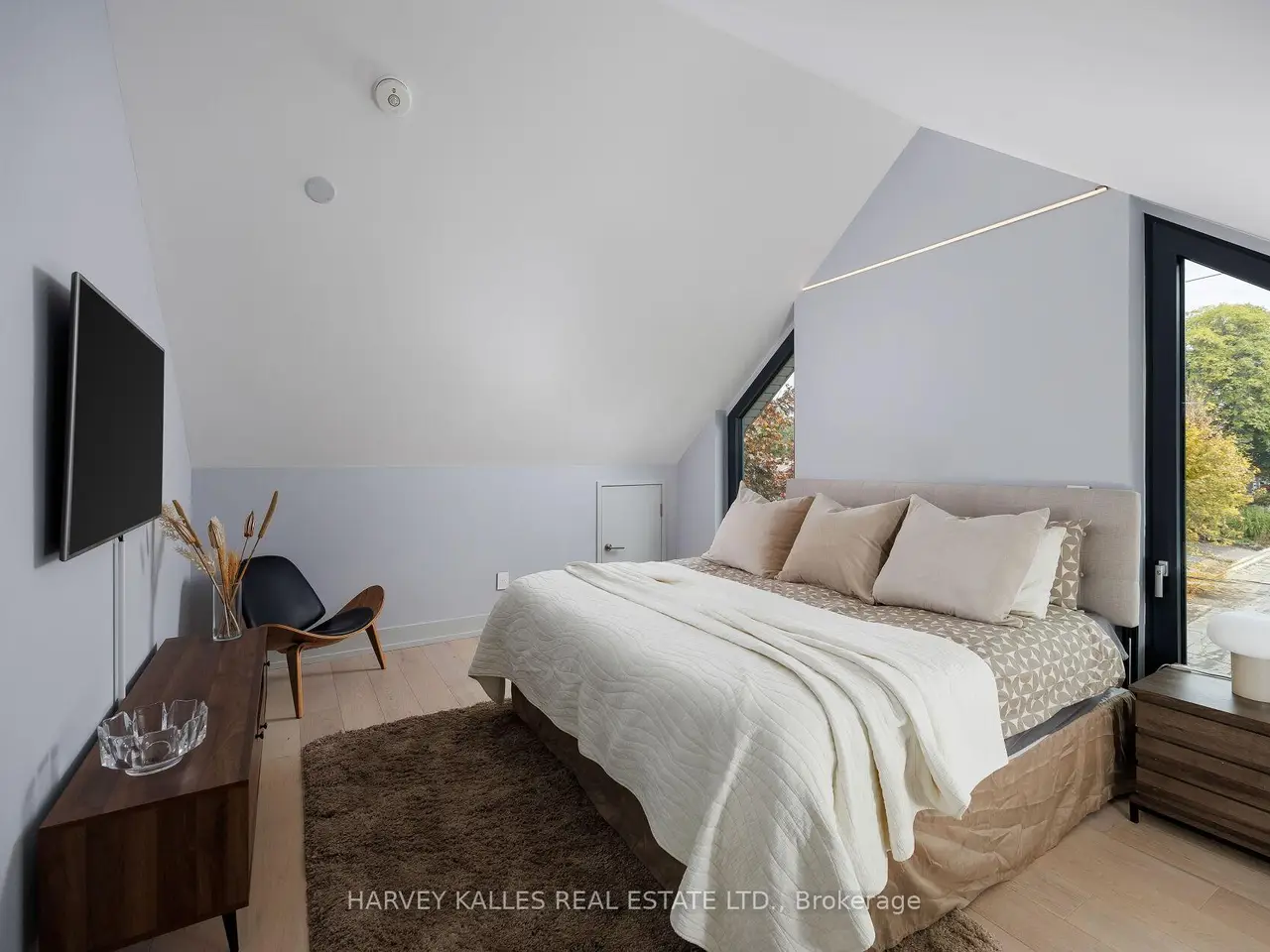 A masterfully reimagined residence that captures the essence of contemporary luxury. Designed for the discerning professional family, this home balances refined style with livability - a rare find in the one of the city's most coveted east-end enclaves. This exceptional 3+1 bedroom, 5 bath, custom home, blends architectural detail, sophisticated interiors and forward thinking engineering with an open-concept main level, 10 foot ceilings and almost 3000 square feet of living area. The home includes wide plank Maple hardwood floors, custom millwork and many upgrades that set a tone of quiet and contemporary luxury. Passive Home rated floor to ceiling windows and fully electric Hunter Douglas blinds accentuate sun-filled rooms. The living and dining areas are ideal for elegant entertaining, anchored by a Scavolini kitchen with an inviting quartz island that truly inspires culinary kings and queens - complete with ultra high end professional-grade appliances. Second level, private quarters offer a sanctuary for modern family life. The staircase, lined with a slatted white oak floor to ceiling feature wall winds into the open concept den and 2 abundantly appointed bedrooms with artful detailing and two individual full baths and laundry room. Rising to the 3rd floor's westward view of the city, the primary suite features 5 pcs ensuite, stone crafted soaker tub and Scavolini walk-in. Lower level integrates form and function with a stylish media lounge area, home office and exercise area. Employing a premium, performance based eco-friendly Passive Horne template, the home includes heated floors throughout. Roof top solar panels create an almost net zero energy efficient home. West facing urban backyard oasis for morning coffee and entertaining. Steps to Greenwood Park and Queen East shops, this is the ideal home for Up-sizers, Urban Professionals and the discerning buyer, who appreciates craftsmanship, community and modern convenience in an upscale, urban neighbourhood.