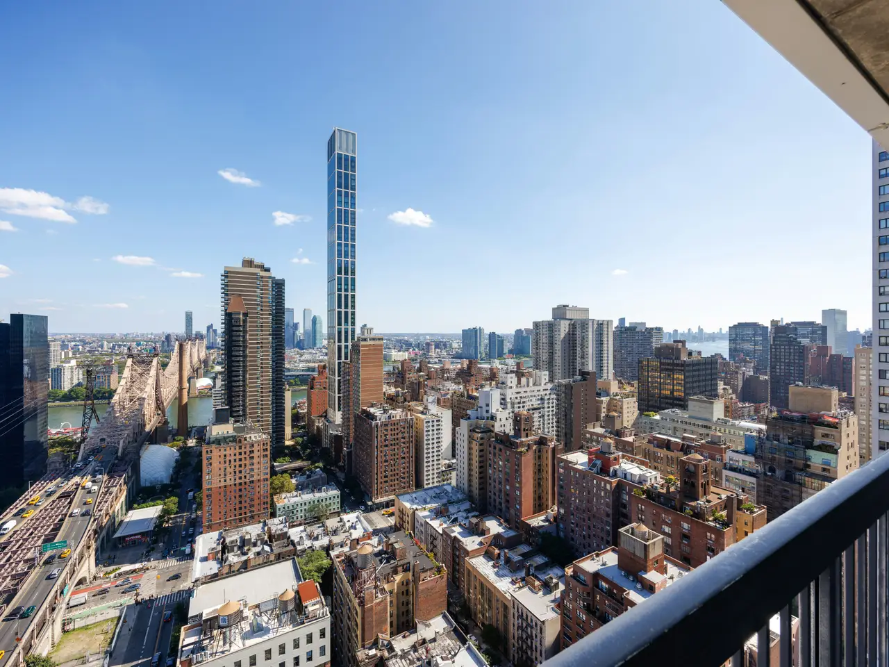 A Published Masterpiece in the Sky Perched on the coveted northeast corner of the 35th floor, this residence is offered for the first time since its masterful designer renovation by Sarah Zames & Colin Stief of General Assembly. Reimagined with a clean material palette, the home balances refined architecture with effortless livability. Walls of glass frame panoramic views across the ever-changing East Side skyline, creating a home of many moods and scenes. With balconies on both sides of the apartment, the vistas can be enjoyed from the outdoors as well. As Dezeen observed in its feature on the residence, the architects sought "a balance between the feeling of being in the air, while being grounded by the weight of the building." The custom kitchen is anchored by a concrete waterfall island with a built-in wine fridge and microwave drawer. Light wood cabinetry frames the Thermador suite, including a 6-burner gas cooktop and oven, Sapphire Glow dishwasher, and refrigerator with Open Door Assist- just a gentle touch opens the door, the ultimate luxury detail. Windows line the kitchen, filling the space with light and lively city views, turning daily routines into moments of enjoyment. Honed Caesarstone counters and a sophisticated ceramic tile backsplash complete the modern design, while built-in shelving offers a stylish home for barware, vases, and everyday essentials. The primary suite offers a serene retreat, complete with two closets plus a 14-foot walk in by California Closets. Pocket doors provide quiet separation, while custom millwork introduces floating bedside tables and subtle ledges for art or keepsakes. A unique architectural opening filters natural light between the bedroom and bath, elevating both spaces. The ensuite is finished with a travertine vanity, soaking tub, Japanese washlet, matte black fixtures, and richly hued vertical tile, a striking marriage of warmth and refinement. The second bedroom includes a generous closet and is enclosed by a sliding panel of reeded glass, a purposeful design choice that allows natural light to filter through while maintaining privacy. This thoughtful detail makes the room ideal not only as a bedroom but also as a home office or den. The other full bath features a stall shower, midnight cabinetry, travertine vanity, brass fixtures, and a Japanese washlet. Additional thoughtful details include discreet TV wall behind sliding door, built-in entry storage, motorized shades, Lutron-controlled lighting, anti-UV window films, and split AC units in the bedrooms. The Landmark is a full-service luxury building offering a modern lobby, landscaped roof deck, garage with Zipcar, and on-floor washer/dryer access. Two dogs or cats are welcome per apartment!