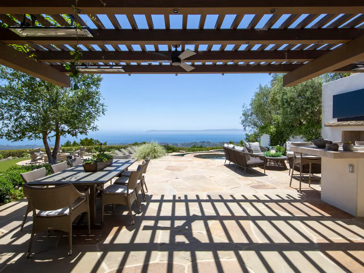 Nestled in the hills of Montecito, this newly renovated estate offers unmatched panoramic ocean, island, and mountain views. The grand main residence features soaring ceilings, wide-plank wood floors, arched French doors, a showstopping kitchen, a formal dining room, and a luxe primary suite with dual bathrooms and closets. Three additional bedroom suites, two guest houses, and stunning outdoor spaces--complete with an outdoor kitchen, pool, spa, gardens, and multiple terraces--create an unmatched living experience in a private gated setting.