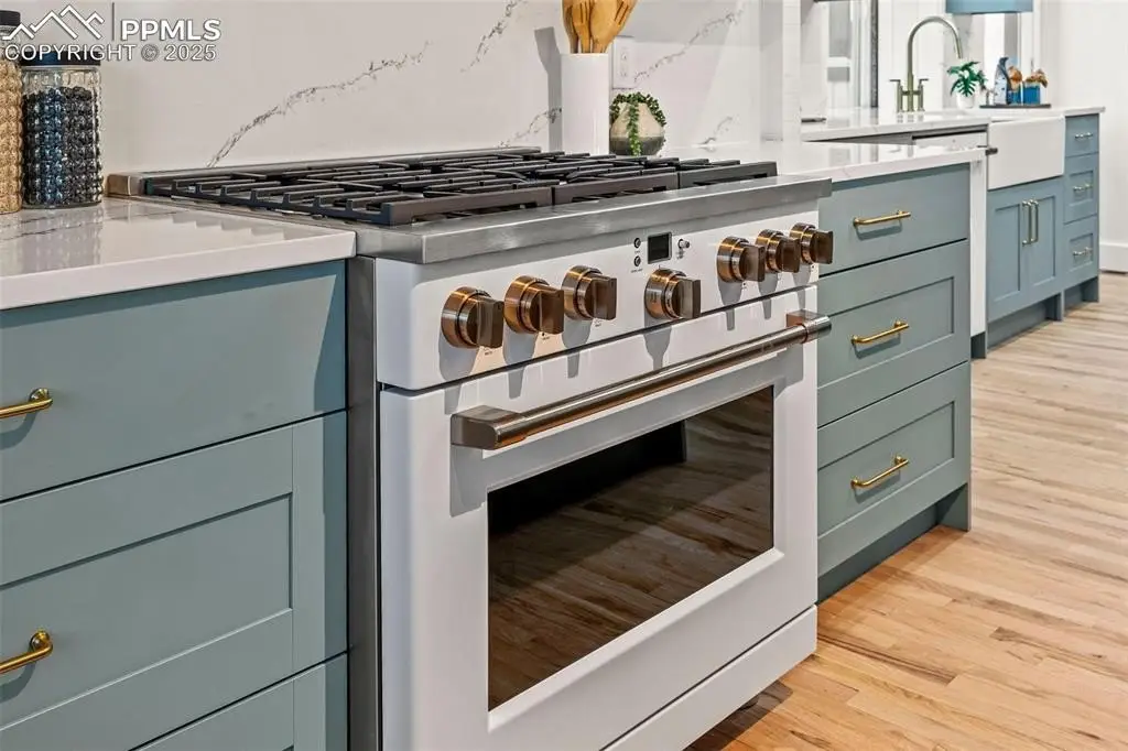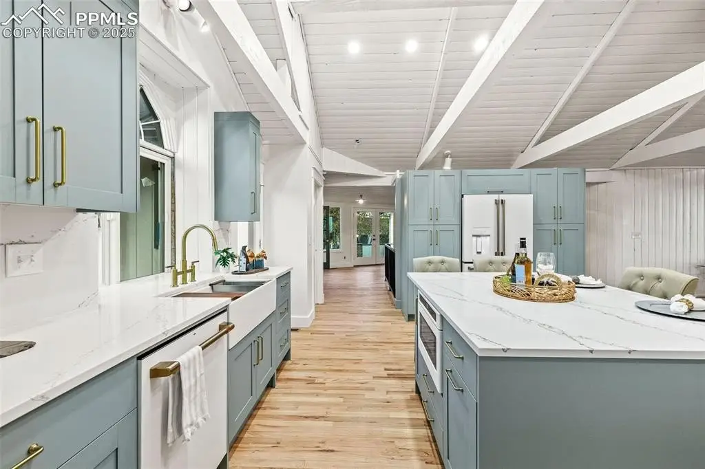 Rare Southern Cape Cod/Beach Style Retreat in Colorado Springs – City & Mountain Views! Welcome to this fully remodeled, one-of-a-kind Southern beach-inspired ranch perched in one of Colorado Springs’ most sought-after neighborhoods. Blending coastal charm with mountain living, this home offers breathtaking panoramic views of both the city skyline and the Front Range — a truly rare find in the region. Step inside and you will immediately notice the vaulted, beamed ceilings with tongue-and-groove detailing, setting a warm, airy tone throughout the open-concept main level. The heart of the home is a gourmet chef’s kitchen, featuring high-end GE Café appliances, a double oven, and a stunning pass-through fireplace that connects both the kitchen and living areas. The expansive main-level master suite feels like a private retreat, boasting generous space, custom finishes, and spa-like elegance. Designer touches are found throughout the home, from curated lighting to premium flooring and custom cabinetry. Enjoy true indoor-outdoor living on the brand-new 1,800 sq ft composite deck, perfectly positioned for spectacular city views and engineered for a drop-in hot tub. The walk-out basement offers additional living and entertainment space, seamlessly connecting to the beautifully landscaped yard. The home has new windows, deck, concrete patios, roof, A/C, all new landscaping and sprinkler system, interior/exterior paint, custom kitchen cabinetry, quartz backsplash, and everything cosmetic. This home is turnkey and move in ready!