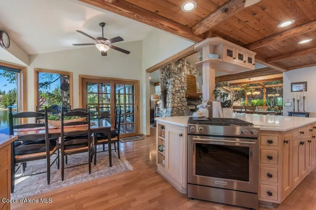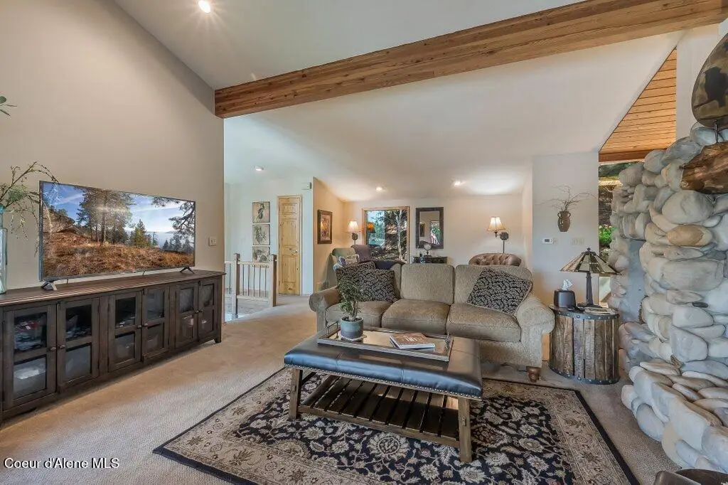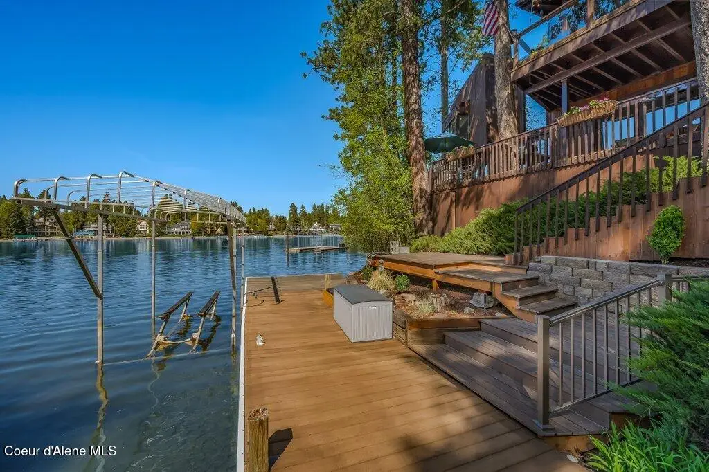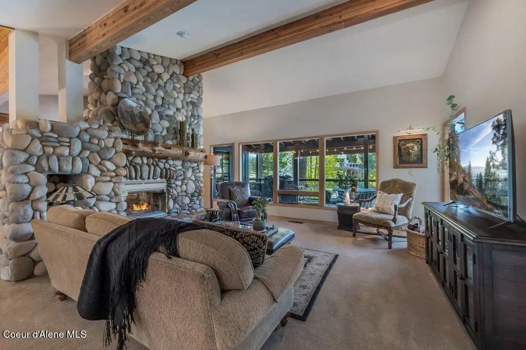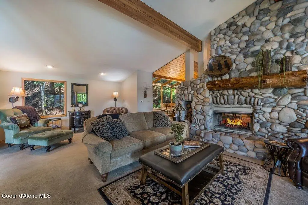 Experience waterfront luxury in this one-of-a-kind 4,449 sq. ft home on the highly desirable south side of the Spokane River. Set in a secluded, private neighborhood on 0.6 acres with 150 ft of prime riverfront, this custom built 3 bed 3.5 bath home offers breathtaking views, exceptional outdoor living and a warm lodge like ambiance with rich wood beams and river rock accents throughout. Inside, you'll find a thoughtfully designed layout featuring an open concept living area, soaring vaulted ceilings and expansive windows that flood the home with natural light. The fully upgraded kitchen boasts ample space for entertaining family and friends. The Master bedroom offers comfort & privacy with a spa inspired bathroom & large oversized custom closet. Large office with river views. Step outside to your own private riverfront Oasis complete with a large swim grotto style area, a private dock with boat lift & multiple outdoor living spaces for dining, relaxing & taking in the tranquil views