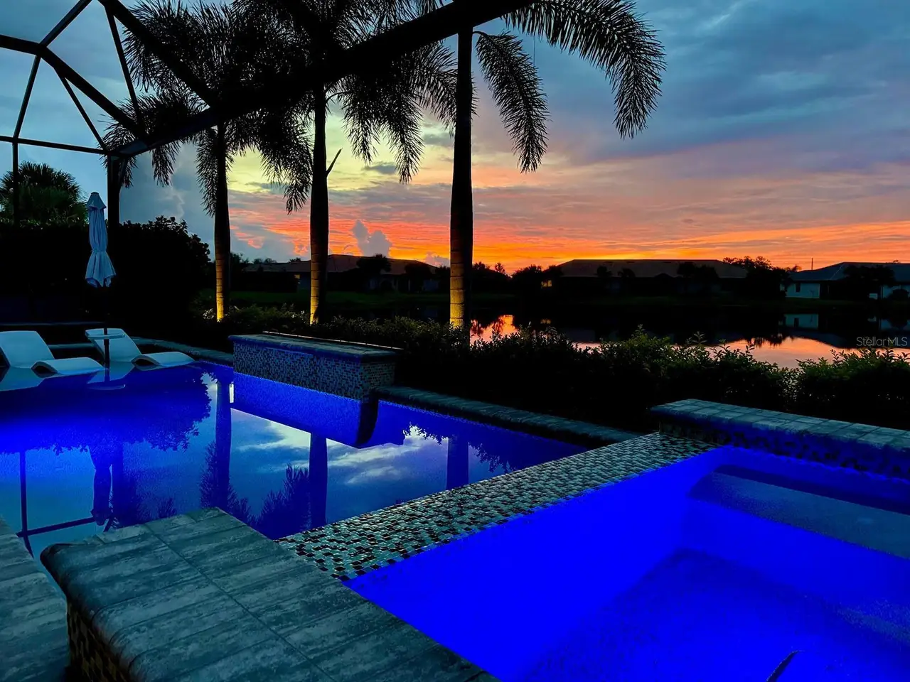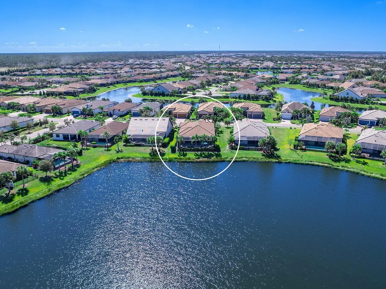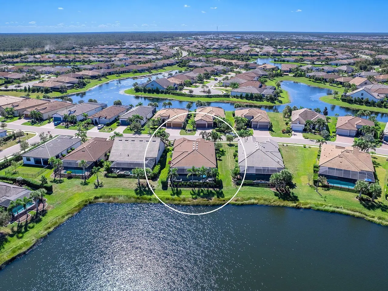 Filled to the brim with clever and beautiful upgrades, this fully FURNISHED home on a prime lakefront lot is the crowning jewel of Del Webb, Lakewood Ranch's premier 55+ active adult community. Starting with this spacious single level floor plan, the owners made numerous upgrades enhancing the beauty; and then expanded on those upgrades throughout 2022 to 2025 improving the form, function and appearance of this residence even more. From the moment you enter you will be greeted by upscale front landscaping with rocks and lights, large lake views, wood-look porcelain plank flooring throughout, an open floor plan ideal for entertaining and custom upgrades in every room that make this home truly one of a kind. The central great room boasts a 2023 feature wall with custom built-in cabinetry and under-lit floating shelves, a full porcelain wall with 85” TV, built in sound system, electric fireplace and solar skylights, plus coffered ceiling and wall of sliding glass doors to the lanai. The opulent formal dining room features a showstopping custom dry bar added in 2023 with granite counters, crackle glass display cabinets, and custom handpainted backsplash, plus 2023 crystal chandelier. The chef’s kitchen shines with 2023 Calacatta quartz island counter, 2023 crystal pendants, custom two-tone cabinetry with additional lit upper glass displays, walk-in pantry, and adjacent dinette. The stainless-steel appliance suite includes 2021 induction cooktop (pre-plumbed for future gas cooktop if desired), dishwasher, 2023 Advantium built-in microwave and wall oven, and refrigerator. Through the sliding glass doors, take in the gorgeous lake views from the 2021 paver lanai with summer kitchen, pool and motorized hurricane screens. Enjoy meals alfresco from the outdoor kitchen with stainless steel grill, dual-drawer bar fridge and side burner. Lounge by the lakeside in your custom 2021 pool with large sunshelf, raised spa, fire bar, water features and surrounded by panoramic screen enclosure with additional integrated sunshade for privacy on the east side. Inside the primary bedroom is your private oasis with sunset lake views, large walk-in closet with custom shelving and spa-like bathroom with oversized walk-in shower. Guests will cherish the two guest bedrooms and two full guest bathrooms outfitted with luxe upgrades. When you’re ready for privacy, retreat to the study with dual walls of desks and storage. Also included in this impeccable residence is a laundry room with 2023 floor-to-ceiling storage cabinetry and large folding counter, along with an expanded 3-car garage with its own air conditioner and workshop space. Enjoy premium peace of mind with a 2023 Kohler whole-house GENERATOR and 2023 whole-house storm power and roller shades. Additional upgrades include blackout window treatments, 2023 gas pool heater and salt cell and 2023 upgraded front landscaping. Offered fully FURNISHED, this residence is ready for you to move in right away! Del Webb is a premier 55+ active adult, gated community with extensive resort-style amenities and social activities including an expansive clubhouse, restaurant, fitness center with classes, resort-style pool, lap pool and spa, outdoor and events areas, dog park, tennis and pickleball courts, social clubs and events, full-time lifestyle director and more! Lakewood Ranch is the top multi-generational community in the country for seven years in a row with plentiful shopping, dining, parks and nearby beaches.