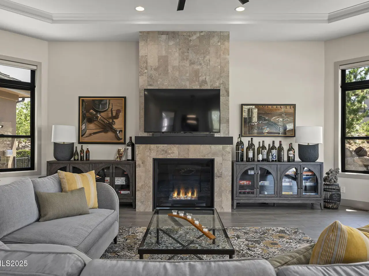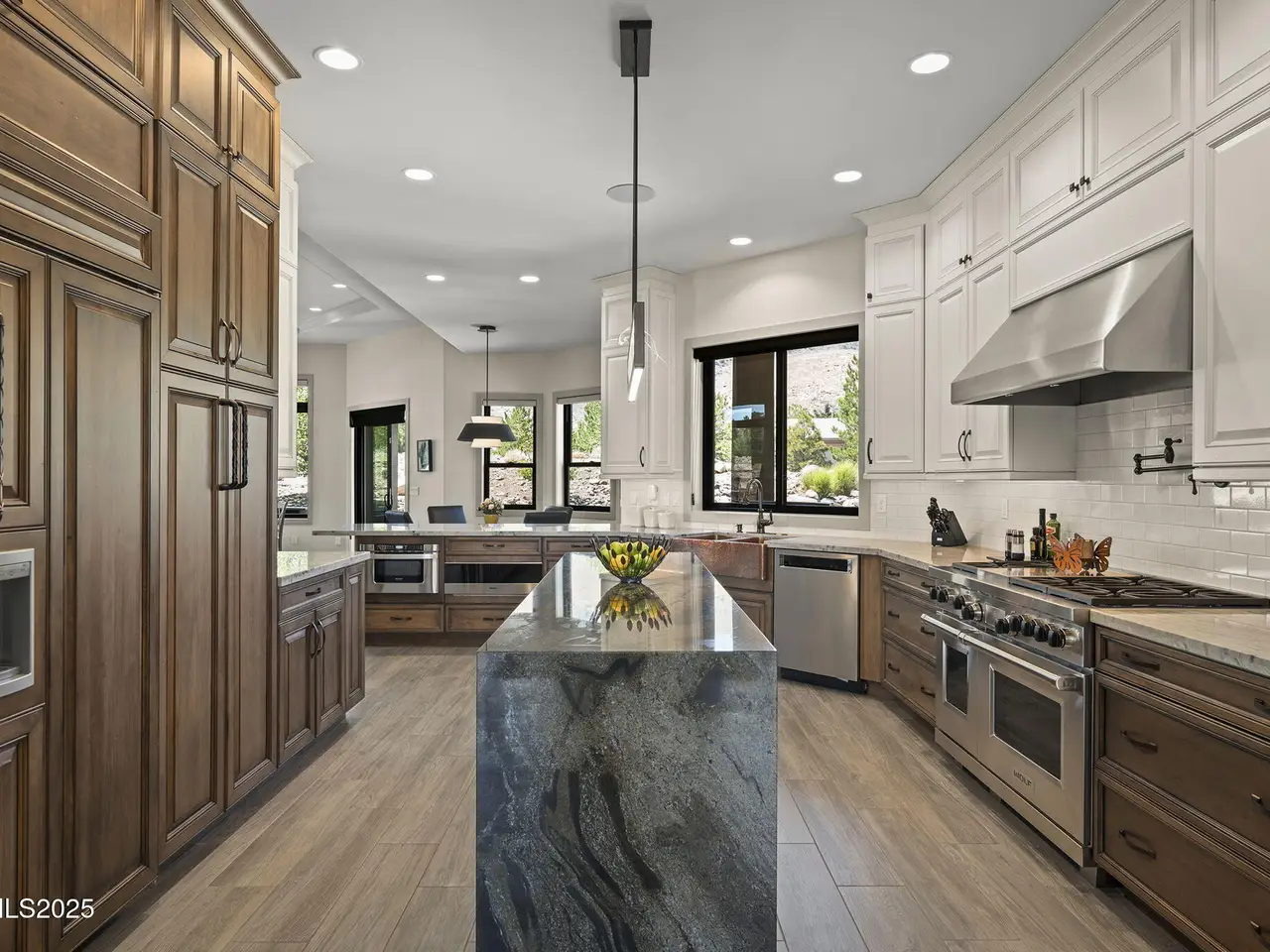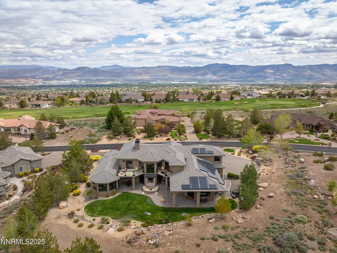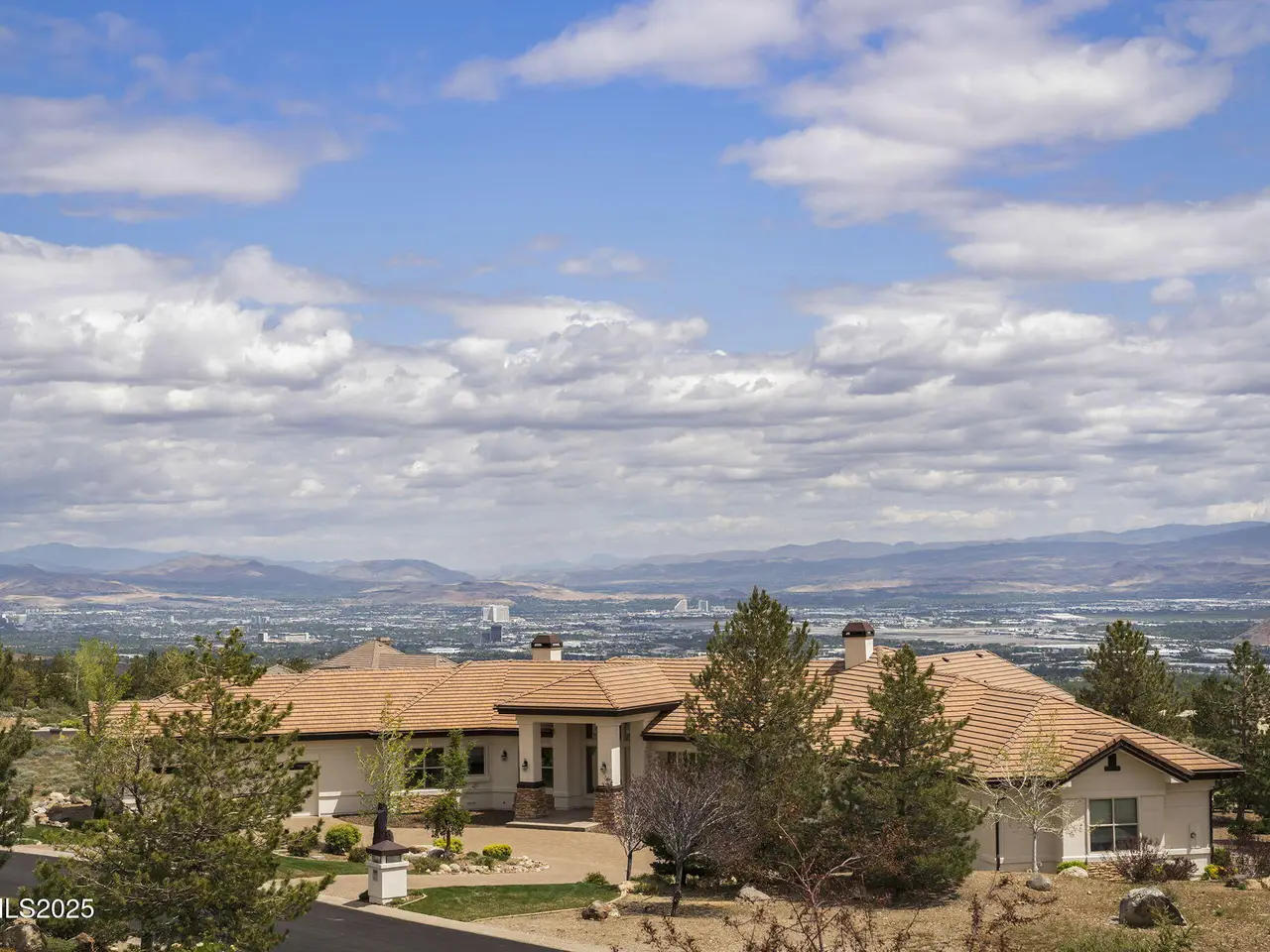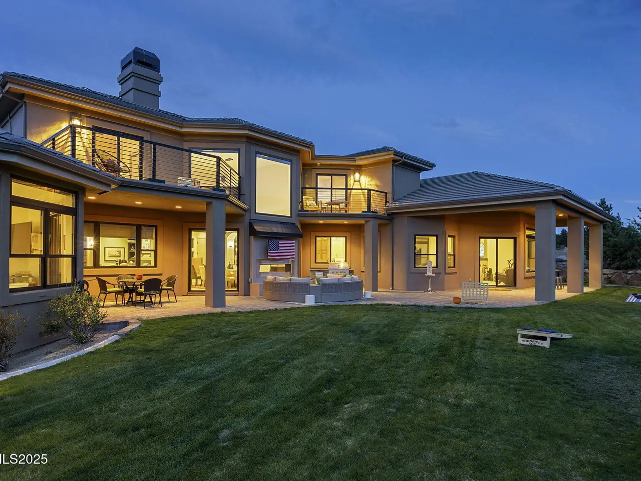 Step into 6177 North Featherstone, a residence reimagined from the ground up to embody the sophistication of design and the effortless grace of High Desert living. Nestled within the prestigious ArrowCreek community, this fully remodeled estate offers 5,586 square feet of inspired living on a full acre. With sweeping views across the Sierra Nevada and Mt. Rose mountains, lush golf fairways, and sparkling city lights, every angle of this home tells a story of elegance and connection to its surroundings. The owners began their remodel with purpose: to create a seamless flow, where form meets function and every detail enhances life, leisure, and entertaining. Walls were softened, pillars removed, and spaces reimagined to capture natural light and open sightlines. Modern finishes and thoughtful design balance grandeur with comfort. A finished basement and upstairs library added 312 square feet, expanding versatility without sacrificing intimacy. Arrival makes an unforgettable impression with a custom 9x6 steel pivot door by Modern Steel Doors of Arizona. Inside, a light-filled foyer leads to an expanded balcony, where sweeping golf course and city views set the stage for sunrise coffee or starlit evenings. At the heart of the home, the Dining Room has been elevated into a dramatic entertaining space with soaring two-story ceilings and a two-sided fireplace connecting indoors and outdoors. Andersen sliding doors open to patios and gardens, while striking Sonneman fixtures and art lighting create ambiance. Whether hosting holidays or intimate dinners, the space adapts with ease. The Main En Suite is a private retreat, complete with custom California Closets, cove lighting, and remote-controlled Hunter Douglas shades. The spa-inspired bath showcases a freestanding soaking tub beneath chandeliers, a dual-entry steam shower with rain head and sprayers, natural stone floors, shimmering glass tile, and custom cabinetry with quartz counters and lighted mirrors. The Great Room centers on a custom travertine fireplace with black quartz mantel, complemented by wood-grain tile floors, a Minka Aire fan, and integrated Sonos audio. The Kitchen and Nook feature a Wolf 48" range, Sub-Zero refrigerator, and a central island with seating. The Games Room delights with Hubbardton Forge lighting, speakers, and motorized shades. A dramatic staircase of black-stained oak and iron railings rises beneath a cascading Sonneman chandelier. Upstairs, the new Library offers custom bookcases, club seating, and a 12-foot Andersen glass wall opening to a balcony with panoramic views. Four additional en suite bedrooms provide privacy, storage, and character. Outdoors, multiple patios, a two-sided fireplace, and landscaped grounds enhanced with solar lighting create serene gathering spaces. Modern systems include central HVAC with three units, radiant heated floors, Tesla solar panels, Cat-6 wiring, Sonos audio, and a four-car garage with EV charger. This estate is more than a home—it is a lifestyle. From morning coffee on the balcony to wine in the library at dusk, from quiet family nights to grand celebrations, this residence harmonizes elegance, comfort, and versatility. Every space has been thoughtfully crafted, every view a reminder of Reno's beauty. This is a rare opportunity to own a fully realized vision of home, where luxury and ease coexist seamlessly.