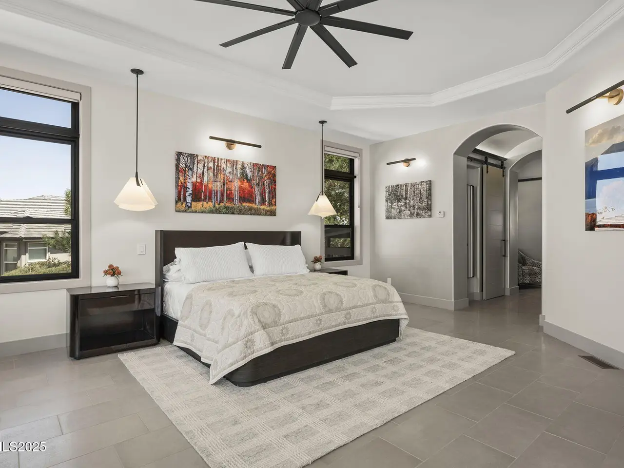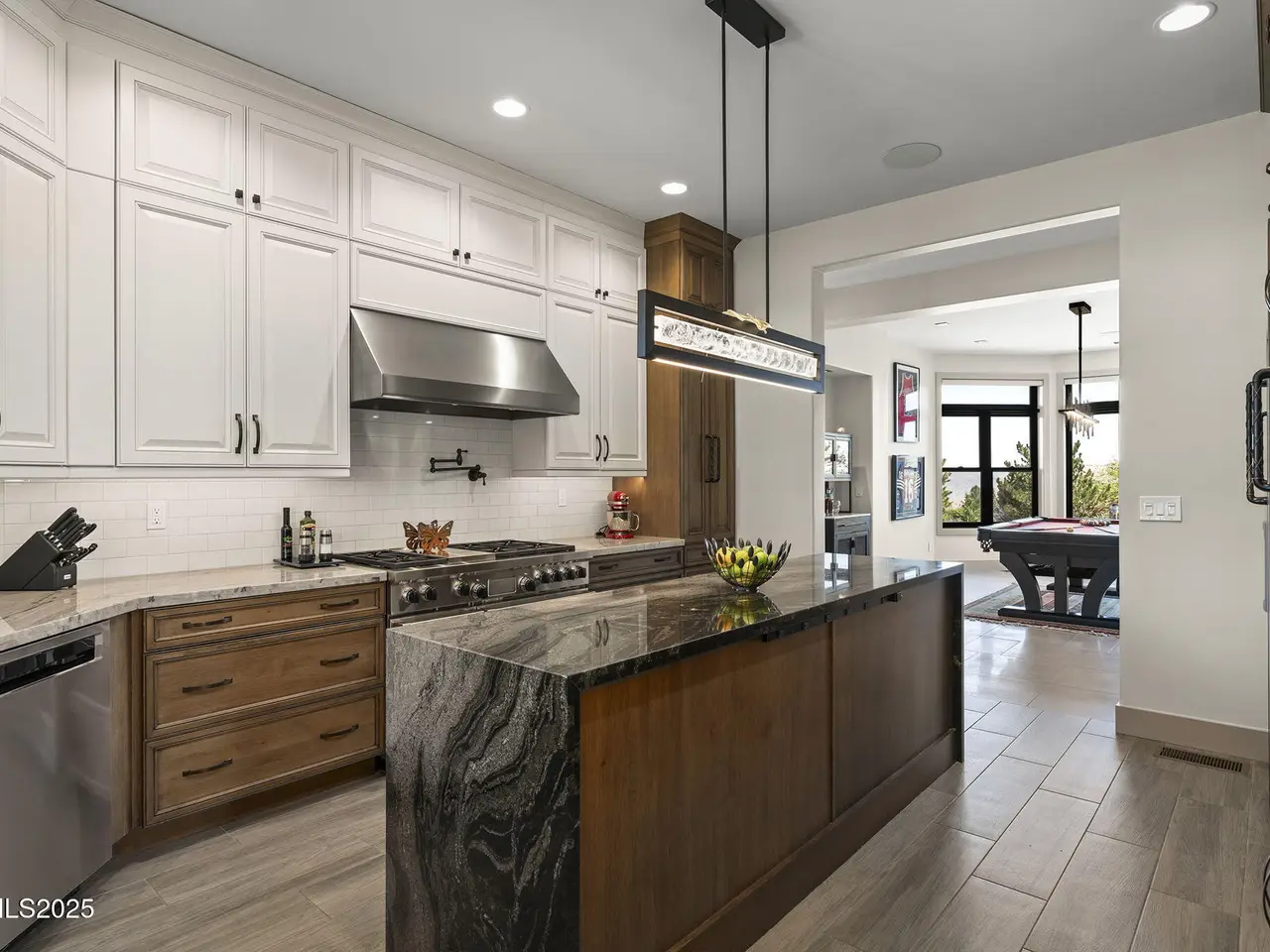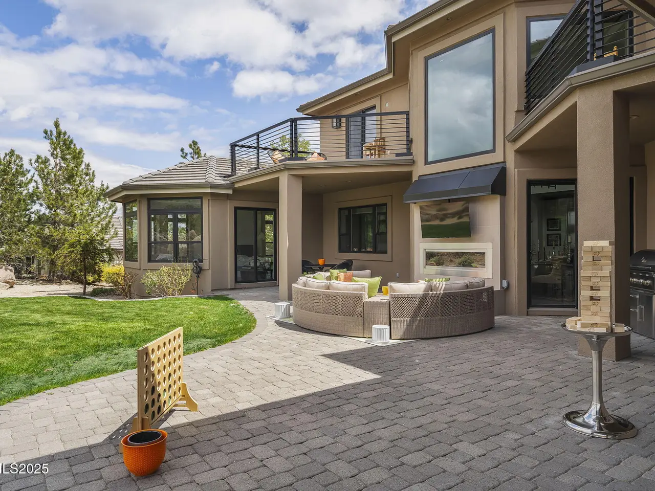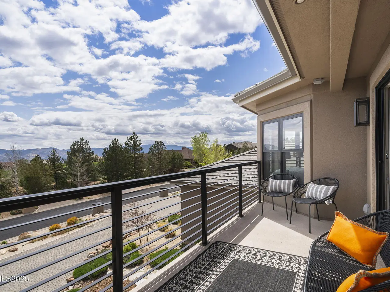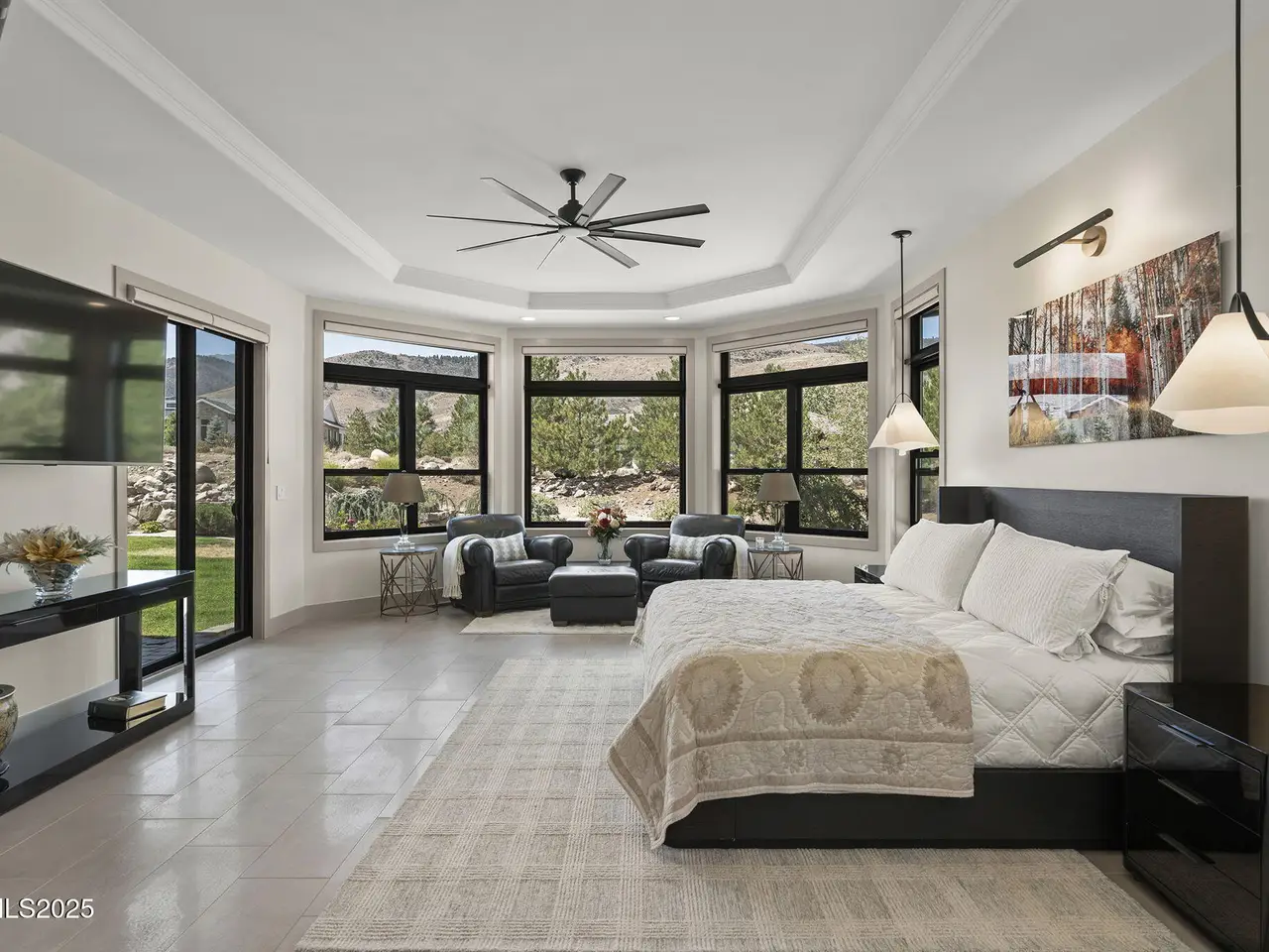 Step into 6177 North Featherstone, a residence reimagined from the ground up to embody the sophistication of design and the effortless grace of High Desert living. Nestled within the prestigious ArrowCreek community, this fully remodeled estate offers 5,586 square feet of inspired living on a full acre. With sweeping views across the Sierra Nevada and Mt. Rose mountains, lush golf fairways, and sparkling city lights, every angle of this home tells a story of elegance and connection to its surroundings. The owners began their remodel with purpose: to create a seamless flow, where form meets function and every detail enhances life, leisure, and entertaining. Walls were softened, pillars removed, and spaces reimagined to capture natural light and open sightlines. Modern finishes and thoughtful design balance grandeur with comfort. A finished basement and upstairs library added 312 square feet, expanding versatility without sacrificing intimacy. Arrival makes an unforgettable impression with a custom 9x6 steel pivot door by Modern Steel Doors of Arizona. Inside, a light-filled foyer leads to an expanded balcony, where sweeping golf course and city views set the stage for sunrise coffee or starlit evenings. At the heart of the home, the Dining Room has been elevated into a dramatic entertaining space with soaring two-story ceilings and a two-sided fireplace connecting indoors and outdoors. Andersen sliding doors open to patios and gardens, while striking Sonneman fixtures and art lighting create ambiance. Whether hosting holidays or intimate dinners, the space adapts with ease. The Main En Suite is a private retreat, complete with custom California Closets, cove lighting, and remote-controlled Hunter Douglas shades. The spa-inspired bath showcases a freestanding soaking tub beneath chandeliers, a dual-entry steam shower with rain head and sprayers, natural stone floors, shimmering glass tile, and custom cabinetry with quartz counters and lighted mirrors. The Great Room centers on a custom travertine fireplace with black quartz mantel, complemented by wood-grain tile floors, a Minka Aire fan, and integrated Sonos audio. The Kitchen and Nook feature a Wolf 48" range, Sub-Zero refrigerator, and a central island with seating. The Games Room delights with Hubbardton Forge lighting, speakers, and motorized shades. A dramatic staircase of black-stained oak and iron railings rises beneath a cascading Sonneman chandelier. Upstairs, the new Library offers custom bookcases, club seating, and a 12-foot Andersen glass wall opening to a balcony with panoramic views. Four additional en suite bedrooms provide privacy, storage, and character. Outdoors, multiple patios, a two-sided fireplace, and landscaped grounds enhanced with solar lighting create serene gathering spaces. Modern systems include central HVAC with three units, radiant heated floors, Tesla solar panels, Cat-6 wiring, Sonos audio, and a four-car garage with EV charger. This estate is more than a home—it is a lifestyle. From morning coffee on the balcony to wine in the library at dusk, from quiet family nights to grand celebrations, this residence harmonizes elegance, comfort, and versatility. Every space has been thoughtfully crafted, every view a reminder of Reno's beauty. This is a rare opportunity to own a fully realized vision of home, where luxury and ease coexist seamlessly.