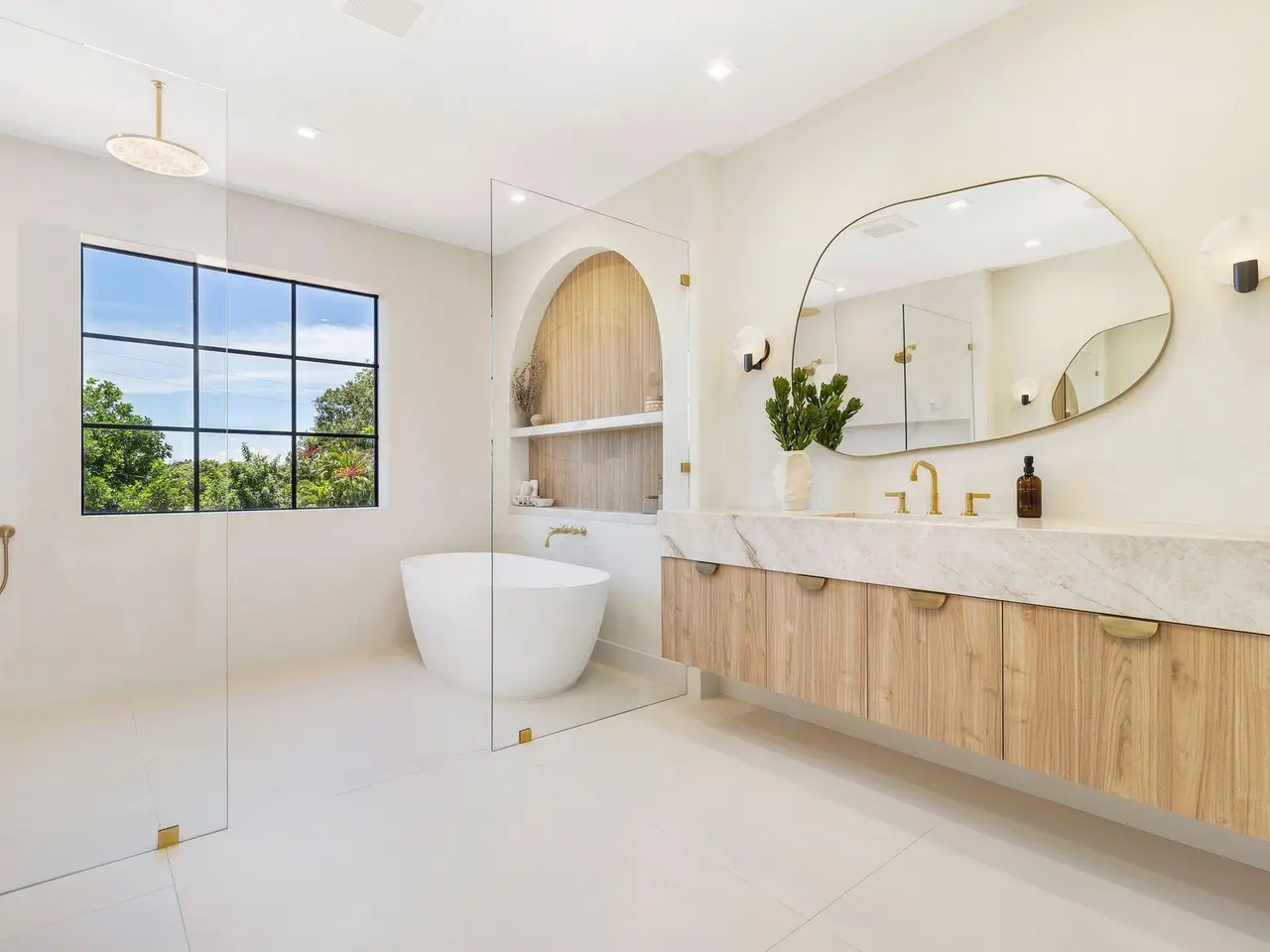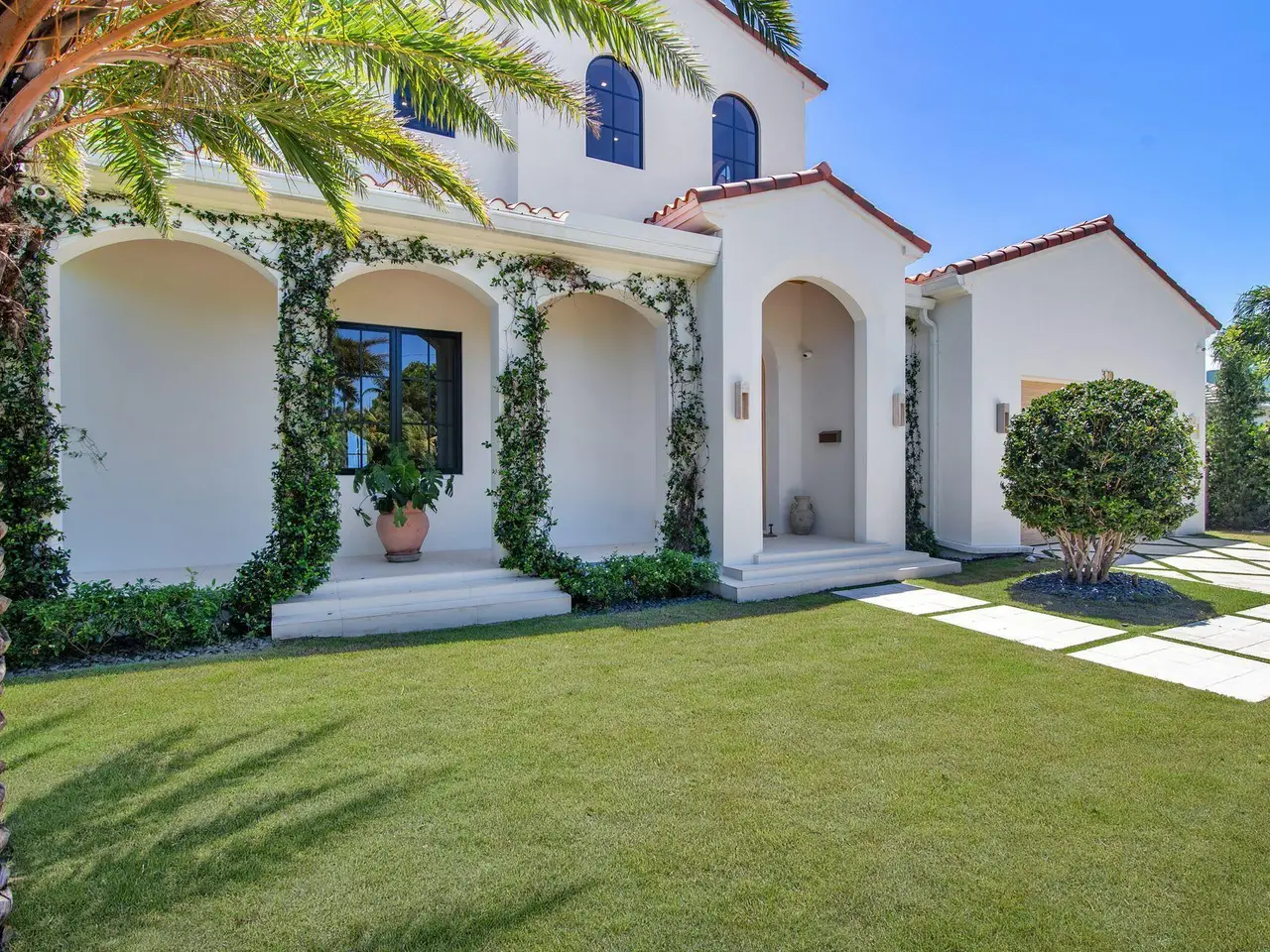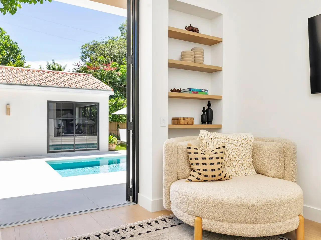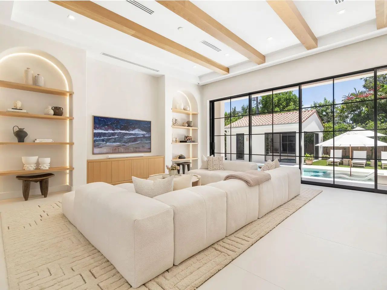 Uber-chic and effortlessly cool, this modern Mediterranean residence combines refined design with a warm, livable feel. Built in 2024 and offered fully furnished, the home features 4 bedrooms, 3 full baths, and 2 powder rooms -- completely turnkey and ready to enjoy. With 12' ceilings on the main level and a dramatic wall of 10' sliding glass doors, the interiors are open, airy, and designed for both everyday living and entertaining. The view from the custom front door carries straight through to the south-facing pool, where a Badu swim jet, covered loggia, summer kitchen, and gym/guest cabana create a true private retreat. Every element of the chef's kitchen has been thoughtfully considered, from the travertine countertops and backsplash to the custom pulls - this kitchen is dreamy!