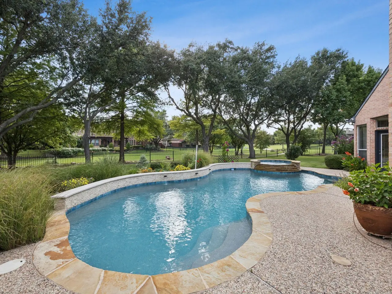 Rare East-Facing Gem in McKinney, TX - voted Best Place to Live in the U.S! Experience refined living in this custom masterpiece, gracefully situated on a large corner lot embraced by sweeping greenbelt views & tranquil ponds. Walls of windows frame a picture of serenity, while the setting offers both privacy & the vibrant active lifestyle of Stonebridge Ranch - with a highly rated Bennett Elementary just a short walk away. From the moment you arrive, stunning iron doors welcome you into a grand entryway where soaring ceilings & an open-concept design create the perfect stage for effortless entertaining. The chef’s kitchen is a showpiece, blending rich honey maple cabinetry with sleek granite countertops & premium appliances that will inspire culinary creations. The main level is a sanctuary of comfort & elegance. Retreat to the expansive primary suite, host guests in their own private suite, or work in style from the distinguished office with coffered ceilings. A versatile flex room with breathtaking pond views invites possibilities - from a game room to an intimate lounge. Gleaming hardwoods flow seamlessly throughout, adding warmth and timeless sophistication. Upstairs, the luxury continues with a spacious game or play area & three oversized bedrooms - each with hardwood floors, walk-in closets & bath access, ensuring comfort for all. Step outside to your own resort-style paradise. Multiple patios frame the sparkling pool & spa, where majestic trees & shimmering water create a backdrop of pure tranquility. Its the perfect setting to savor Texas sunsets & make lasting memories with family & friends. A rare combination of elegance & function, this residence also offers generous storage, expansive pantries & a side facing, three-car gated garage courtyard. With a subzero fridge, washer, dryer, TVs, state-of-the-art audio system & pool table included it's ready to move right in!