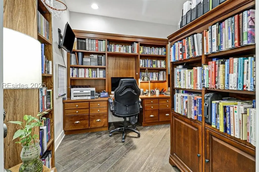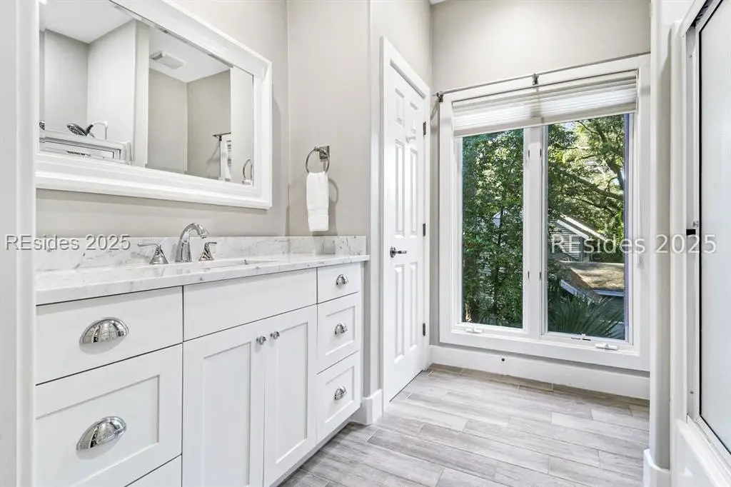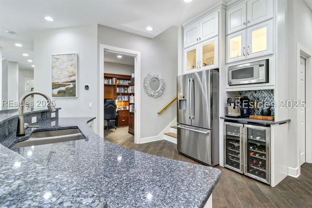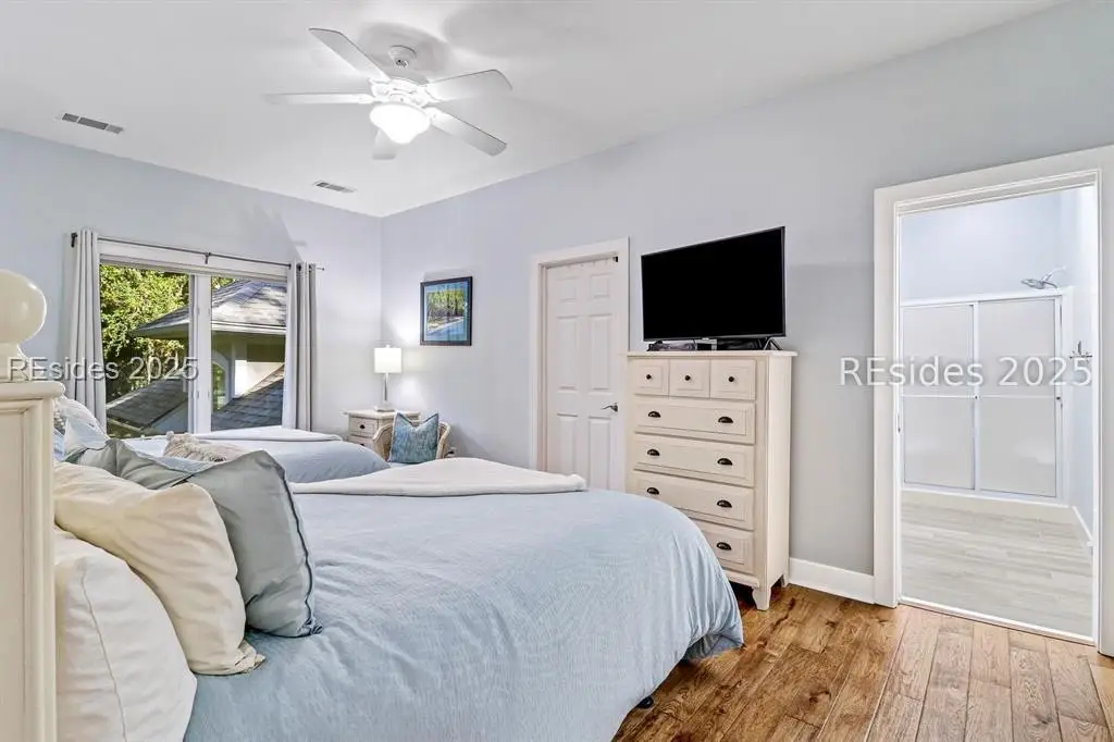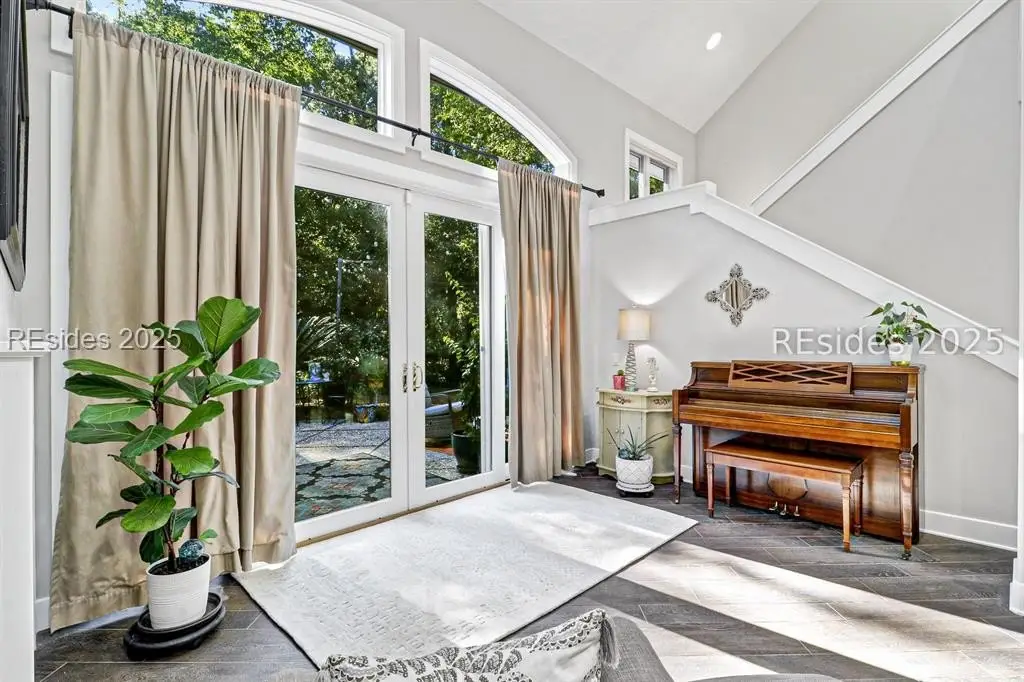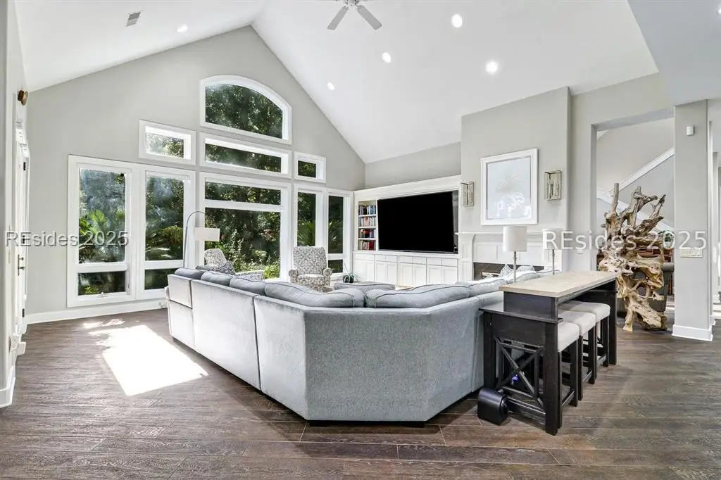 Only 300 yards from the sand, this Port Royal home ensures the Beach is part of your everyday life. The custom floor plan pairs coastal ease with modern design, set on an oversized (.86 acre) corner lot w a golf view. Inside, soaring ceilings and an open inviting layout create a light-filled gathering space with fireplace, dining, kitchen, beverage bar, and walk-in pantry. A welcoming front room with fireplace, primary suite, office, guest room & laundry complete the main level. Upstairs, a split design offers three more guest suites, including a bunk room retreat perfect for family & friends. Outdoors, enjoy lush gardens, open & covered patios designed by master gardeners. Living in Port Royal means access to private beach access, a beach house, lap pool, fire pits, leisure trails, pickleball, tennis, playground, community gardens, and 24-hour security in Hilton Heads only private oceanfront community with no short-term rentals. A warm & social setting.