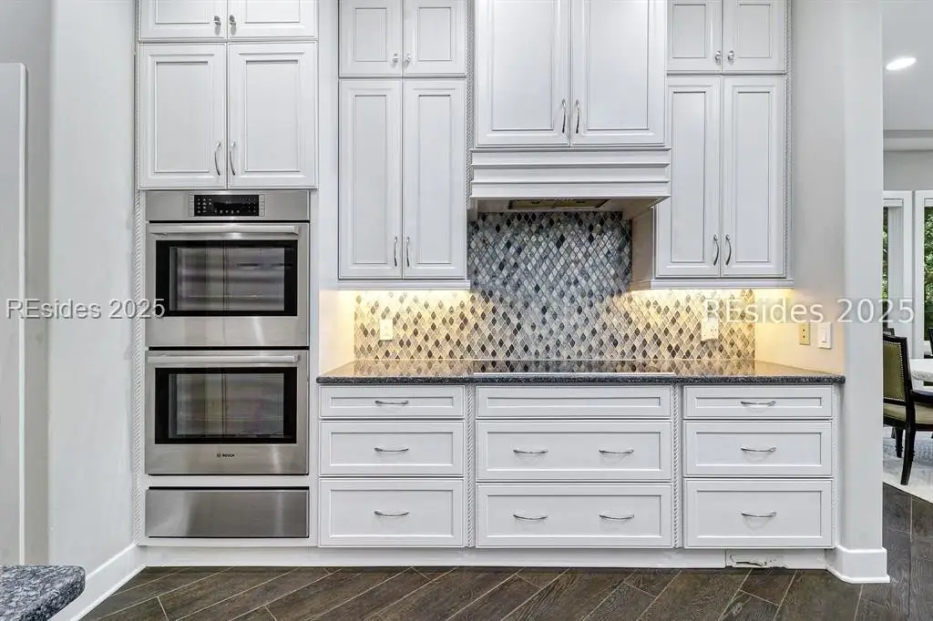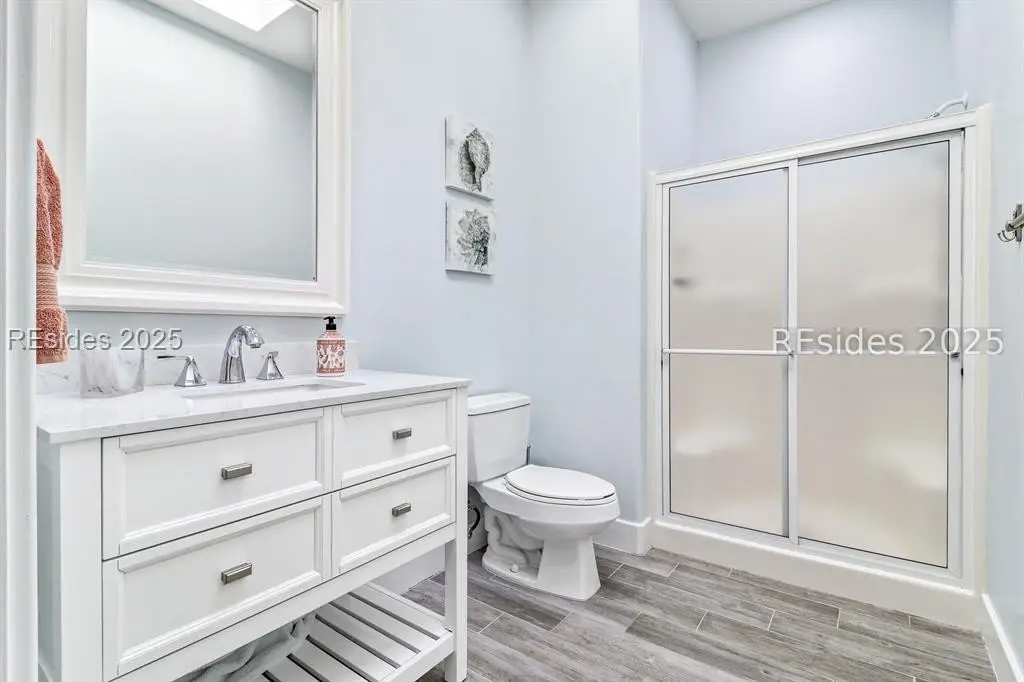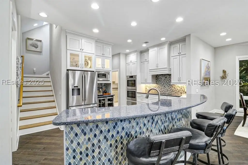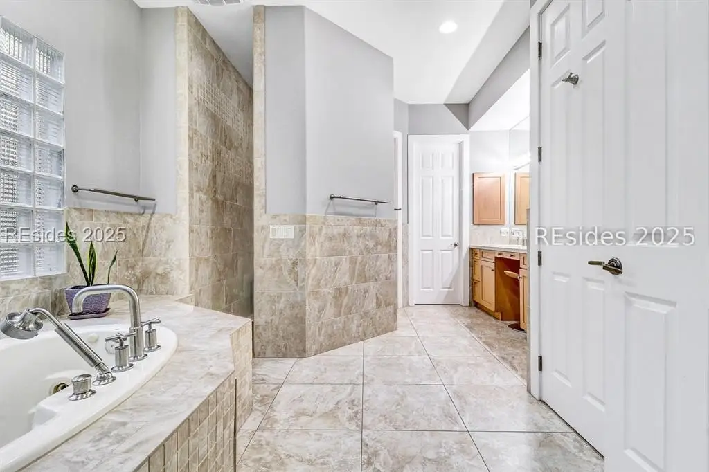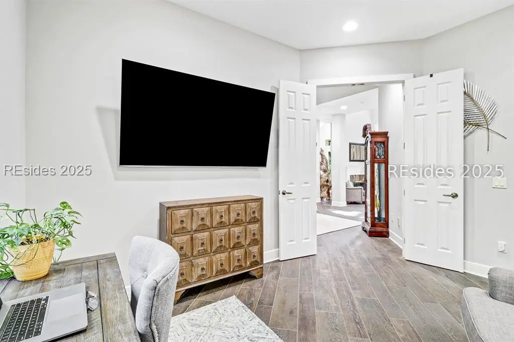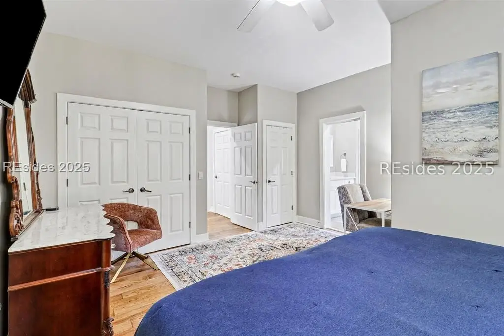 Only 300 yards from the sand, this Port Royal home ensures the Beach is part of your everyday life. The custom floor plan pairs coastal ease with modern design, set on an oversized (.86 acre) corner lot w a golf view. Inside, soaring ceilings and an open inviting layout create a light-filled gathering space with fireplace, dining, kitchen, beverage bar, and walk-in pantry. A welcoming front room with fireplace, primary suite, office, guest room & laundry complete the main level. Upstairs, a split design offers three more guest suites, including a bunk room retreat perfect for family & friends. Outdoors, enjoy lush gardens, open & covered patios designed by master gardeners. Living in Port Royal means access to private beach access, a beach house, lap pool, fire pits, leisure trails, pickleball, tennis, playground, community gardens, and 24-hour security in Hilton Heads only private oceanfront community with no short-term rentals. A warm & social setting.