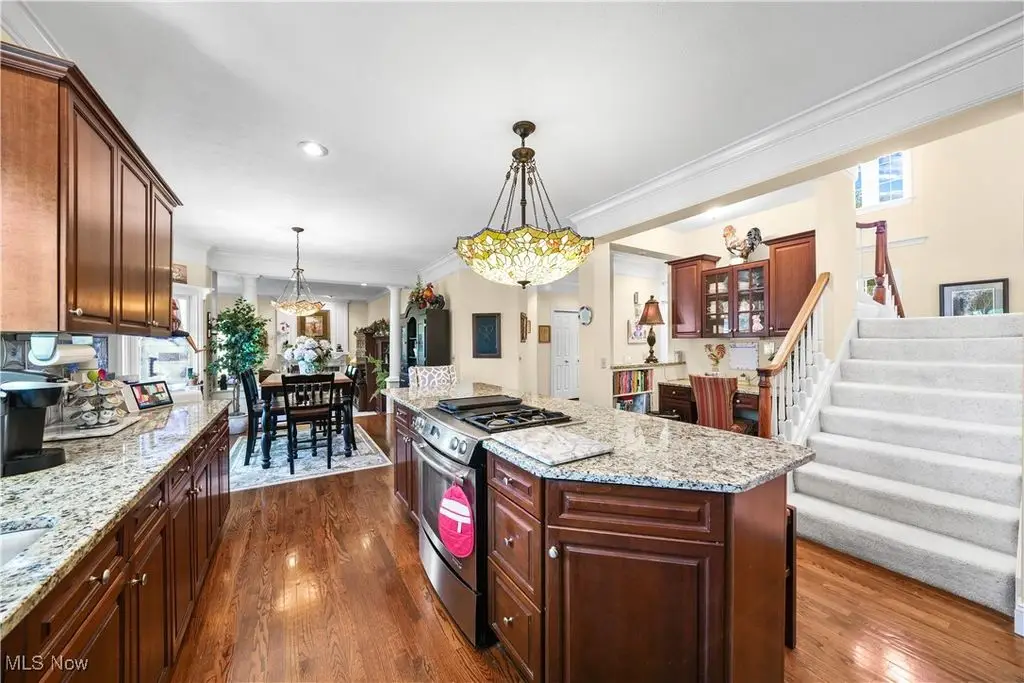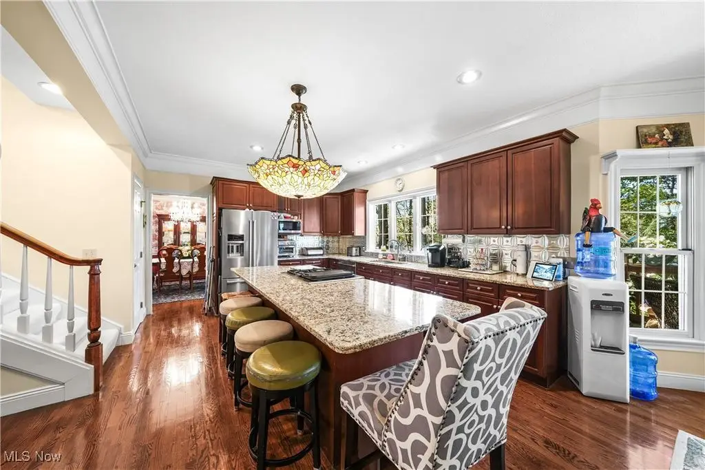 One of Hudson's Finest Custom Homes on Morning Song Lane is in one of the most sought-after neighborhoods, this exceptional custom-built home by Peter Paino blends quality craftsmanship with thoughtful design and luxury finishes. Just minutes from downtown shops, restaurants, parks, and award-winning schools, this home offers the perfect combination of convenience and privacy. Step inside to find a beautifully updated kitchen featuring granite countertops, stainless steel appliances, a walk-in pantry, breakfast bar, and rich hardwood floors. The casual bayed dining area opens to a large deck overlooking a private, wooded backyard-ideal for outdoor dining or morning coffee. The spacious family room features a fireplace with a custom mantle and French doors leading to an all-season sunroom filled with natural light from a wall of windows. The formal living room, adorned with custom molding, seamlessly flows into the elegant dining room, perfect for entertainment. A private library with built-in shelves offers a quiet retreat or home office space. Completing the first floor are a mudroom, powder room, and a well-appointed laundry room. Upstairs, the luxurious Owner's Suite includes a large walk-in closet, spa-like en-suite bath, and a private sitting area. Three additional bedrooms offer flexible living options-two share a Jack and Jill bath, while the third has its own private en-suite. The fabulous, finished walk-out lower level includes three recreation rooms, ideal for a media room, home gym, or guest suite, along with the home's fourth full bathroom. Additional highlights include: inviting brick exterior with front porch and professional landscaping, oversized 3-car garage, open foyer with dramatic split staircase, 9-foot ceilings on the main level, and serene wooded backyard for year-round enjoyment. This meticulously maintained home offers timeless style, generous living space, and an unbeatable location.