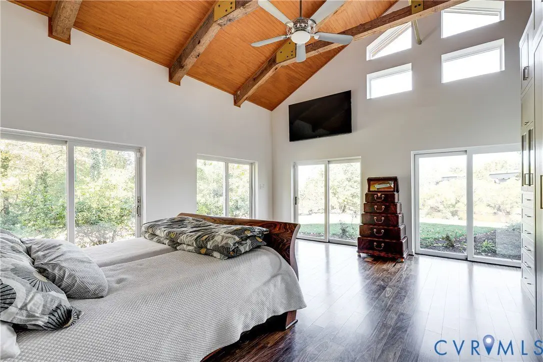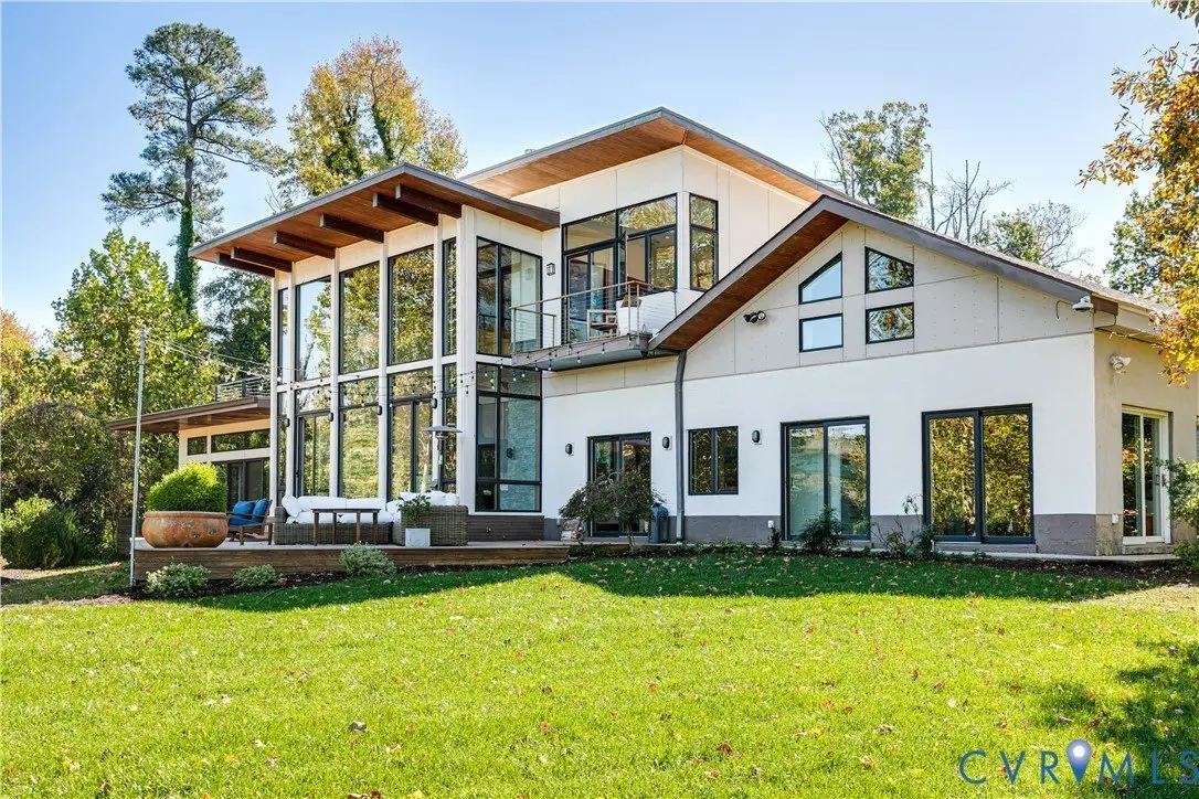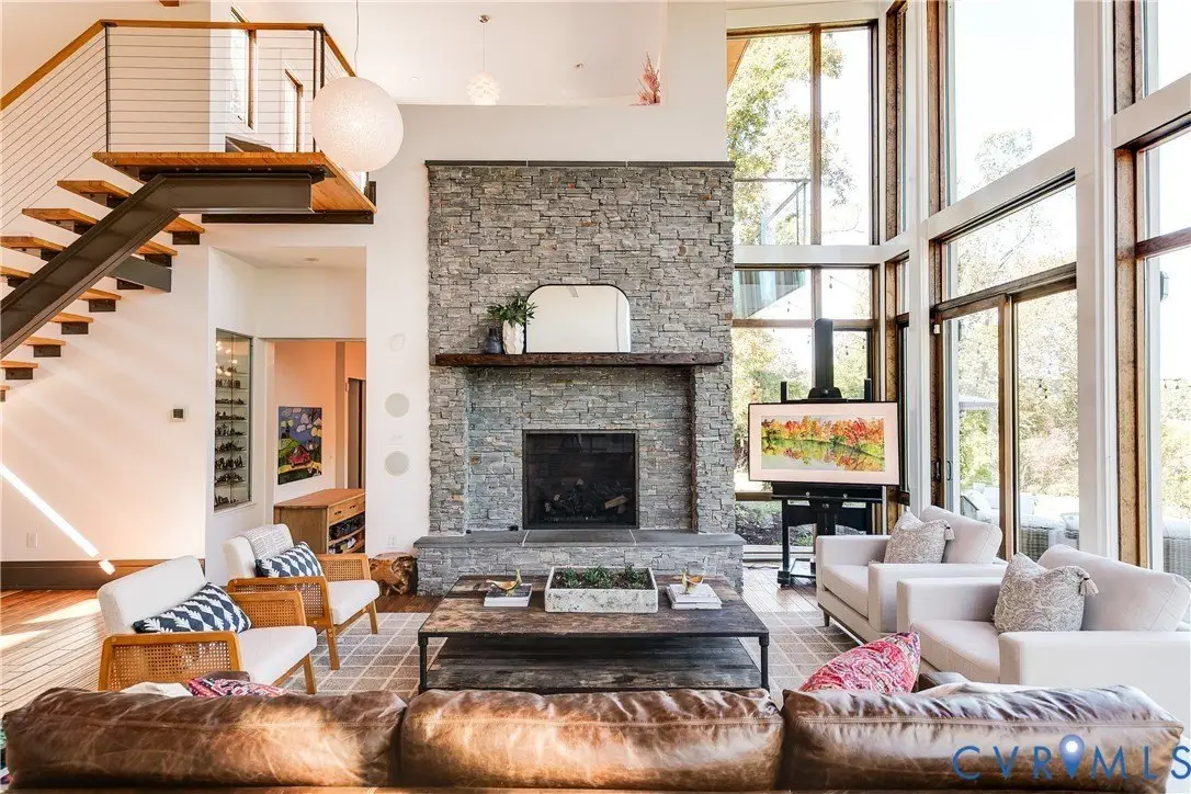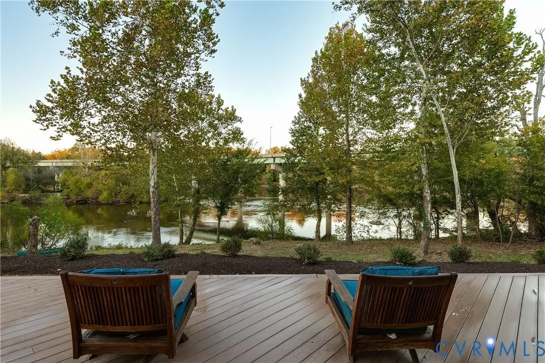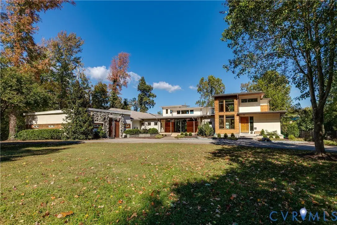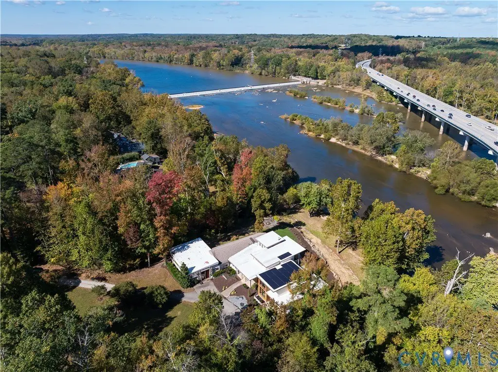 ""Extraordinary riverfront contemporary home with rare private access to the James River! This architectural gem blends dramatic design with comfortable living and stunning natural views. This home known as ""The Igloo House"""" was originally created by artist Demetrios Mavroudis and was masterfully reimagined with thoughtful additions and modern luxury while preserving its artful history. Walls of glass, vaulted ceilings with exposed beams, marble floors from the Federal Trade building, architectural details from the University of Richmond and open living spaces capture the light and the river from nearly every room. The chef's kitchen features SubZero and Wolf, quartz counters and an oversized island - perfect for entertaining. The spacious primary suite offers panoramic river views, spa bath with heated floors and exceptional custom cabinetry in the large walk-in closet. There is an additional en-suite bedroom/bath combo, 2 additional bedrooms with a hall bath to share, a 5th possible bedroom with a full bath and a large main floor laundry room. There are 2 additional versatile offices and studio spaces, which provide flexibility for modern living. The oversized former garage houses amazing storage, a huge workshop, an office and an incredible climbing wall gym with """"sprung"""" floor. This space could easily be repurposed to a parking garage again. Outdoor spaces include expansive decks and balconies, a koi pond, stone fire pit and direct access to the flatwater for kayaking and canoeing. Set on over 2 acres with landscaped gardens and spectacular sunsets over Bosher's Dam, this home is a one-of-a-kind Richmond landmark featured in RHome, Modern Home, and HGTV. Every stone, beam and piece of metal tells a story in this home. What began as a park ranger's home, then became an artist's studio and now stands as a deeply loved riverfront retreat for a family. It is now your turn to start your new lifestyle and write your next chapter in this exceptional and special place.""
