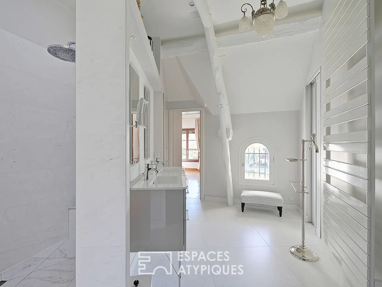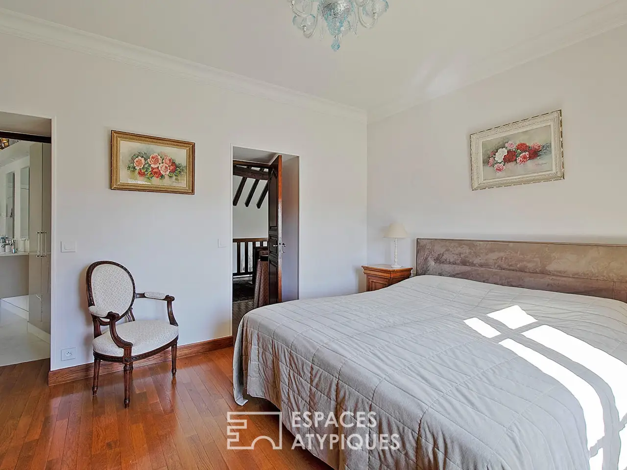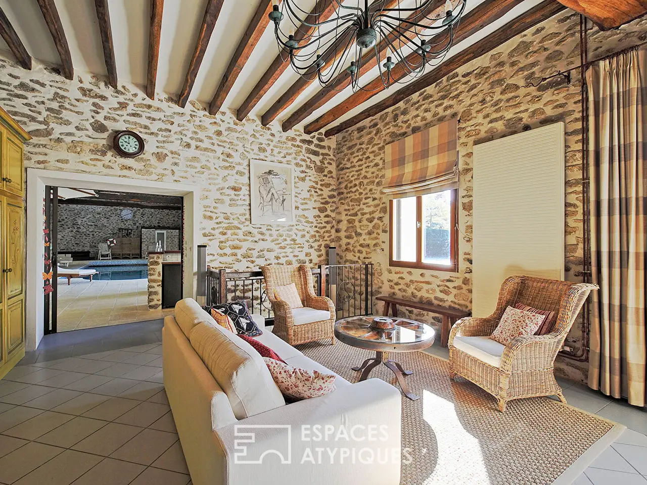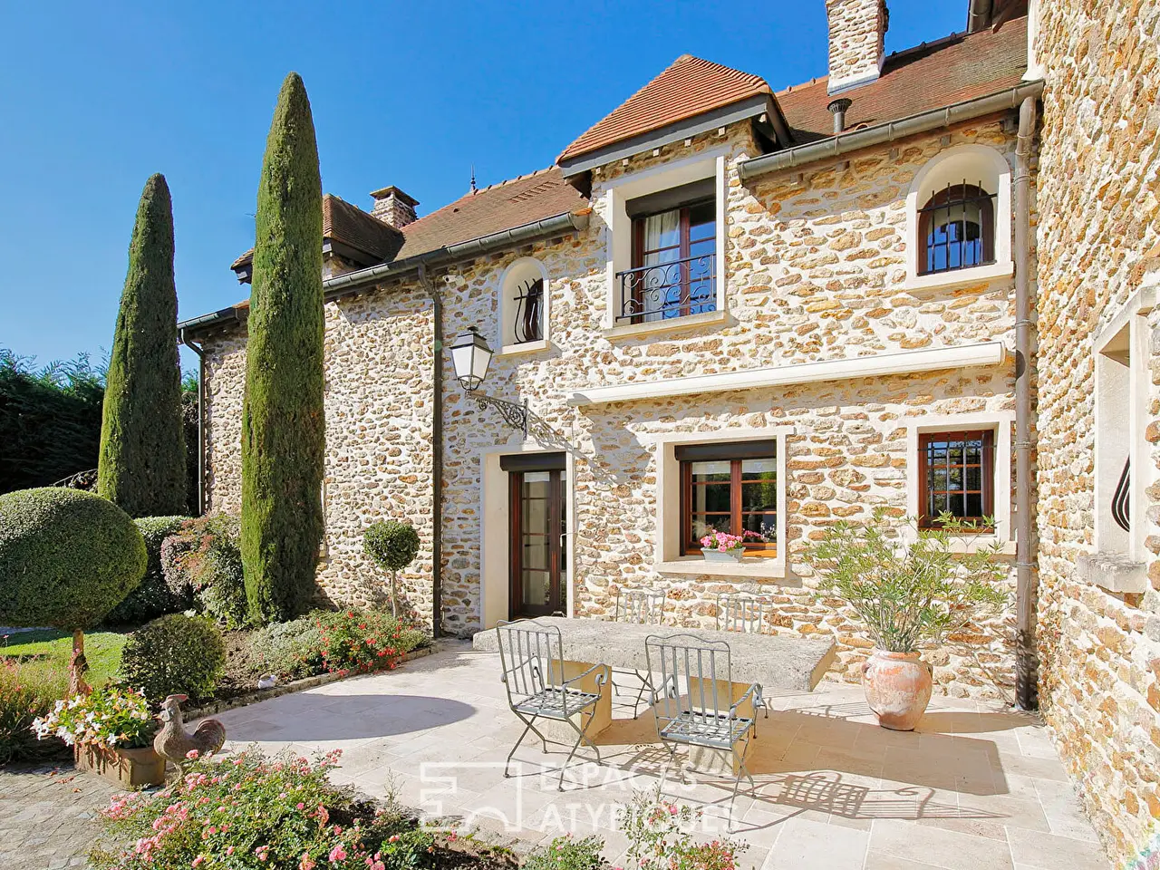 Domaine de prestige avec dependances, piscine et parc. Former 19th century farm, this property is now a superb stone estate typical of Brie, tastefully renovated with quality materials by the current owners. Built on nearly 1.5 hectares, it offers more than 1300m2 divided into living space and usable space. Once through the gate, you enter a special place, perfectly maintained, which delights the eye wherever it rests. The courtyard is dressed with paving stones, lampposts, Parisian benches and a pretty pond with a fountain which welcomes geese and ducks. Very landscaped, this space invites you to relax and serves the different houses of the property. The main house, with its little air of a manor, offers 267m2 of living space spread over two levels. A beautiful paved entrance with wall fountain and toilets leads to the vast living room with lounge and dining room with cathedral ceiling with exposed beams. There is a majestic fireplace and an Italian Sergio Leoni ceramic wood stove. On the left is the large, perfectly equipped kitchen, with a rotisserie fireplace, its light marble worktop, its custom-made cooking range and wooden cupboard. It opens onto the veranda which offers a very pleasant space for games, rest or convivial meals, and is extended by a fully equipped office-laundry room, the two spaces being separated by an openwork bucolic screen. A door leading outside serves as a 2nd entrance. In the middle of the living room, a solid wood staircase leads upstairs. Dressed in solid parquet flooring, it is composed of a large master bedroom with a marble bathroom and equipped with a double dressing room and a corridor which serves two other bedrooms with bathrooms and separate toilets. A small mezzanine lounge overlooking the living room completes this level. A second building used as a guest house of 201m2 is composed of: - On the ground floor, an entrance leading to the living room with dining room, a lounge with kitchen area, equipped with a wood stove, then a large bedroom with shower room and a second bedroom. - Upstairs, dressed in pink sand terracotta tiles, a corridor with landing serves four large bedrooms each with their own shower room with Italian showers and separate toilets. In the continuity of this building and accessible by another entrance is a renovated barn in exposed stone housing on the ground floor a reception room with a kitchen equipped with a cooking range and a large fireplace with a buried insert allowing you to enjoy the fires. A sliding glass door opens onto a huge room with an impressive cathedral ceiling covered with its framework housing a 10x5m bromine swimming pool, a jacuzzi, a sauna, a bar with beer tap, toilets and the technical room. A paved staircase leads to the beautiful wine cellar. The wooden one leads upstairs where a beautiful room now serves as a games room. A third building includes a secure garage with a workshop area, two offices and toilets and a large room with a cathedral ceiling upstairs that can be used as a reception or meeting room. In this same building but accessible by independent entrances are three duplex apartments of 55m2 and one of 70m2 whose rentals generated an income of more than EUR40,000 in 2023. The fourth building for commercial use is a stone shed of approximately 450m2 comprising a large room, the technical room housing the Viessmann heat pump, a workshop and upstairs accessible by a metal staircase a large dormitory and toilets and showers. Its roof is equipped with solar panels. The garden is home to an orchard with its stone-edged well and a garden at the back of the main house with several species including a generous weeping willow. This beautiful estate allows for many projects: events, guest rooms and cottages, hosting seminars, family reunions. It is also ideal for setting up a business, or simply as a large family home. Photos available after telephone interview. Main house: ENERGY CLASS: D / CLIMATE CLASS: C Amount of annual energy e