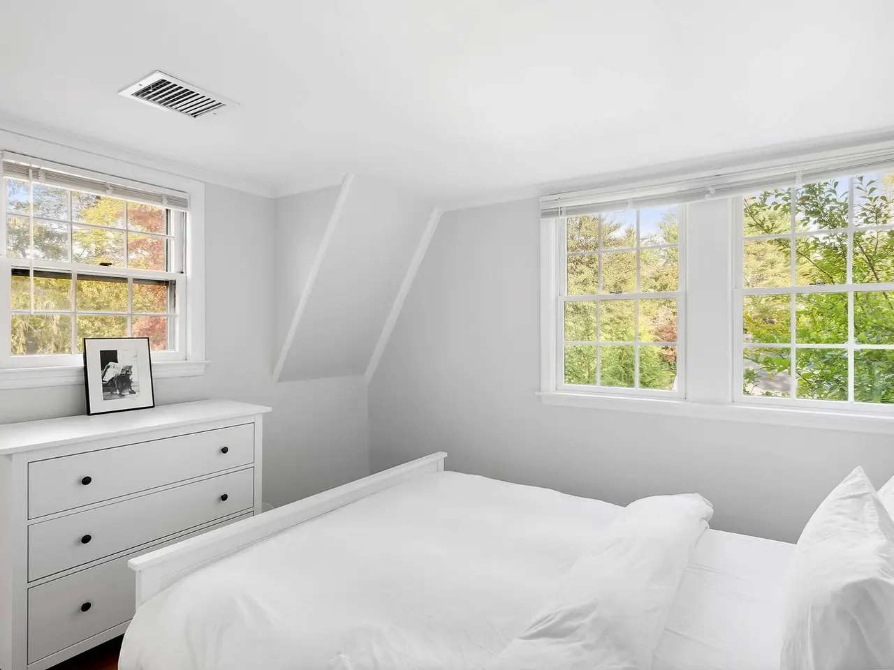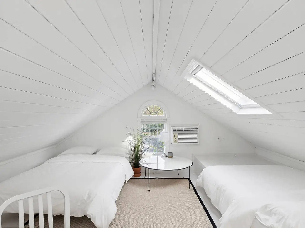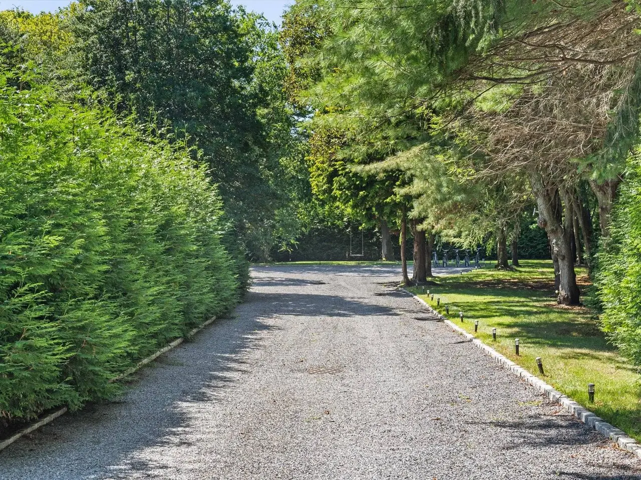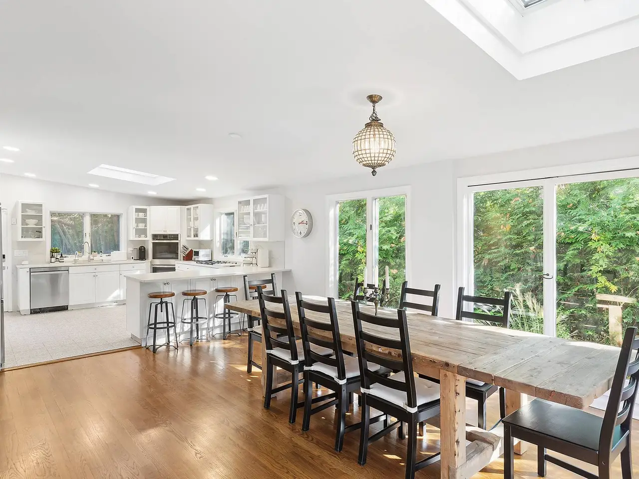 Nestled on a private road in the charming hamlet of Quiogue, this one-of-a-kind, fully furnished, turn-key residence features 4 bedrooms, 3 baths, a heated gunite saltwater pool, and a pool house optimally set on a picturesque park-like acre. The historic farmhouse home, originally built c.1900, underwent a brand-new renovation that blends modern amenities with classic charm. French doors, wall of glass sliders, and skylights provide an abundance of natural light throughout. The spacious all-glass living room with fireplace and the kitchen/dining areas open to a bluestone patio surrounded by a custom masonry enclosure, perfect for dining al fresco. Also on the first level is a guest bedroom, full bath, and laundry area. The second floor features the primary en suite and 2 guest bedrooms with an additional full bath. On the third level is a bonus room with an oversized closet and powder room. The property also includes a spacious pool house situated between the main house and the elegant old Hollywood-style oval pool. The interior, with a vaulted ceiling and exposed beams, features a fully equipped gym with Precor and Peloton equipment, and a convenient powder room. Additional amenities include an outdoor shower, custom circular masonry patio with a planting bed surrounding the pool, and an irrigation system. Lush, manicured grounds, with mature plantings, ensure privacy and tranquility in a prime location just a stone's throw from Westhampton Beach Village and magnificent ocean beaches.