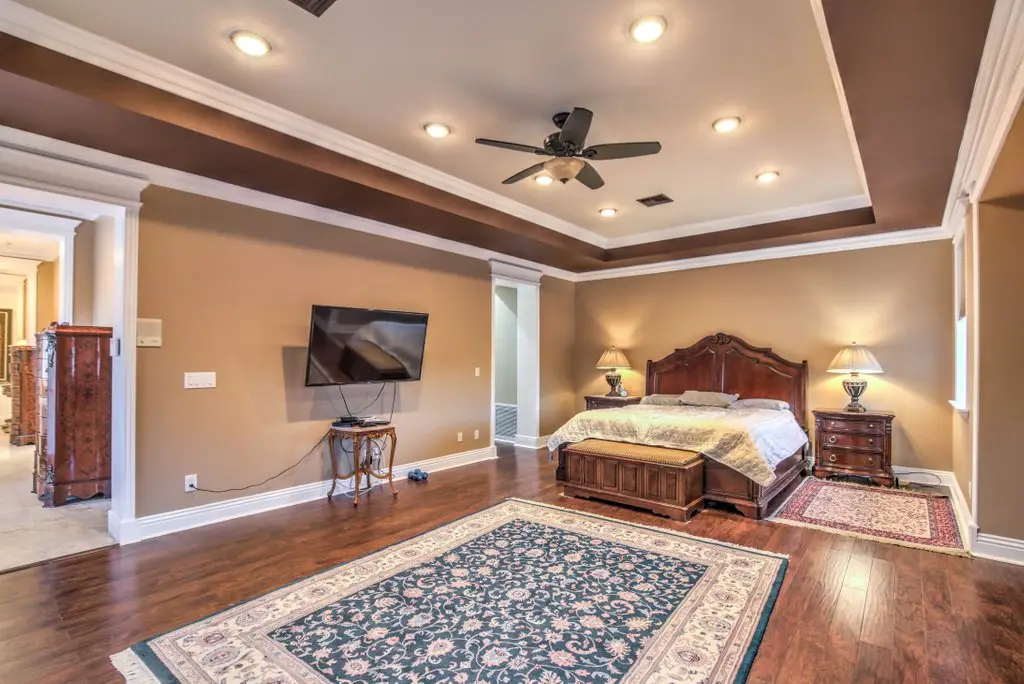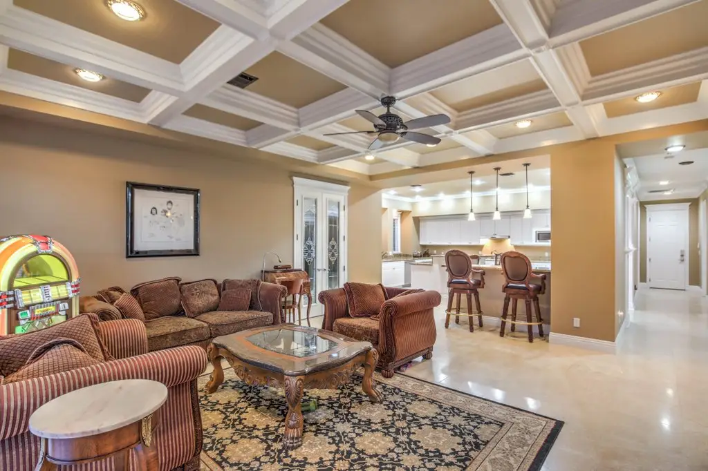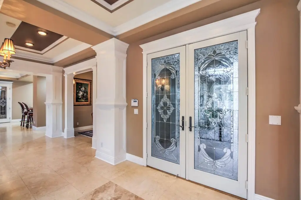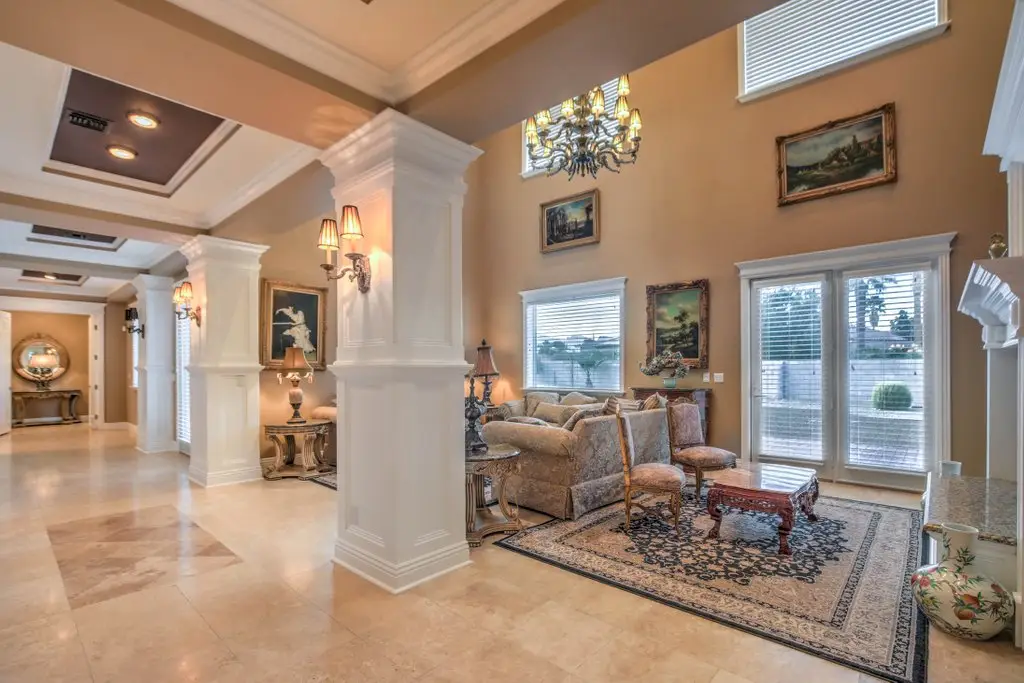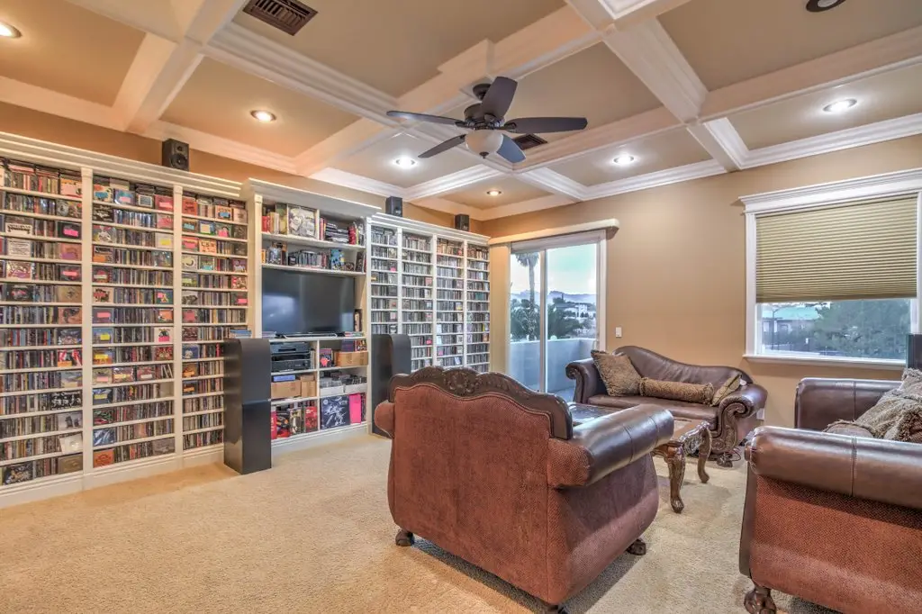 In beautiful Belcastro Estates lies this stately mansion, just shy of 6,000 square feet, situated between two larger homes on nearly half an acre. One of seven grand homes in this exclusive gated subdivision, this home is brimming with high-end millwork from master craftsmen. Highly upgraded by its current owners, it is ideally located between the world famous Las Vegas strip and Summerlin, and features: en suite living in each of its five oversized bedrooms, with a minimum 10-foot ceiling height in every room, downstairs primary suite with an immense three-headed shower, steam shower, large platform Jacuzzi, his and hers private commodes, two large walk-in closets and a spectacular fireplace, large formal dining room with detailed millwork, white gourmet entertainer’s kitchen with newer high end appliances with two refrigerator/freezers, large library which can hold thousands of books, CDs, DVDs, etc., and a massive landscaped backyard on timed sprinklers with multiple pool sites.
