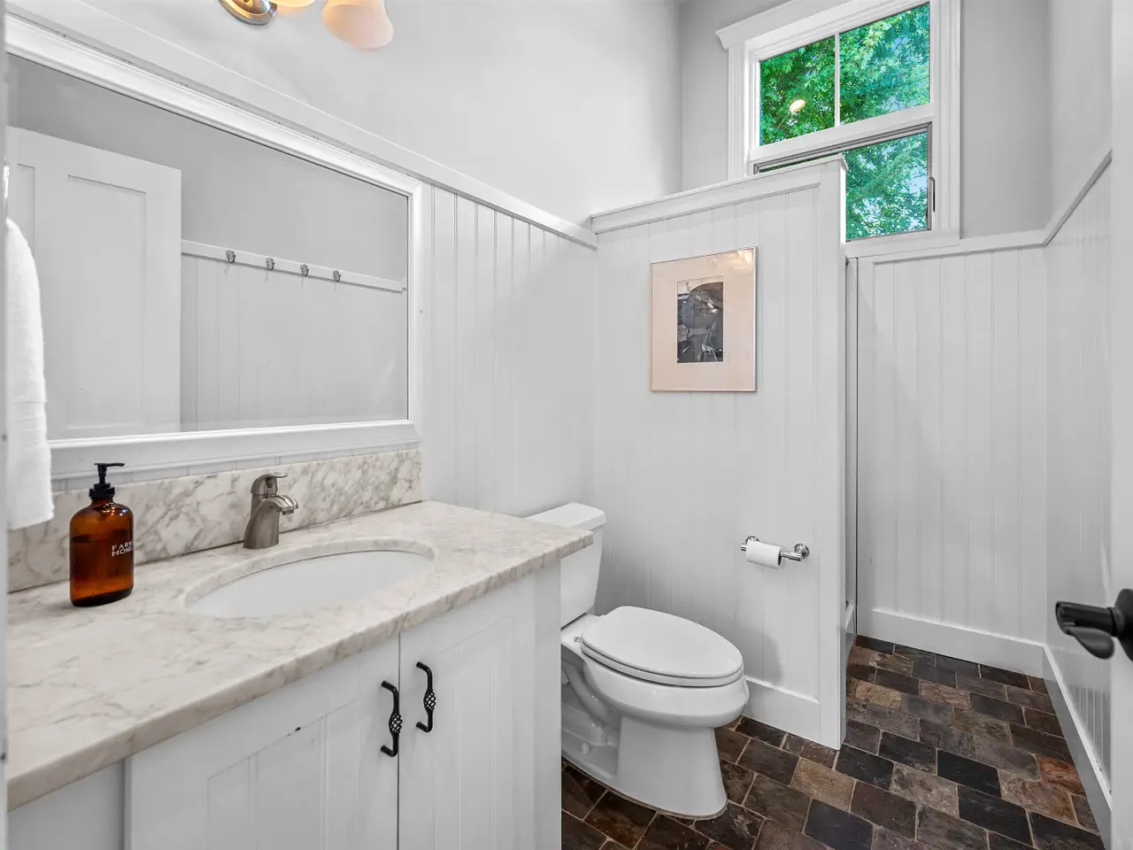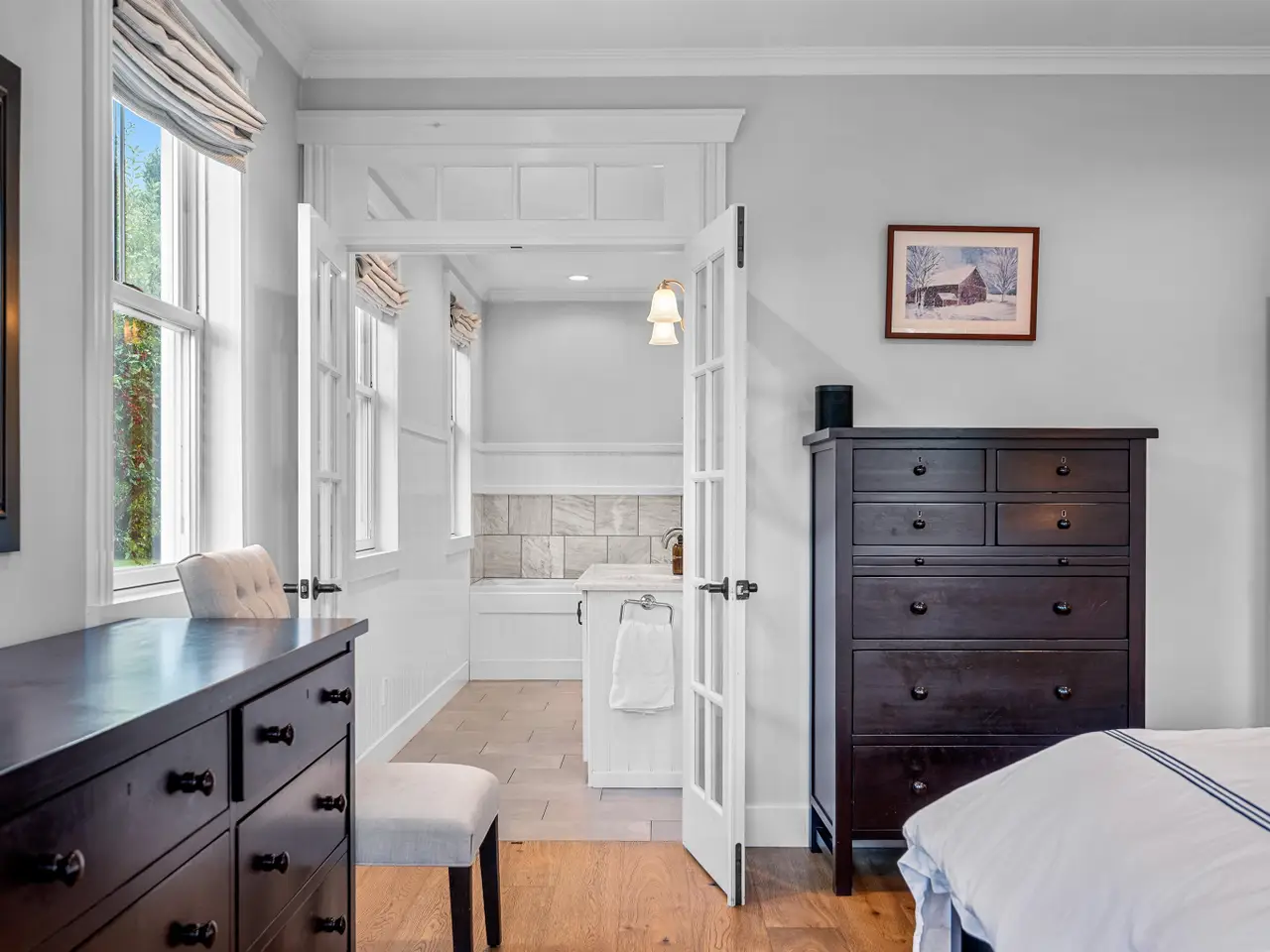 Situated above the Little River just south of Stowe Village, this beautifully updated 5-bedroom, 5-bathroom home is located in the Adams Mill neighborhood. An open floor plan welcomes you with abundant natural light, flowing seamlessly through the spacious living areas. The gourmet kitchen has been thoughtfully updated and features a Wolf range, custom cabinetry, wine fridge, and stunning white princess granite countertops perfect for entertaining or quiet evenings at home. The living room is centered around a cozy gas fireplace and offers multiple areas for gathering or relaxing. The first-floor primary suite features dual walk-in closets and a luxurious ensuite bathroom. Upstairs, four generously sized bedrooms offer custom window treatments along with two beautifully appointed full bathrooms. Above the two-car garage, a large bonus room bathed in natural light serves as an ideal media room, guest overflow space, or a family retreat complete with its own bathroom with a shower. Step outside to a patio with stonework designed by Ambler Design, featuring a BBQ area and a hot tub perfect for enjoying Stowe's stunning seasons. The Adams Mill neighborhood offers privacy and a warm sense of community. With quick access to Route 100, I-89, the village, local schools and Stowe Mtn. resort, you're never far from everything Stowe has to offer. The neighborhood features a community pond and over 20 acres of shared woodlands bordered by Land Trust trails.