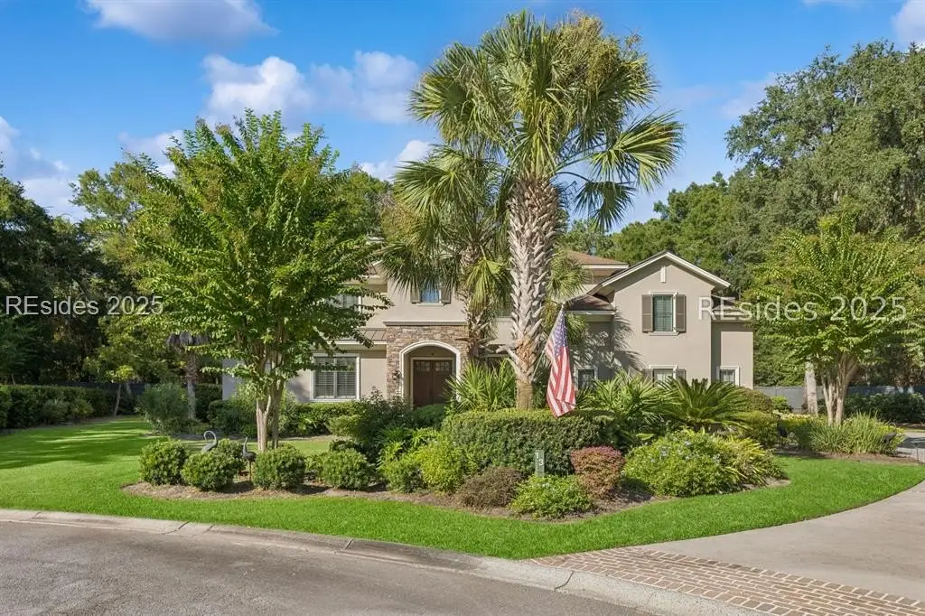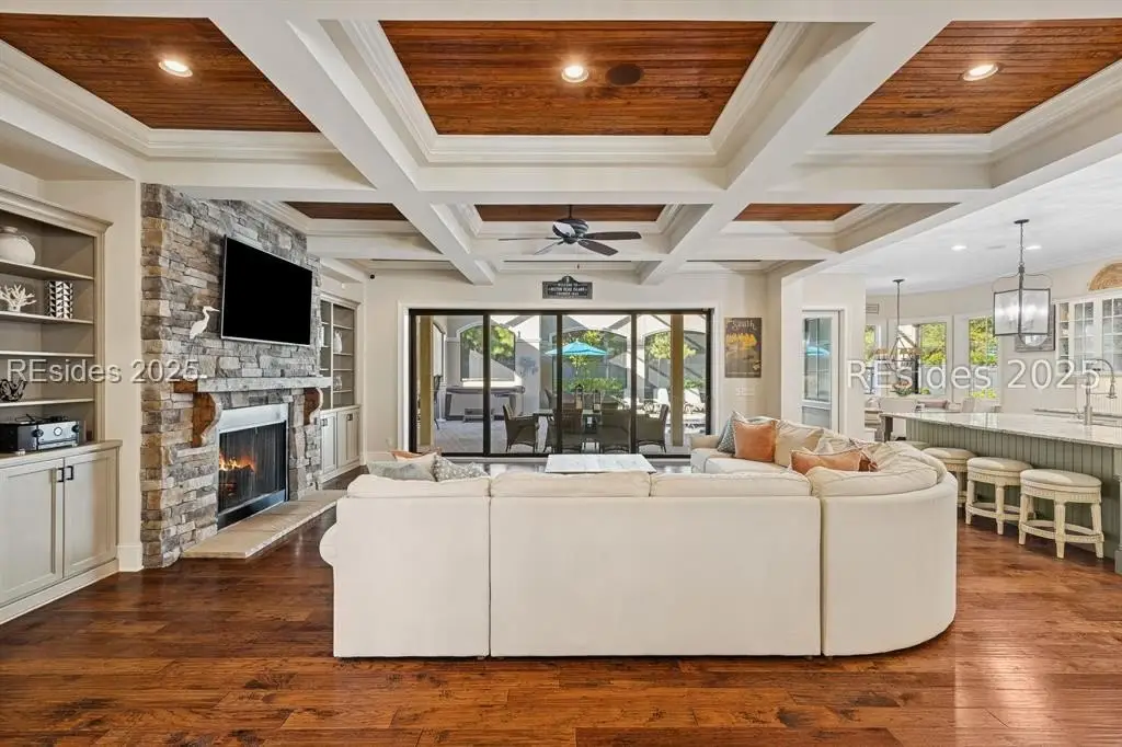 Exceptional custom home in Broad Pointe at Indigo Run offering an unparalleled indoor-outdoor living experience. Designed with a thoughtful layout, open floorplan and higher ceilings throughout, this nearly new home has been sparingly used as a second residence and is in pristine, move-in-ready condition. The heart of the home is the gourmet kitchen featuring a 6-burner gas cooktop, large island with seating, stainless farm and prep sinks, separate beverage fridge, plus a charming breakfast nook and butlers pantry with built-in cabinetry, wine cooler, and additional beverage fridge. The Great Room boasts a coffered, wood-inlay ceiling and striking stacked stone fireplace, and is open to the kitchen and dining room, creating a warm and inviting space for everyday living and entertaining. A first-floor guest bedroom with adjoining full bath offers direct access to the lanai and pool area. Additional functional spaces on the main level include a drop zone with built-in cubbies, 2-car garage, and outdoor shower. The screened lanai is enhanced by architectural walls with pavers surrounding a gorgeous pool, separate saltwater hot tub, and covered outdoor living area complete with a stacked stone fireplace, built-in grill, sink, beverage fridge, bar and dining area - perfect for entertaining or relaxing in privacy. Upstairs, the spacious primary suite includes a large walk-in closet and a luxurious bath with oversized shower featuring multiple shower heads. Two additional guest bedrooms (one with an ensuite bath) also offer walk-in closets. A large bonus room features custom built-in sleeping areas and storage drawers. The second floor also offers a full-size laundry room with sink and ample storage. Located on a private 0.7-acre cul-de-sac lot, this home provides purposeful privacy and the feel of an exclusive resort. Broad Pointe residents enjoy access to a private community pool, dock, and kayak storage, with optional membership to The Golf Club at Indigo Run or social membership. This à la carte-style membership has made this last and final development on Hilton Head one of the most sought-after communities on the Island. Just 7 minutes to shopping, dining, and Hilton Heads town-owned beach parks, this home perfectly balances luxury, convenience, and lifestyle.