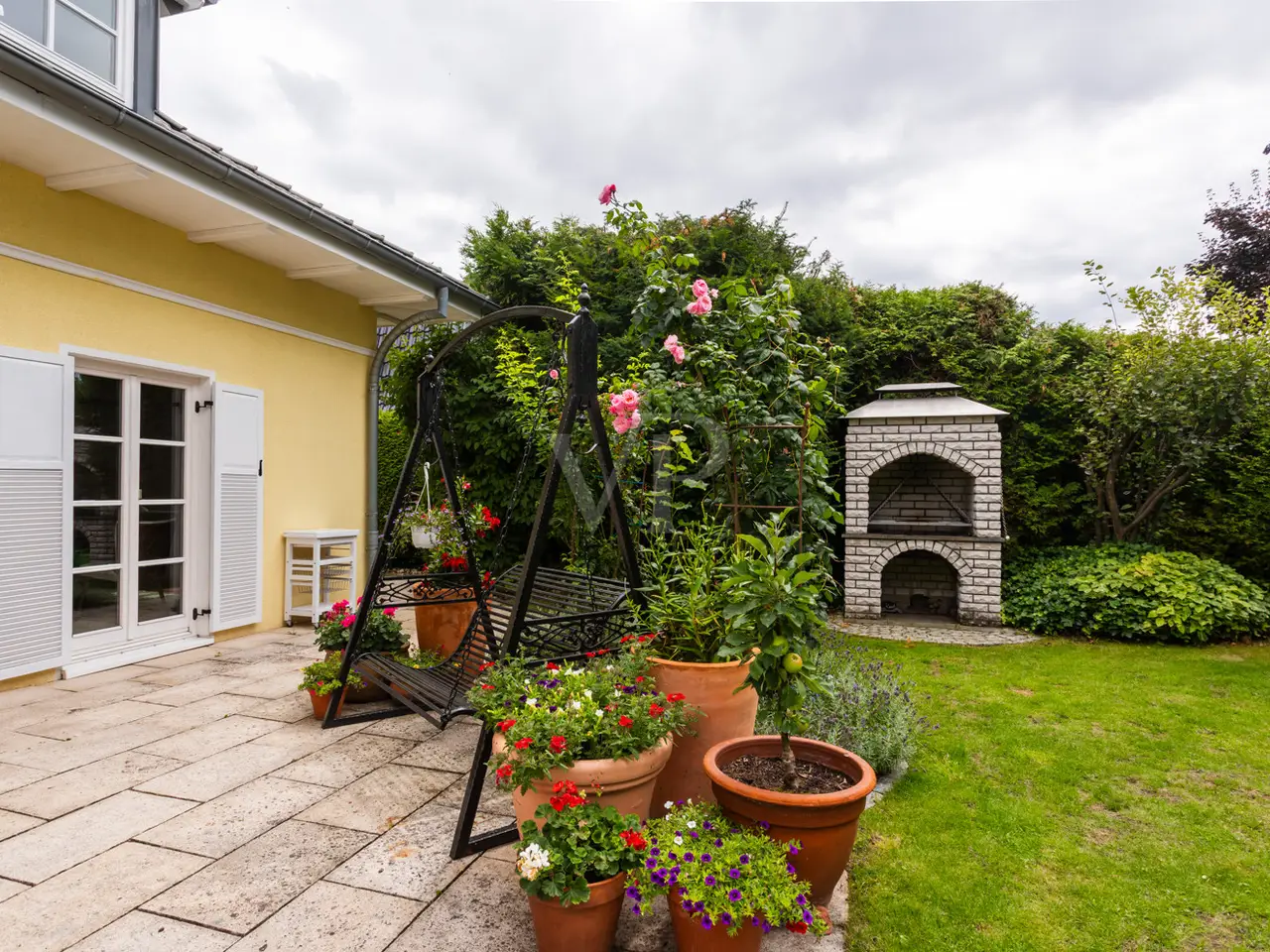 Well-tended garden with brick-built barbecue