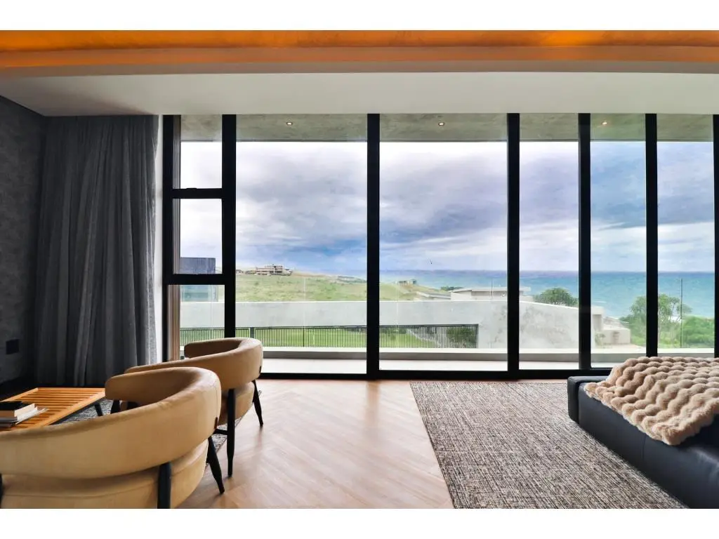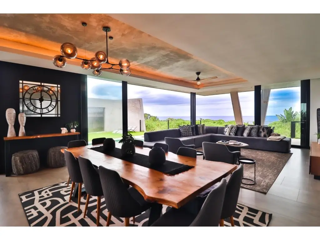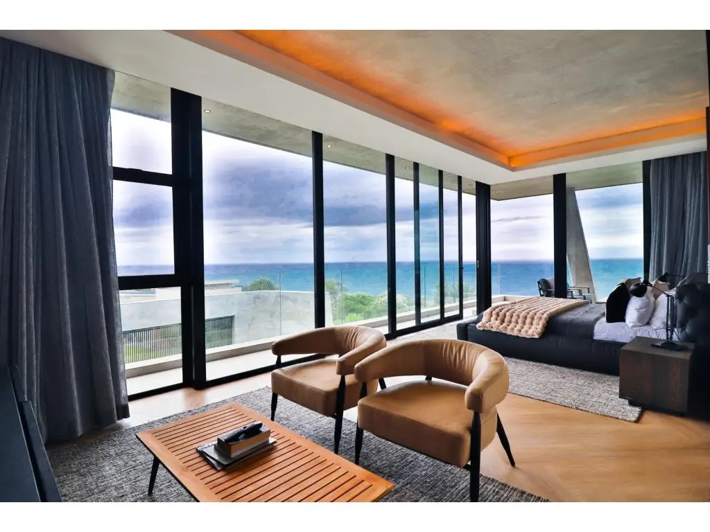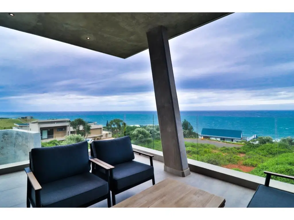 Perched in the prestigious Mont Clam Oceanside Estate in Sheffield Beach, this newly completed modern masterpiece offers the ultimate in luxury coastal living. Boasting the finest finishes throughout, the home captures breathtaking panoramic sea views from every angle. The striking architectural design seamlessly blends elegance and functionality, creating a haven of sophistication and comfort. The lower level is an entertainer's dream, featuring an open-plan kitchen and dining area that flow effortlessly into a spectacular living space. Expansive glass doors open to a lush garden, complete with a sparkling pool and fire pit, perfect for relaxation and social gatherings. A covered patio features a built in braai, and a triple garage adds convenience and security, completing this remarkable coastal home. Upstairs, four generously sized bedrooms await, each with its own en-suite bathroom, offering uninterrupted ocean vistas and access to private balconies. Natural light floods the interiors, enhancing through cleverly angled walls, a great sense of space and tranquility. Thoughtfully designed for modern living, the home ensures every detail is meticulously crafted to the highest standards. Full access to all Zululami and Seaton facilities, including private beach access, beach club, sports pavilions and more