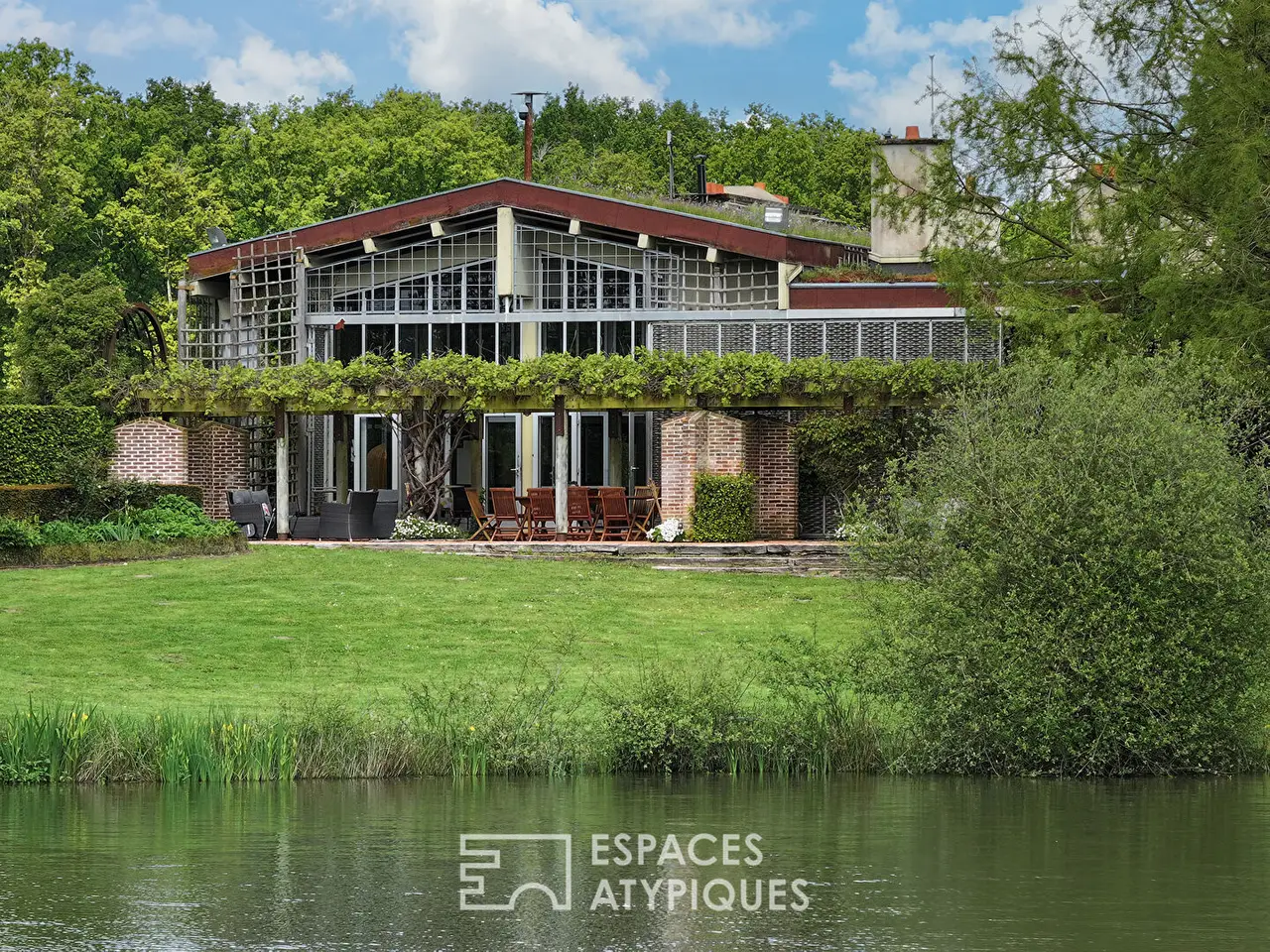 In the heart of the Orleans national forest, 120km from the center of Paris, here is the opportunity to settle in a unique place, the latest project by a resolutely innovative architect. Unique in every way. Unique in its design and architecture. Unique for its location in an incredible green setting. Blend into the landscape, become one with it. This is the guideline of this architectural project. Take a long tree-lined path and not know at first glance where the house starts and the garden ends. To do this, the roof was greened and the walls were adorned with plants thanks to the installation of a chestnut trellis. It is by crossing the threshold of the front door that the singularity of this building is revealed little by little. First with this half-level game which starts from the entrance. The upper half-level leads to the heart of the house, a breathtaking living room. By its volume and its dizzying height, by its specific treatment of the walls and ceiling which bring a dynamic, by its entirely glazed south gable offering a striking panoramic view of the sparkling pond, where the dancing reflections of the sun create a symphony of dazzling colors. In summer, the roof overhang and a mobile metal shutter which will gently deploy will keep the interior cool. This living space, although open, offers different spaces, a cozy corner near a first fireplace, the main living room and the dining area in the center then access to the winter garden, adjustable to enlarge the living room, designed like a glass box to enjoy the softness of the winter sun. Adjoining the living room, the kitchen is a successful mix of a family kitchen and a professional kitchen, borrowing certain codes, particularly in the design of the furniture. Practicality is not forgotten by a set of niches which allows direct access to the entrance and makes everyday life easier. On the same level, the four suites have been designed like hotel rooms, each with their own fireplace, with a unique design and each with a different view of the surrounding nature, a true invitation to contemplation and serenity. Discreet, the helical staircase is the spine of the house, connecting each level including the laundry area in the basement and then the basement. The first floor was designed as a single board but on which the game of half-levels is found, which gives it both a feeling of space and the possibility of creating several atmospheres. The range of possibilities is vast, office, play area, library, sleeping area, the imagination is limitless. At the basement level, in addition to the technical rooms, a boat garage invites you to explore the peaceful waters of the pond. But this architect-designed house is not limited to its walls and interior spaces. Gardens with different inspirations punctuate the property, offering havens of tranquility where every corner reveals a new treasure of beauty. An XXL swimming pool nestled in the greenery and its pool house will offer a refreshing oasis for hot summer days. Under the swimming pool, a covered garage and workshop area of ??almost 135 m2 could delight fans of classic vehicles. Multiple annexes (85m2 carport, guard house at the entrance to the property, etc.) as well as numerous equestrian facilities offer an ideal complement to this area. Together, these elements create a symphony of charm and wonder, making this house a unique architectural work, with a fascinating history, in the heart of nature, where emotion blends harmoniously with ingenuity. All amenities in the neighboring town a few minutes by car. Access to Paris via the A6 Les Aubrais station 35 minutes away (direction Paris Austerlitz) ENERGY CLASS: C CLIMATE CLASS: B