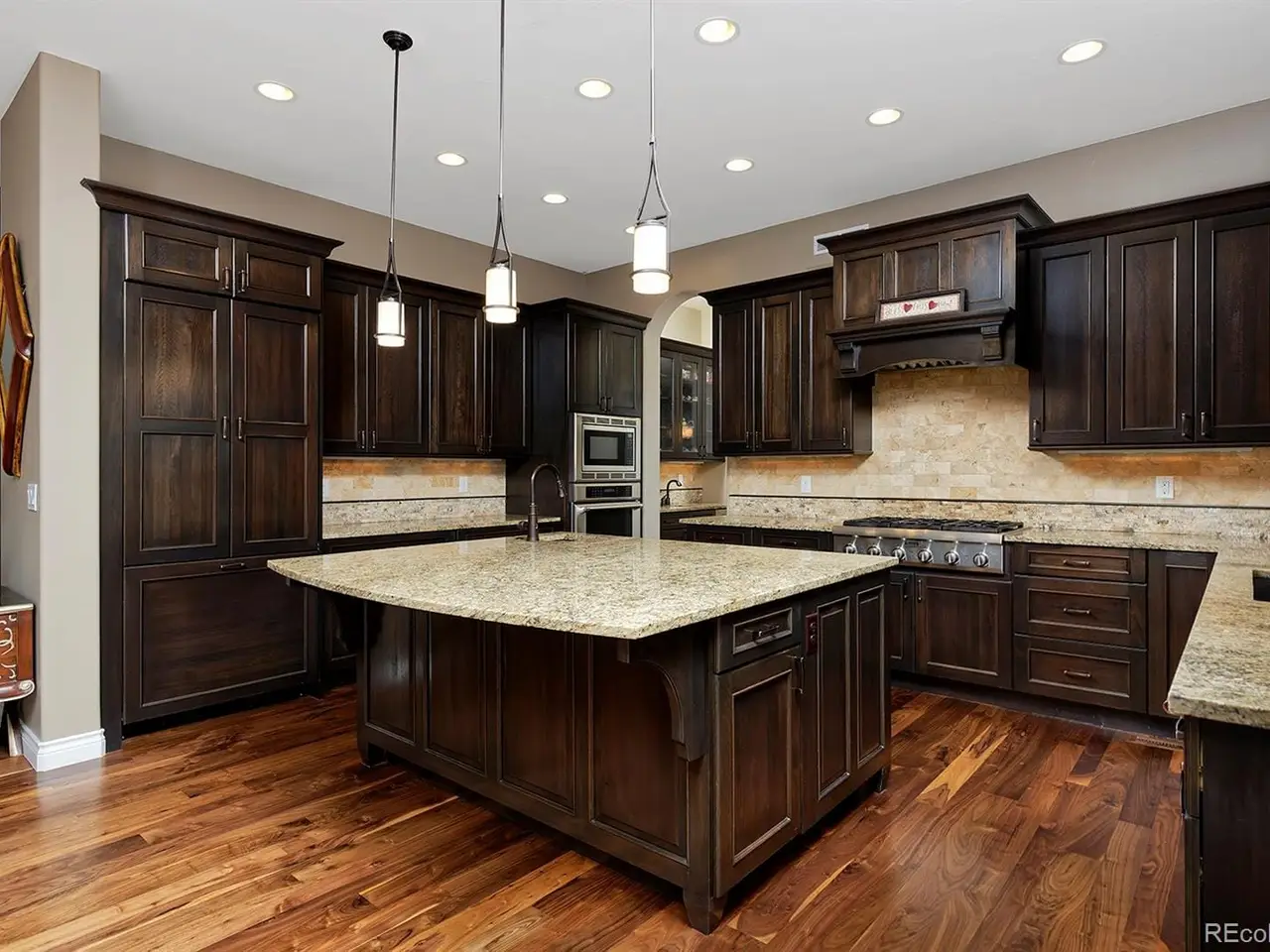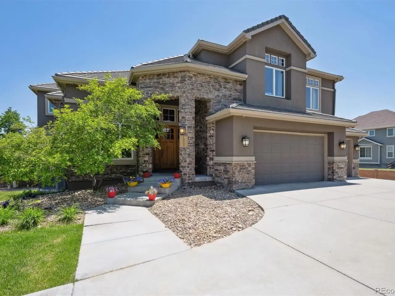 A grand 4 bed, 4 bath home nestled in a peaceful cul-de-sac gives a welcoming reception with a covered porch surrounded by beautiful brick work. Kick your shoes off in the spacious foyer with the surprise of a lovely art niche to guide you in. Tucked to the side of the foyer is a main floor office with French glass doors. High & vaulted ceilings, custom details throughout the home give an opulent feeling. Stately kitchen has granite countertops & Thermador appliances. The main sink has a touchless faucet, soap dispenser & water filtration system. Large island also has a prep sink with touchless faucet. Other features include walk-in pantry, wet bar-coffee station with wine cooler & under cabinet lighting. The kitchen leads to an inviting covered patio overlooking the backyard. Enjoy surround sound inside & outside (sub-woofer, 6 speakers in family room, 2 on patio). Spacious living room adjoins the dining room featuring a hutch alcove & accent light in an elegant ceiling tray. The open & bright feel of the main living space includes a cozy family room with a fireplace with a rustic mantel & brick. Main floor laundry room with washer & dryer, NEW utility sink, plenty of counter & storage space. Main floor powder room & mud room with built-ins located in the garage entry wing. Open stairway leads to upper level with 4 Bedrooms & 3 Bathrooms. The roomy Primary Bedroom has a 5-piece luxury bathroom. Find 2 additional spacious bedrooms adjoined by a full Jack & Jill bath & the 4th bedroom has an ensuite 3/4 bath. Walk-out unfinished basement, water softener system, daylight windows, leads to a covered patio. Have it your wayrec room, gym, guest bedroom, alcove makes a sweet place for a wine room walk out to the backyard patio, great gathering area, perhaps a fire pit, pizza oven. 3-car attached garage with work bench. Nearby Valley Country Club (golf/swim) & Cherry Creek State Park, a great place to stroll & play!