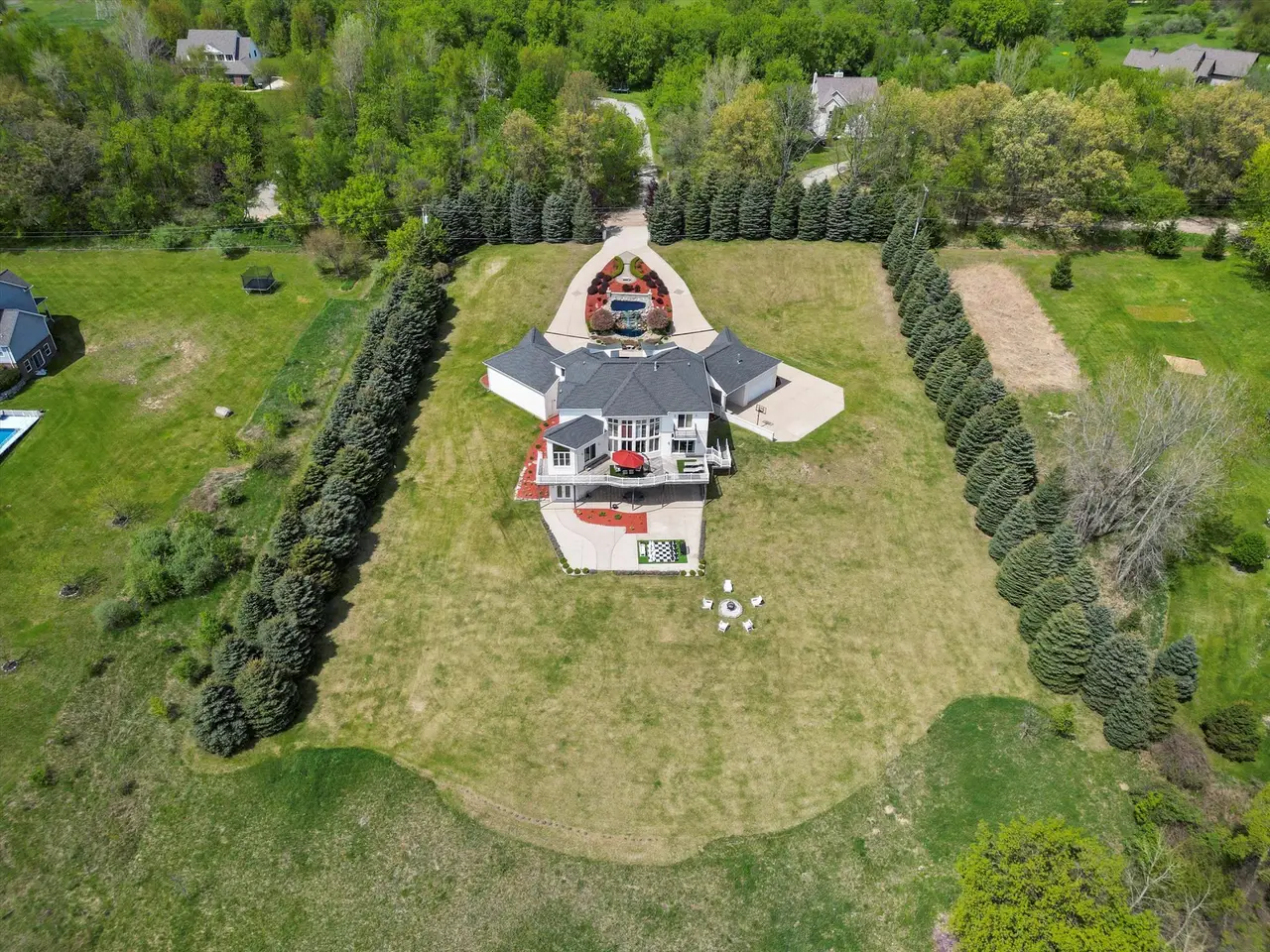 Contemporary Modern estate on 3+ private acres in Addison Township. This spacious home offers 5 bedrooms, 4 full baths, and 1 half bath, including two primary suites—one on the main floor and one on the second level. Open floor plan with clean lines and abundant natural light. The home features a 5-car garage setup with a separate 2-car and 3-car garage. A circular driveway with a water fountain feature provides an elegant entrance. Enjoy outdoor living on the expansive deck that spans the entire back of the home, overlooking a serene property with 100 planted pine trees for added privacy and beauty. The finished walk-out basement includes a home gym, game room, second kitchen, and full bathroom, offering flexible living and entertaining options. Located in a quiet, natural setting yet convenient to Lake Orion, Rochester, and area amenities. This property combines modern style, function, and seclusion.