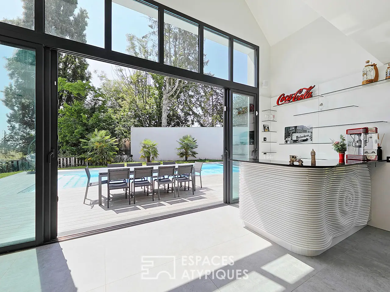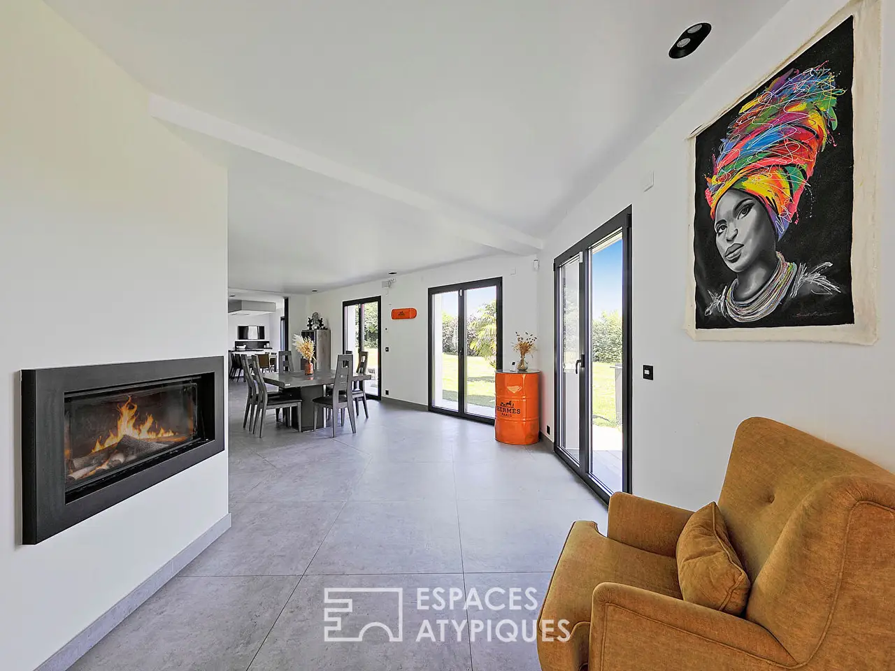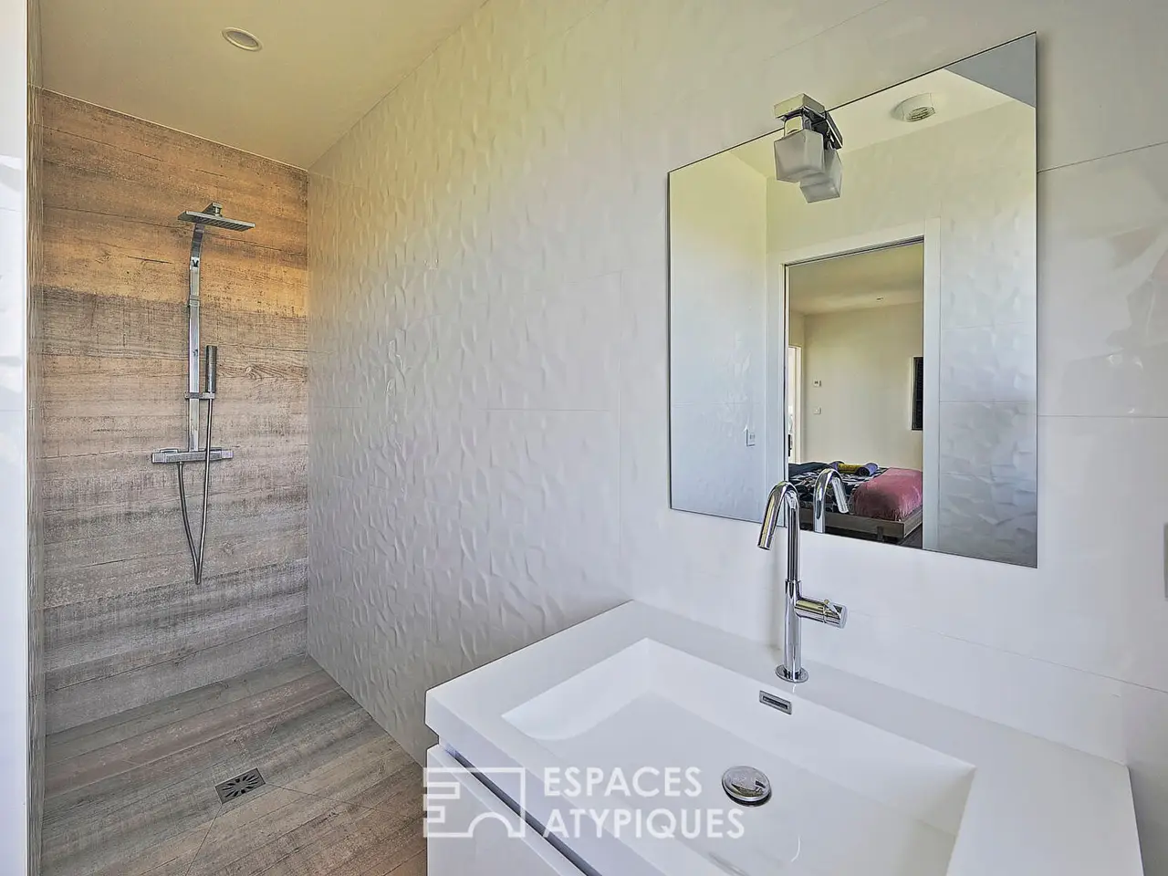 Maison d'architecte avec piscine et jardin paysagerIn a hamlet halfway between Crecy-la-Chapelle and La Ferte-sous-Jouarre in a preserved and green environment, this contemporary architect-designed house from 2018 develops a living space of 442sqm in total on two levels, on a landscaped plot of almost 2800sqm. Designed to combine volume, light and high-end comfort, it has five suites, a heated salt-water swimming pool, a jacuzzi, a 50sqm garage with a fast-charging electric terminal, and an unobstructed view of the countryside. From the entrance, the clean lines, the chosen materials, the brightness and the generosity of the volumes set the tone. The ground floor houses a master suite with a double dressing room and shower room, an office space, a dining room, a separate fitted kitchen with a scullery and pantry, bathrooms, and a living room bathed in light through a bay window opening onto the terrace and the swimming pool. A bar area and a home cinema with multiple screens enhance the conviviality of the place. Upstairs, the glass-floored landing leads to three suites with a dressing room and shower room, a fourth suite with a spa bathroom, a mezzanine living room and a gym/games room. The carefully designed interior layout allows for smooth and functional circulation. The outdoor spaces offer a real relaxing break: a 5×11 m heated swimming pool, a 5-seater jacuzzi, a continuous terrace, a fitted summer kitchen, a shower room and bathrooms for exiting the pool or spa, as well as a landscaped garden structured around various species, olive trees, palm trees, cherry trees and colorful hedges. The equipped well provides watering and supplies the sanitary facilities. One hour from Paris, this property benefits from a bucolic setting while remaining close to amenities, schools and transport links. Solar panels, underfloor heating by insert, reversible heat pumps, double aluminum glazing, home automation and optimal energy performance: a rare property, with an atypical character, ideal for a large family and with strong rental potential, currently operated as an Airbnb. ENERGY CLASS: A / CLIMATE CLASS: A Amount of annual energy expenditure for standard use established from energy prices indexed for the years 2021, 2022, 2023 (subscription included) between EUR965 and EUR1305 per year. Contact: Elvire de la MARTINIERE - 06 03 05 05 96 RSAC: 800 930 232 MEAUXREF. SM1158Additional information* 11 rooms* 5 bedrooms* Outdoor space : 2748 SQM* Parking : 5 parking spaces* Property tax : 3 797 €Energy Performance CertificatePrimary energy consumptiona : 41 kWh/m2.yearHigh performance housing*41kWh/m2.year1*kg CO2/m2.yearA*B*C*D*E*F*GExtremely poor housing performance* Of which greenhouse gas emissionsa : 1 kg CO2/m2.yearLow CO2 emissions*1kg CO2/m2.yearA*B*C*D*E*F*GVery high CO2 emissionsEstimated average annual energy costs for standard use, indexed to specific years 2021, 2022, 2023 : between 965 € and 1305 € Subscription IncludedAgency feesThe fees include VAT and are payable by the vendorMediatorMediation Franchise-Consommateurswww.mediation-franchise.com29 Boulevard de Courcelles 75008 ParisInformation on the risks to which this property is exposed is available on the Geohazards website : www.georisques.gouv.fr