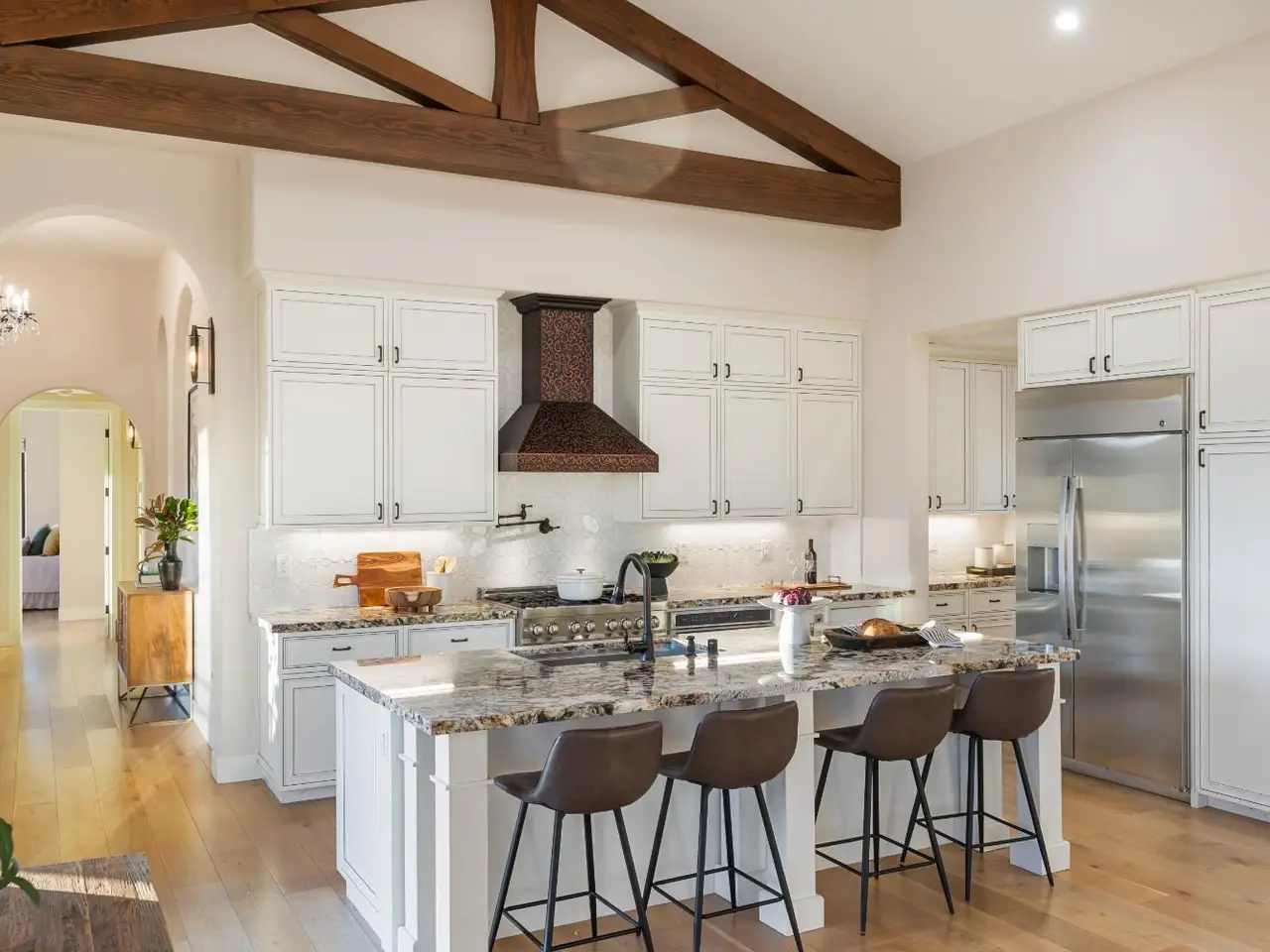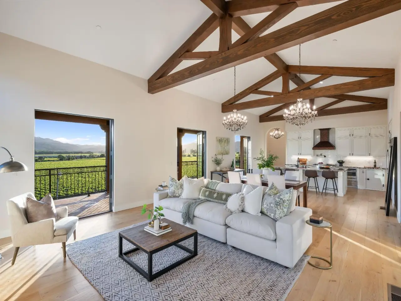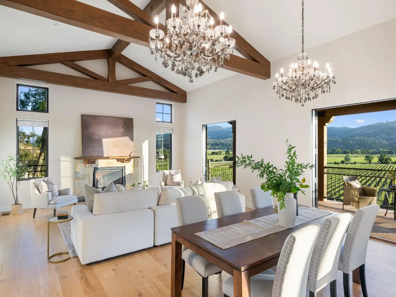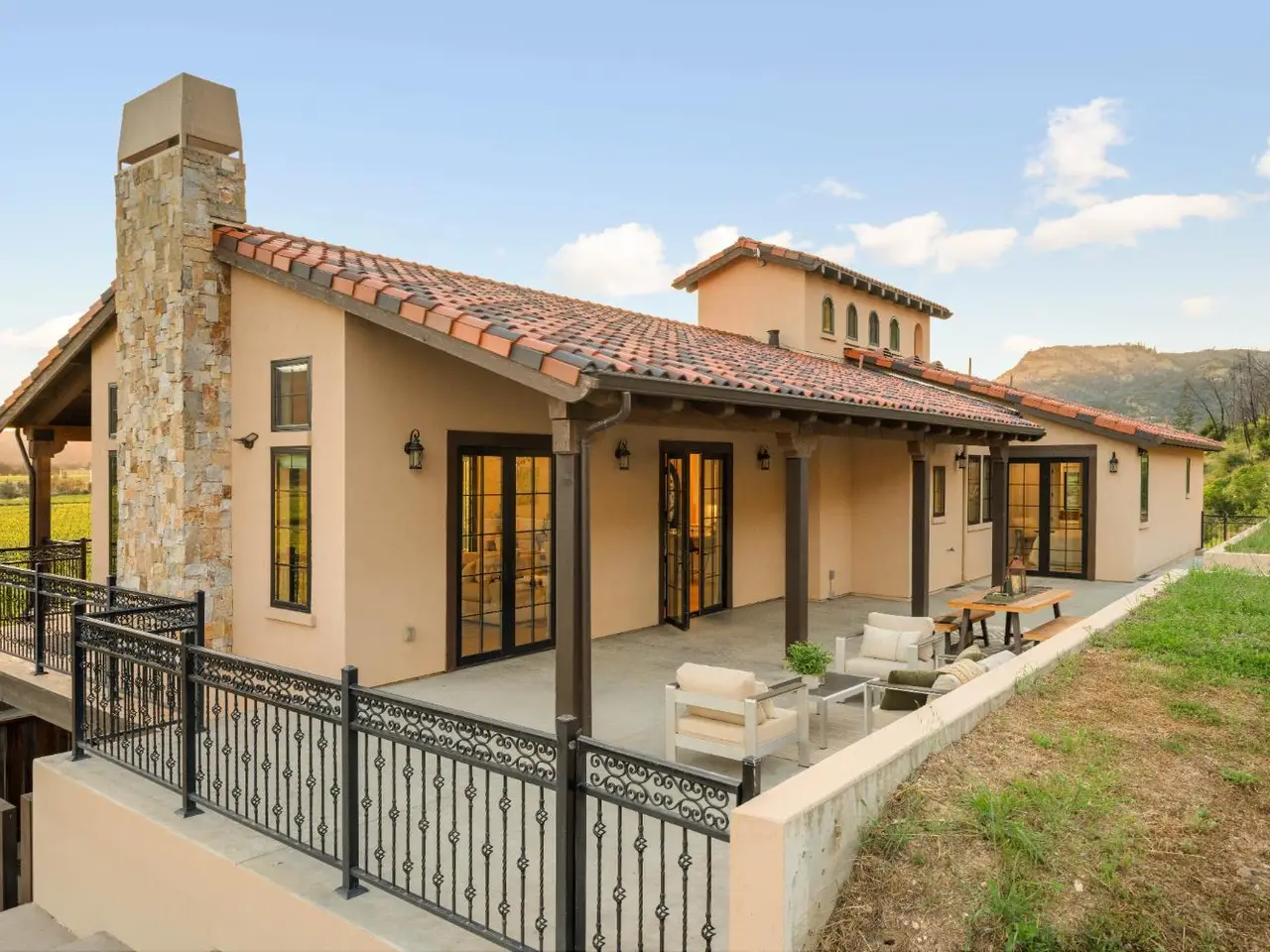 Nestled along the iconic Silverado Trail between St. Helena and Calistoga, this Tuscan-style estate blends old-world charm with modern luxury. Built in 2020 on approximately 4 private acres, the property offers sweeping southwest views over Duckhorn Vineyards and the Mayacamas Mountains beyond. The main residence features three spacious en-suite bedrooms, each showcasing high-end finishes. A spacious great room opens seamlessly to the outdoors through five custom Andersen French doors, perfect for entertaining or relaxation. Additional interior highlights include a dedicated office, a wine room, and a 3-car garage. The expansive terrace invites al fresco dining and lounging in complete privacy. A beautifully updated one-bedroom ADU offers added versatility, complete with a full kitchen, generous living and dining areas, a private yard, and vineyard views. Located just minutes from world-renowned wineries and restaurants, this exceptional property embodies the best of Napa Valley living.