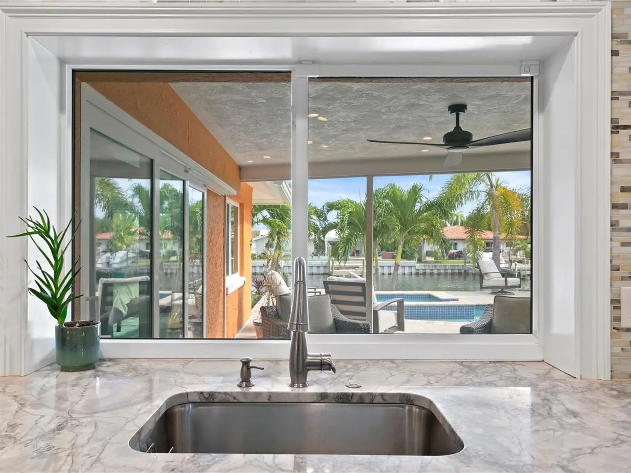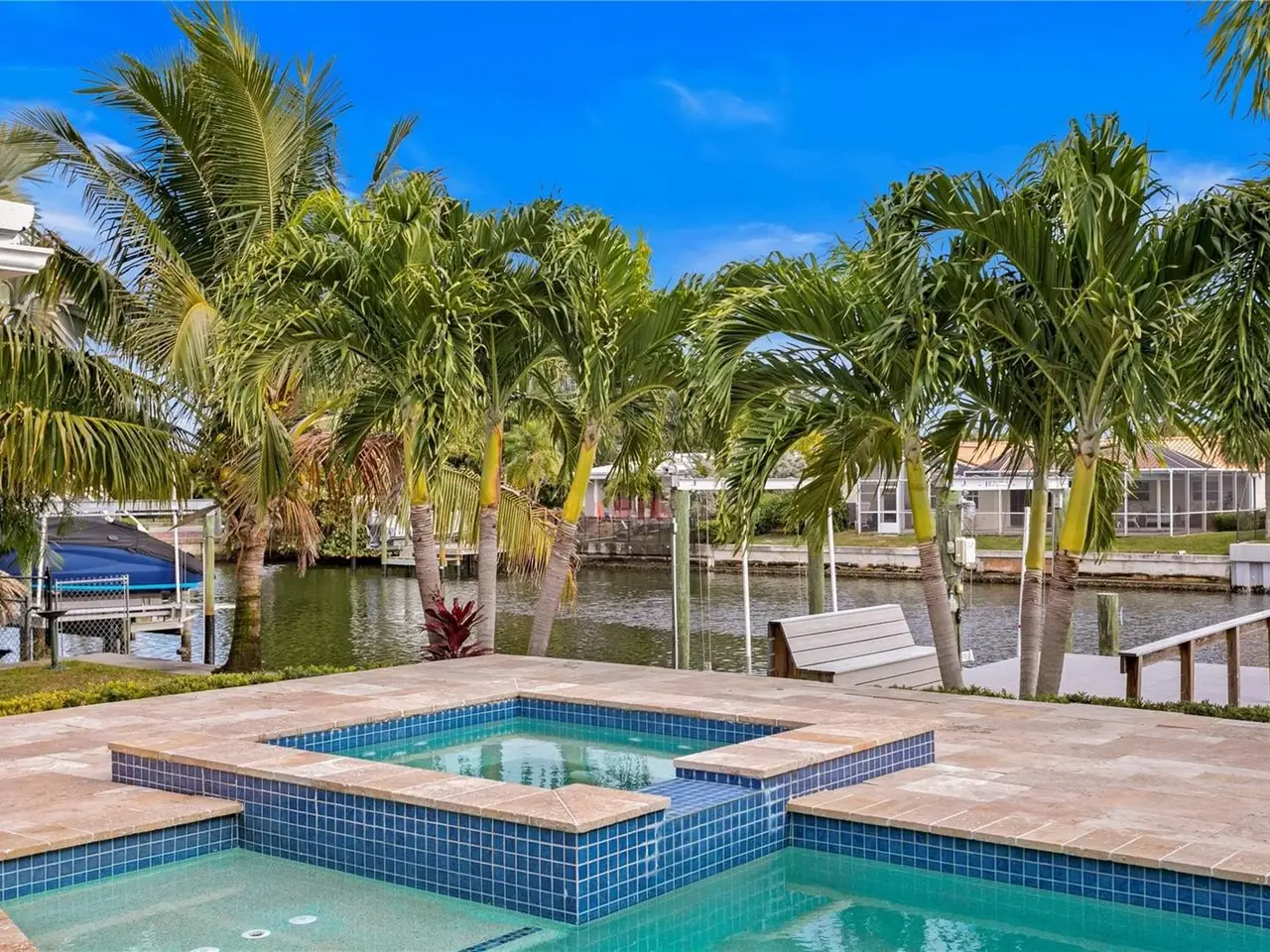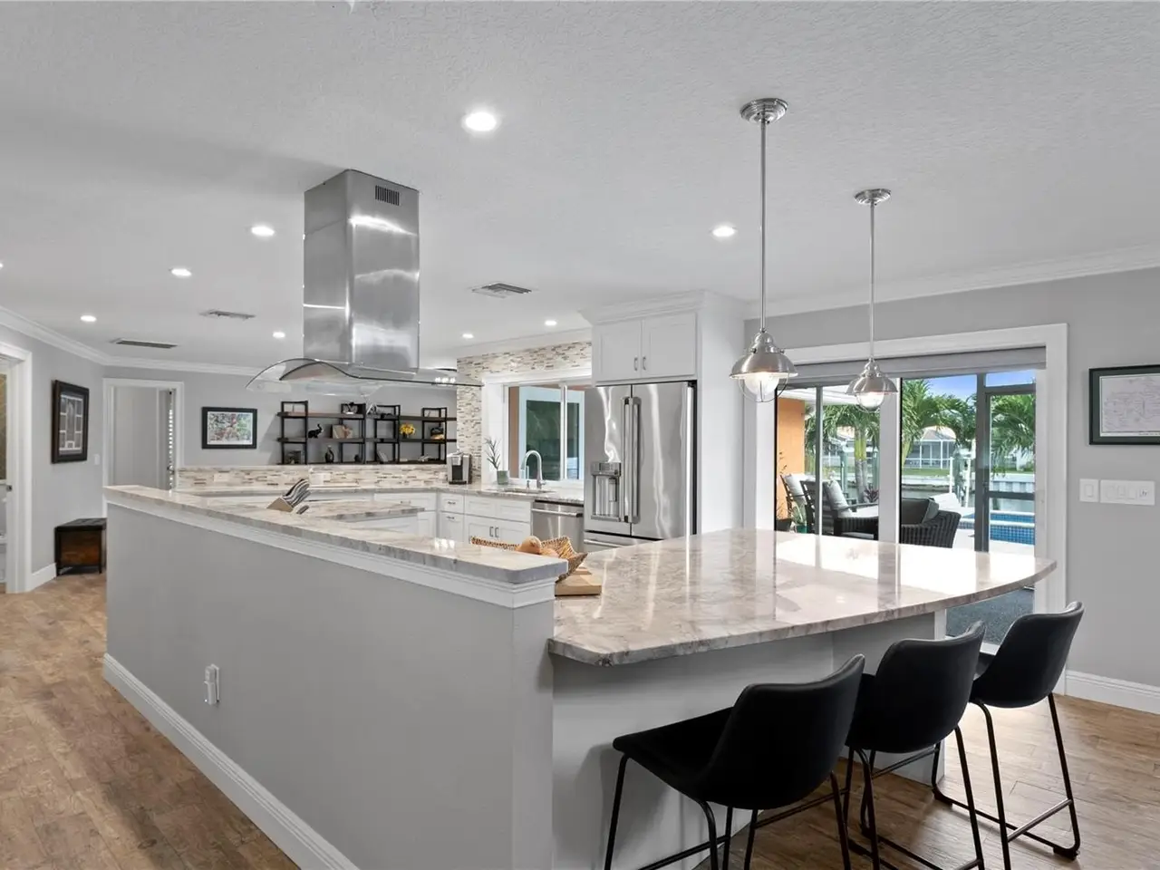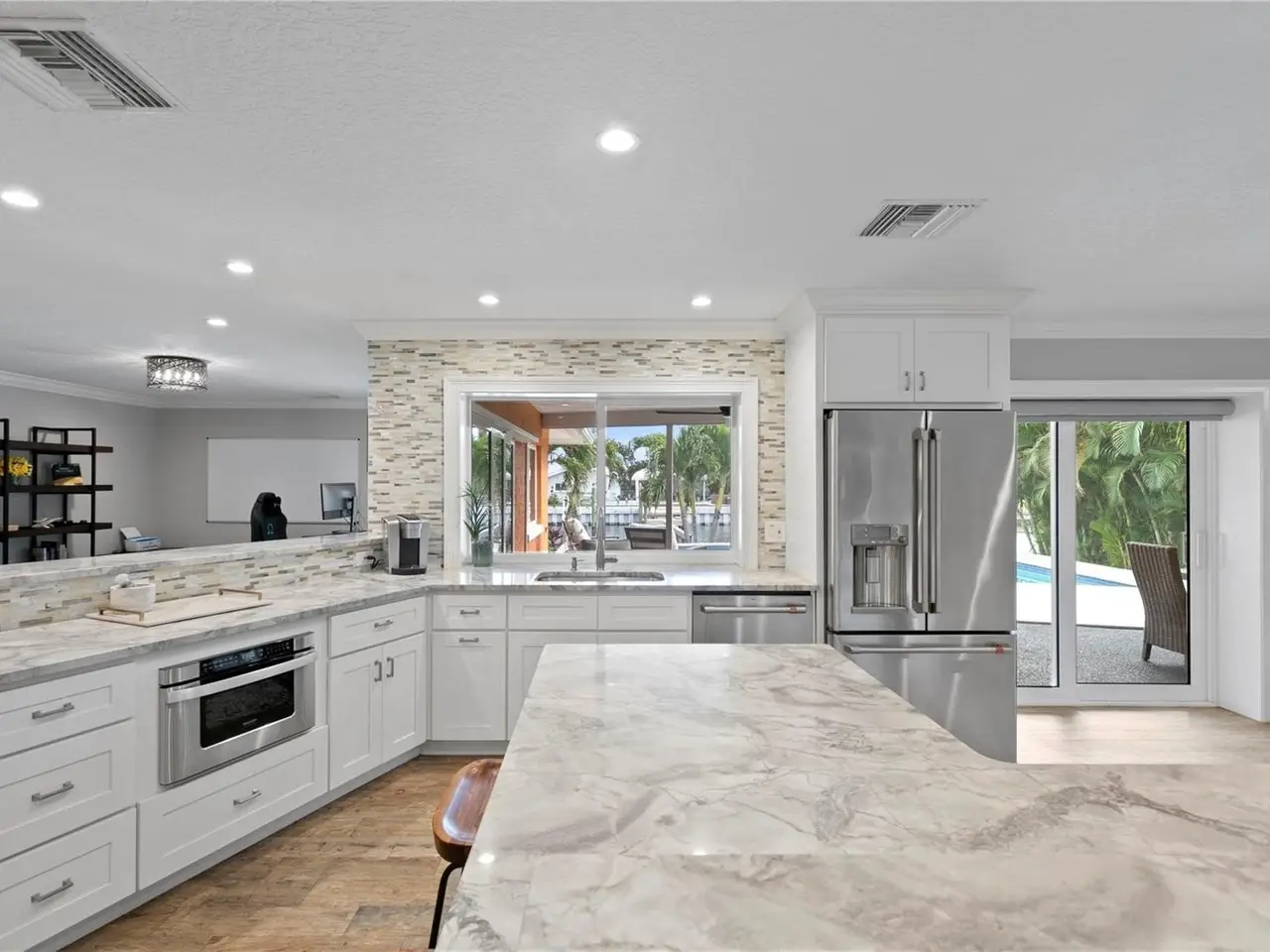 Don’t miss your opportunity to own this stunning home in the highly sought-after waterfront community of Venetian Isles! This beautiful 4-bedroom, 3-bath residence offers the perfect blend of luxury, comfort, and modern coastal living. Step inside to an expansive open-concept layout where the family room, kitchen, and dining area flow seamlessly into a screened lanai and beautifully landscaped backyard—perfect for effortless indoor-outdoor entertaining. The home welcomes you with a spacious foyer or a convenient mudroom entrance from the two-car garage. Throughout the living spaces, wood-look ceramic tile creates a warm, elegant ambiance. At the heart of the home, the chef’s dream kitchen features a large U-shaped eat-in island with marble countertops and backsplash, high-end Café series stainless steel appliances, and stylish custom cabinetry. The interior laundry room is as functional as it is beautiful, complete with Whirlpool Cabrio washer and dryer, built-in cabinetry, utility sink, and marble tile accents. Thoughtfully designed for privacy, the home offers a split bedroom layout. The first guest bedroom enjoys a beautifully appointed full bath, while two additional bedrooms in a separate wing share a spa-like bathroom with Danze fixtures and designer finishes. The private master suite is a true retreat, showcasing a luxurious marble bathroom and a generous walk-in closet. Enjoy true Florida living with hurricane-rated sliding glass doors that fully pocket back, connecting your main living spaces to the screened lanai and creating a seamless indoor-outdoor experience. Whether you're relaxing by the heated saltwater pool and spa, or enjoying tranquil canal views from the cozy firepit corner, this backyard oasis has it all. Boaters will appreciate the composite dock with electric, water, a 10,000 lb. boat lift, and updated seawall (2017). The lush landscaping provides ample privacy and is enhanced by elegant outdoor lighting for evening ambiance. Best of all, this home has experienced no water damage from any hurricanes—a testament to its strong construction and elevated location. Homes like this in Venetian Isles don’t come around often—schedule your private showing today!