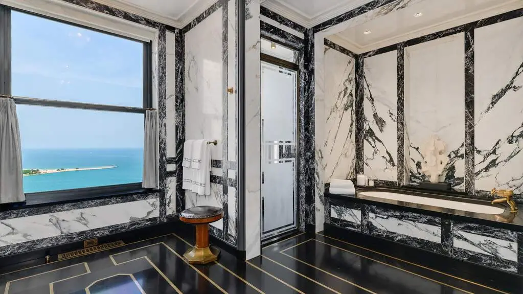 Full-floor Art Deco masterpiece pays homage to the 1929 built Palmolive Building with no details overlooked. This full floor renovation by Liederbach & Graham Architects, designed by Steven Gambrel includes private elevator foyer, (3) bedrooms, sitting room plus library with adjacent office. Caretti Terrazzo floor in main foyer. French Oak-Parquet de Versailles flooring throughout main living areas. Salon features opal glass fireplace mantel. Stunning millwork including shelving and glass cabinets for artwork and books throughout. The kitchen showcases an Officine Gullo Range complimented by Sub-Zero and Miele appliances with expansive eat in dining table and bench overlooking Lake Michigan and Oak Street Beach. Primary bathroom on point with Calacatta and Belgium black marbles. Home features (3) fireplaces including one in red leather wrapped library. Primary walk-in closet featured in Architectural Digest boasts natural light via window seats, bleached walnut custom cabinetry with leather-topped, double-sided chest of drawers. Home features electronic blinds throughout. There are (4) garage spots included with (2) more available.