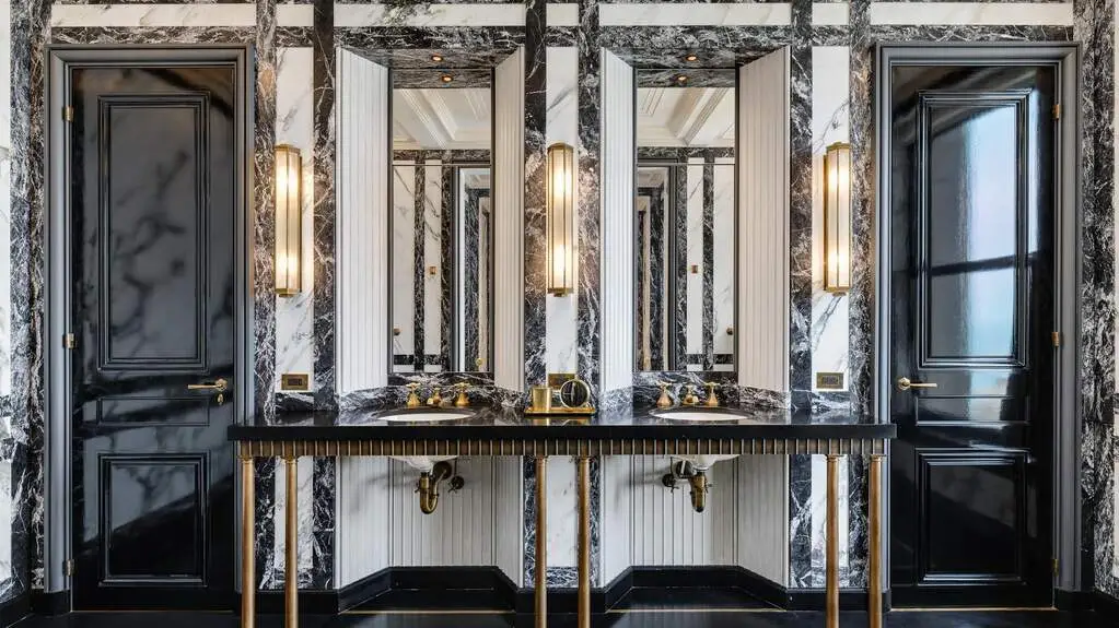Calacatta and Belgium black marbles in primary bathroom