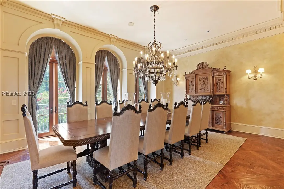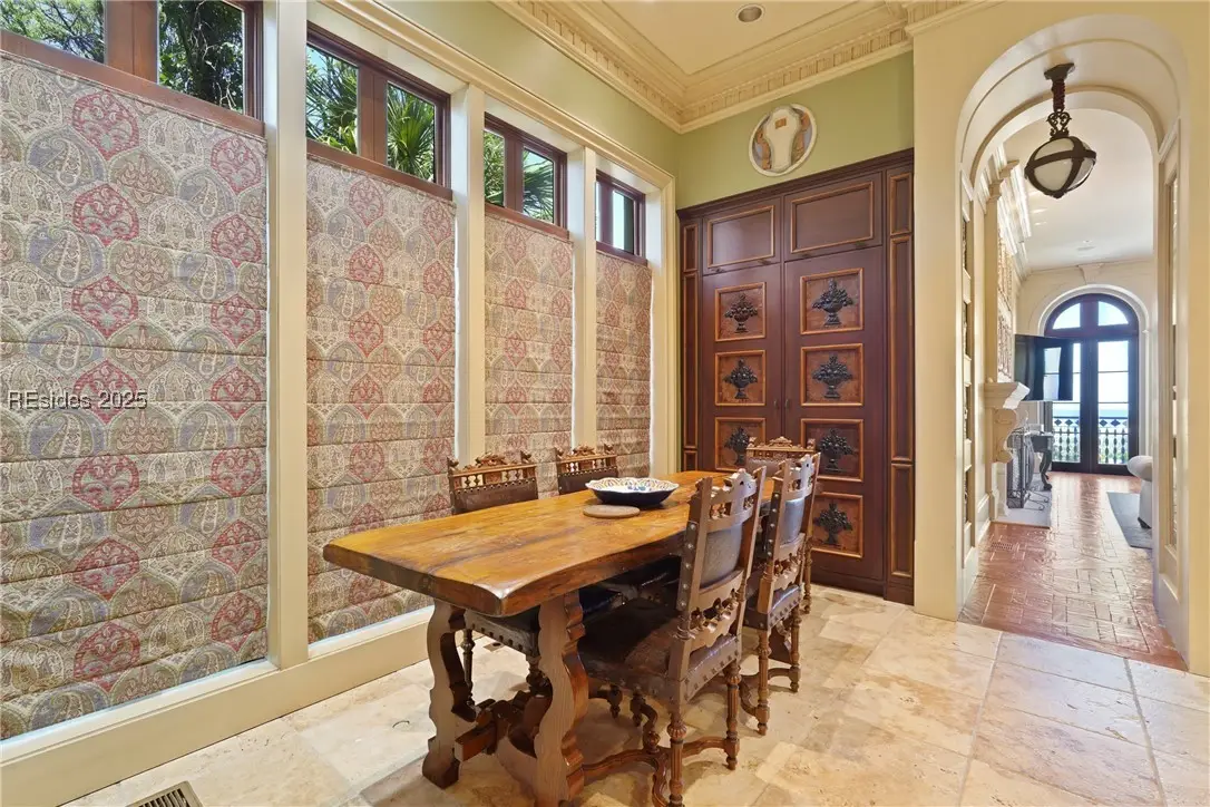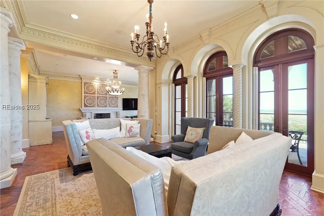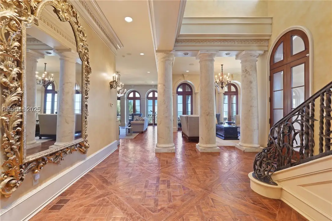 Cross your private bridge onto what feels like a private island and wake to direct Atlantic views at this exquisite 4-bed, 5.5-bath Mediterranean estate in the exclusive gated community of Stella Del Mare. Crafted with exceptional materials, hand-laid walnut floors, carved travertine, silk wall coverings, and wrought iron details, features include a private pool, spa, courtyard, elevator, multiple balconies overlooking the ocean, and a resort-style ambiance throughout. Constructed using a Hebel Block system, this home was built to last for generations. The exterior stucco was completely refinished in 2024, along with the replacement of many exterior windows, just a couple of recent major upgrades completed on this home. No home on Hilton Head Island can compare to the level of detail and thought put into the construction of this masterpiece. Act now on this rare offering blending sophistication with premier beachfront living.