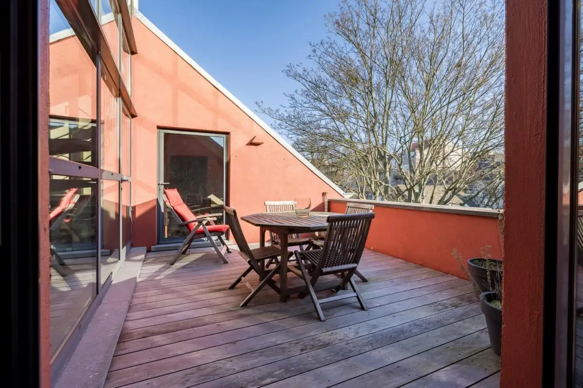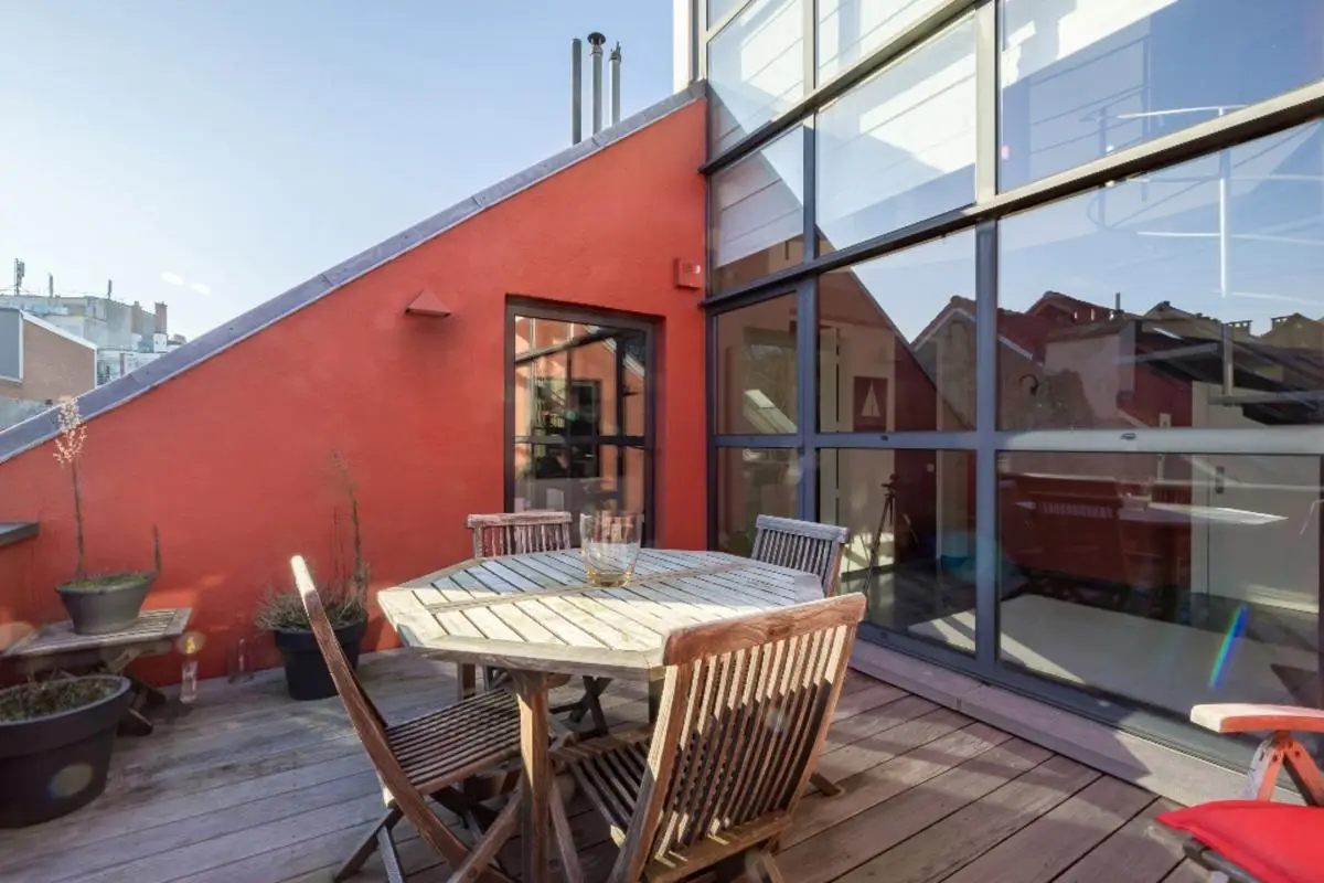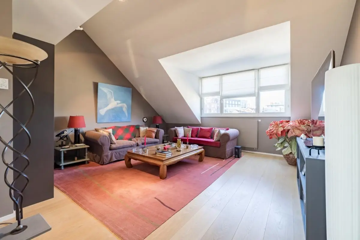 In a quiet street in the Louise district, very close to Place Stéphanie, magnificent duplex penthouse renovated by architect Joël Claisse, approximately 208 square meters plus approximately 14 square meter terrace, on the 3rd and 4th floors of a beautiful manor house. Large reception room, fully equipped kitchen, three bedrooms including a large master suite, two bathrooms. Two parking spaces. Cellar. EPC F (despite very good insulation).