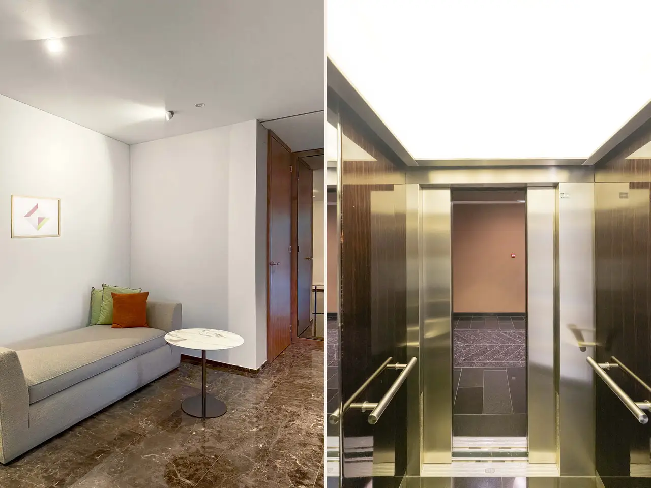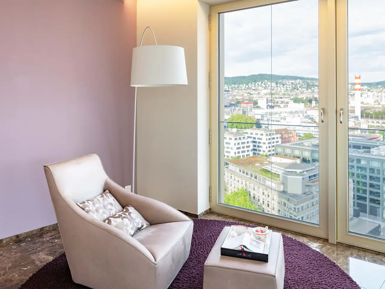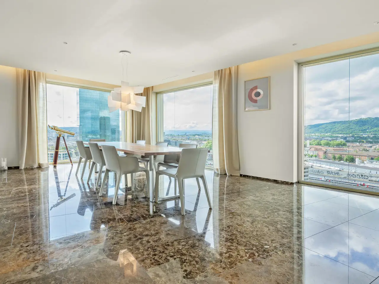 Elevated high above the vibrant cityscape, this extraordinary 5.5-room residence offers refined urban living in Zurich’s iconic Renaissance Tower. Located on the 15th floor, the approximately 300 m² apartment combines panoramic views, modern loft-like architecture, and an unbeatable city location. The expansive living area with floor-to-ceiling windows flows seamlessly into a sleek, designer kitchen—perfect for both entertaining and everyday luxury. Two beautifully appointed bedrooms each feature ensuite bathrooms and soaring ceilings, with one oriented southwest and the other facing east from the entry hall. A sliding door reveals a stylish study or library adjacent to the main living space. A spacious utility room completes the layout, offering comfort and practicality. Zurich’s Hardbrücke train station and tram line 4 are just steps away, providing direct access to the main station and city center. The nearby highway connects you swiftly to the lake, mountains, and Zurich Airport—just 20 minutes away. Designed by the acclaimed Swiss firm Diener & Diener and completed in 2011, the 81-meter Renaissance Tower blends private luxury living with the semi-public amenities of the Renaissance Tower Hotel, making it a bold architectural landmark in Zurich-West.