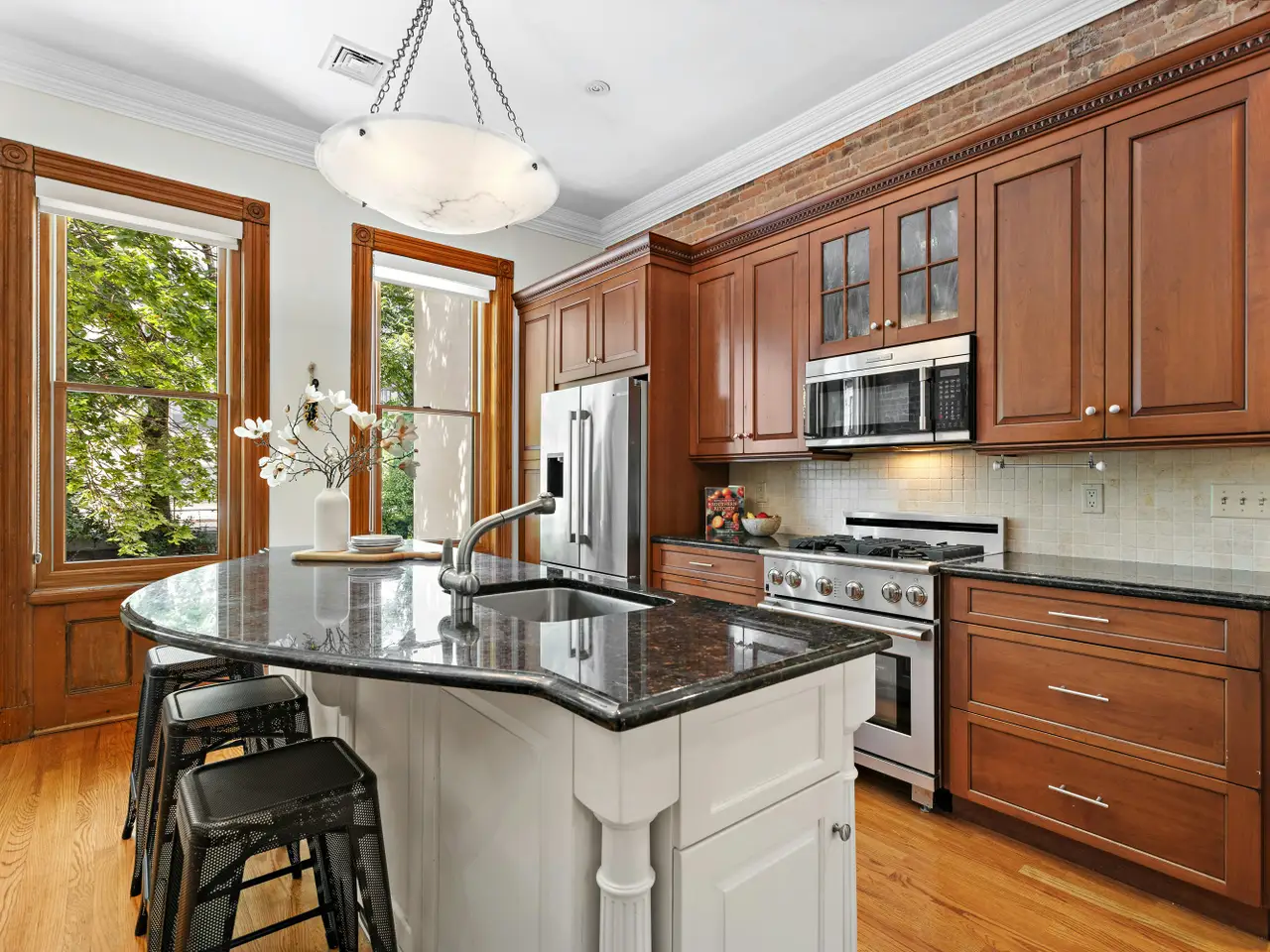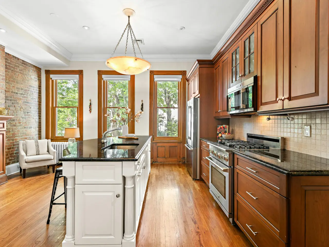This three window wide, 17.5' x 100', uptown Hoboken single family home has four bedrooms and three full baths over three floors, and a large basement. This turn-key home has been completely renovated and the open floor plan on the parlor floor offers a large living/dining area and features a working gas fireplace with an original mantel, exposed brick, and a full bath. The renovated kitchen comes complete with plenty of storage, including a built-in buffet, pantry, and a working island with granite countertops complimenting the Bosch/Miele and Electrolux Icon appliances. The top floor showcases the original exposed brick on a large landing that enjoys an abundance of natural light from the overhead skylight and encompasses three bedrooms, including a primary with a large walk -in closet, a well-appointed full bath, and two other bedrooms with built-in bookshelves and dresser that overlooks the garden. The fully rebuilt staircase takes you down to the garden level which has another office/bedroom that is fully paneled, has a built-in glass bookcase, classic shuttered windows for privacy, and is currently being used as an office. Beyond the bedroom is another well-appointed full bathroom featuring a large custom vanity with marble countertops and glass paneled shower with subway tile. The large garden level family room comes equipped with a built-in wet bar, a working fireplace, and leads to an oversized beautiful professionally landscaped backyard with a large pergola and BBQ with dedicated gas line that is perfect for entertaining. 1314 Garden retains many original features including a beautifully restored facade and stoop, original double parlor floor doors, original mantels newel post, and many original decorative moldings. The home provides heating and cooling through a state-of-the-art 3 zones of forced air cooling and hot water radiators. The basement provides an abundance of storage and room for mechanicals, is ideal for storage, and features a custom 700 bottle fully-conditioned wine cellar with tasting table. The 1300 block of Garden Street retains the highly desirable and consistent turn-of-the-century townhouse architecture and is conveniently located only five minutes from Hoboken's 14th Street NY Waterway Ferry and is located just moments from 14th and Washington Street's boutique shopping, restaurants, and the NJ Transit bus route which will take you to Port Authority bus terminal in approximately fifteen minutes. Rental parking is available nearby.