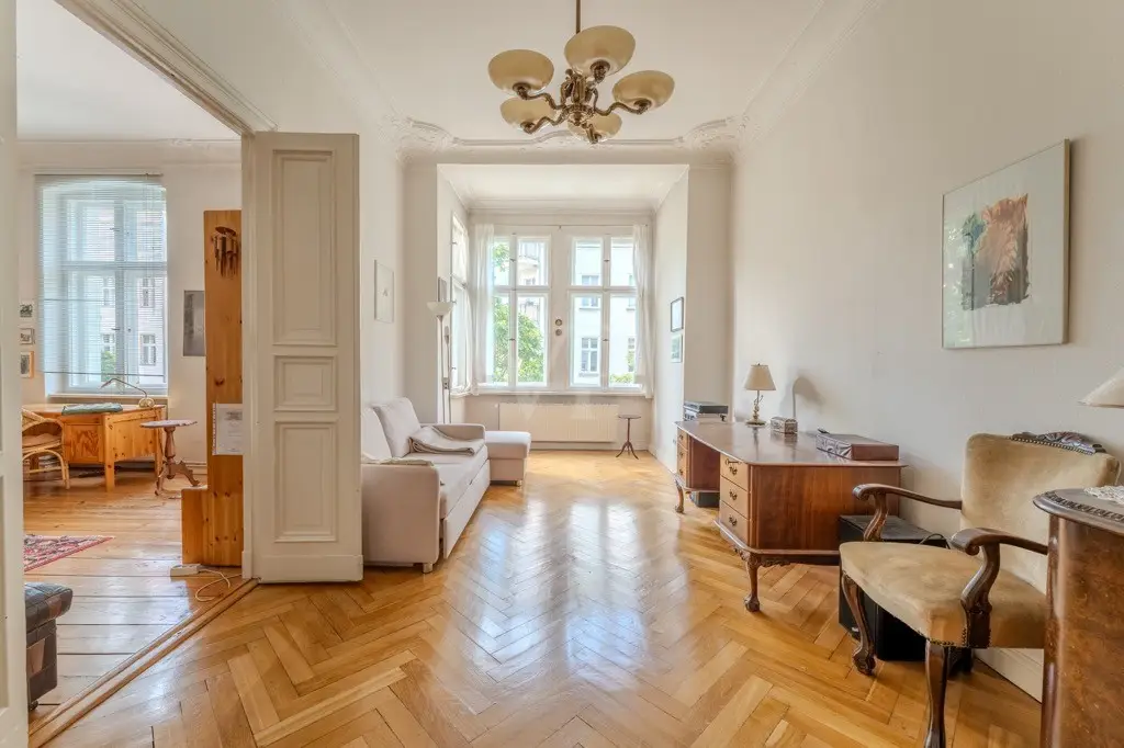 For sale is an exceptional and generously proportioned old apartment in the sought-after Winsviertel district in the heart of Berlin-Prenzlauer Berg (milieu protection area). The building was constructed around 1900 and impresses with its historic building fabric and well-maintained overall condition. The apartment is located in the front building and offers generous and stylish living comfort on approx. 116 m² of living space and a ceiling height of up to 3.40 m. The layout of the apartment is clearly structured and offers a comfortable living ambience: In the front area, there are two large rooms - connected by a double door - and a small balcony. The third room is located opposite. At the back of the apartment, you will find the kitchen with built-in units and a small seating area as well as the bathroom with a bathtub, shower and plenty of natural light. The bathroom and kitchen are fitted with double-glazed wooden windows. Typical old building elements such as stucco decorations, original double doors and the wooden box-type windows in the front living area, which were restored in 2015, give the apartment a special character. The oak parquet flooring and floorboards underline the elegant living atmosphere. Heating is provided by a gas-fired central heating system, which also supplies hot water. There is also a cellar compartment and bicycle storage facilities in the inner courtyard. The house rent is set at EUR 232.32 per month (excluding gas costs, but including EUR 70.33 maintenance reserve). The apartment was last modernized in 2007. The central and quiet location of the apartment in the Winsviertel offers excellent connections to the public transport network. All important facilities for daily needs can be reached in the immediate vicinity. This apartment appeals to singles, couples and small families alike - an ideal home for city lovers looking for something special. Locations Description The apartment is located in the popular Winsviertel district in the heart of Berlin-Prenzlauer Berg (milieu protection area) - one of the capital's liveliest and most charming neighborhoods. The neighborhood is characterized by lovingly renovated old buildings, leafy avenues and a diverse range of restaurants. Just a few steps away is the legendary Volkspark Friedrichhain, Kollwitzplatz with its weekly market and Leise Park - a green oasis with quiet paths and shady spots that invites you to take a walk and relax. The Winsviertel impresses with its high density of cozy cafés, individual boutiques and small delicatessens. The central location also makes it easy to reach Berlin's City East with Alexanderplatz, Museum Island and Hackescher Markt - both by bike and by public transport. The connections are excellent: the underground and S-Bahn stations Alexanderplatz, Greifswalder Straße and Prenzlauer Allee are very close by - several streetcar lines are within walking distance. This location combines urban life with a relaxed neighborhood atmosphere in an ideal way.