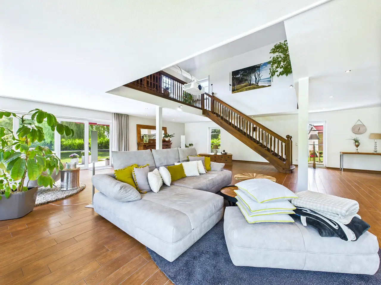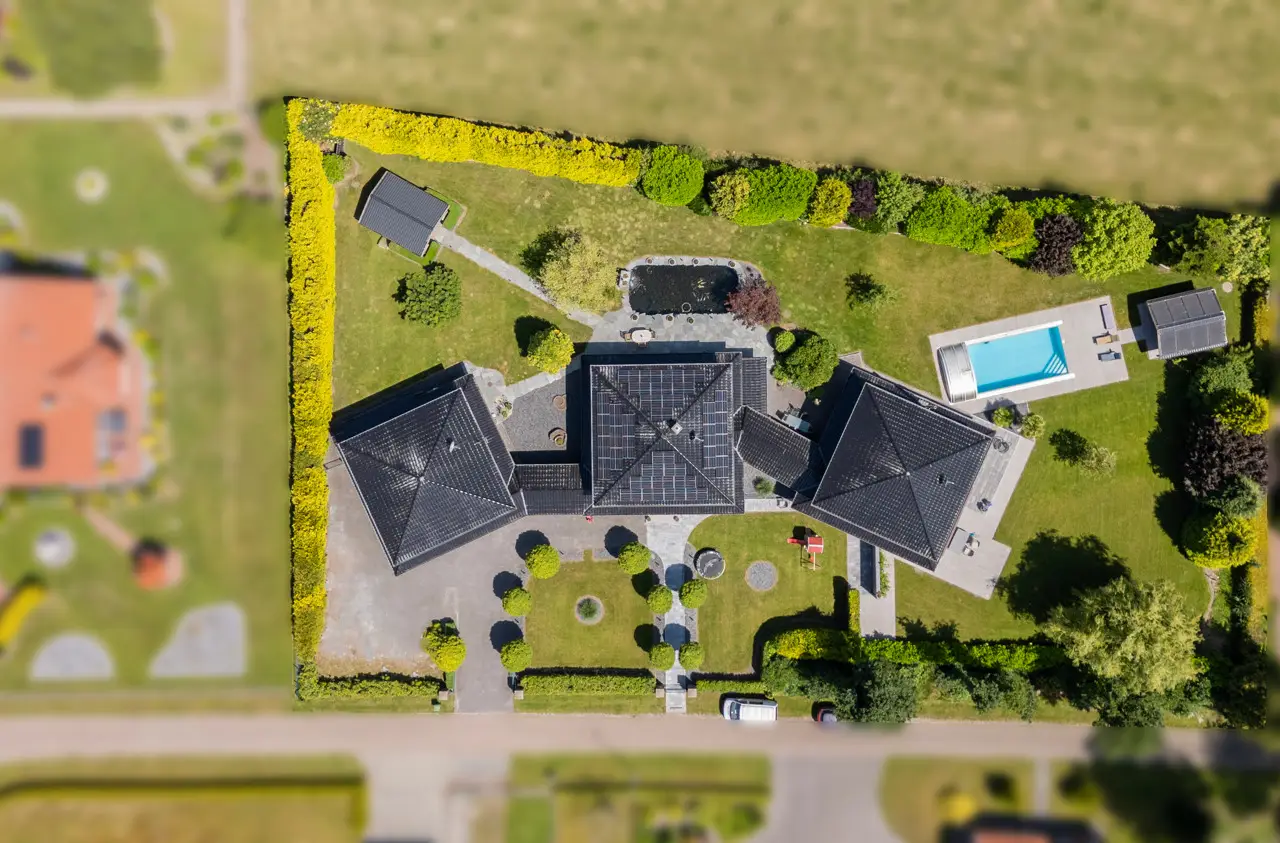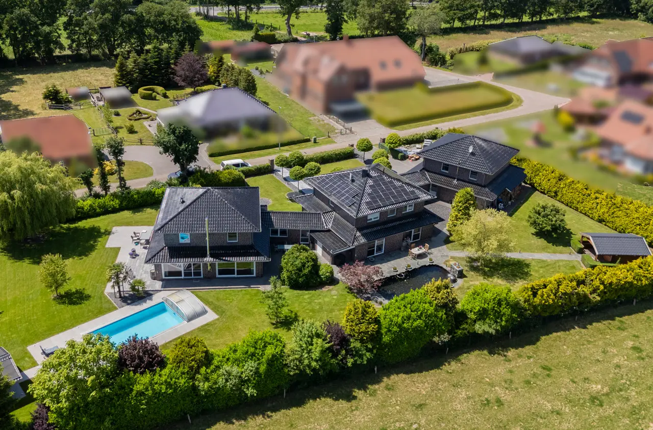 Have you always been looking for a truly exceptional home? If so, you're in for a treat - because this stylish home in the idyllic Bagband district is much more than just a house: it's an architectural statement. Built around 2006 and impressively extended in 2010, the ensemble unites three cleverly connected buildings to create a unique living concept that harmoniously combines modern design, high-quality materials and maximum living comfort. A living concept with a wow effect: As soon as you enter the central main house, you can feel the clear, timeless design language that characterizes this property. Generous window fronts flood the rooms with light and open up fantastic views of the green surroundings. The understated interior architecture allows maximum freedom of design - a real paradise for design lovers with high standards. The high-quality fitted kitchen with brand-name appliances and gas hob leaves nothing to be desired. From here you have a view of your spacious koi pond. The heart of the house is the open-plan living and dining area with fireplace, which invites you to spend sociable evenings and relaxing hours. Two bedrooms, a modern daylight bathroom with bath and shower and a bedroom with en-suite bathroom complete the main building - here too, a fireplace creates a cozy atmosphere. Work, live & enjoy - under one roof. A real highlight: the outbuilding on the right houses an impressive multi-media room with an area of approx. 103 m². The combination of state-of-the-art technology, gallery level and cozy wooden design creates an atmosphere that is second to none - ideal as a home cinema, studio or creative space. The third part of the building houses the modern double garage with additional kitchen connections and generous space for garden tools or a hobby workshop. Two converted rooms and a separate shower room await you on the upper floor - perfect as a guest, office or youth area. Garden, pool & wellness - your private vacation paradise. The park-like garden is a real hideaway: secluded, fully fenced and equipped with an 8.5 x 4.5 m outdoor pool, which can be heated to a comfortable temperature all year round thanks to a separate solar system. A modern glass cover allows bathing pleasure in (almost) any weather. The wellness facilities are complemented by a stylish wooden house with an integrated sauna - ideal for relaxing after a long day. Technology & sustainability The property is also in the top league when it comes to technology: a photovoltaic system with 15 kWh storage, state-of-the-art home technology and an alarm system with 7 outdoor cameras offer a high level of energy efficiency and security. The koi pond's filter system is housed in its own technical room. It is virtually maintenance-free and the water is topped up automatically. The entire system can be controlled via an app. It goes without saying that the entire ensemble is well maintained and ready to move into - all you have to do is move in!