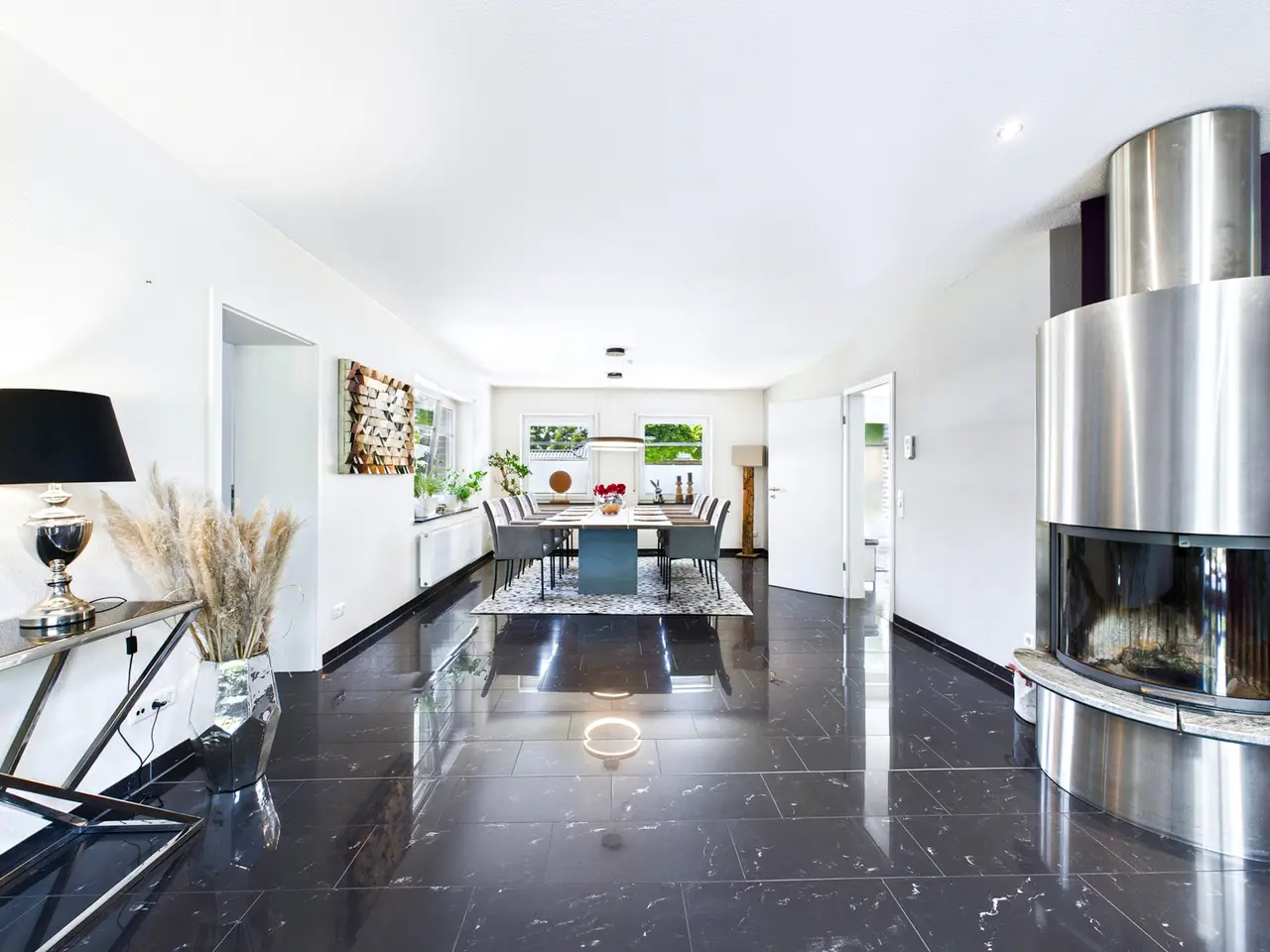 Open-plan living and dining area with fireplace