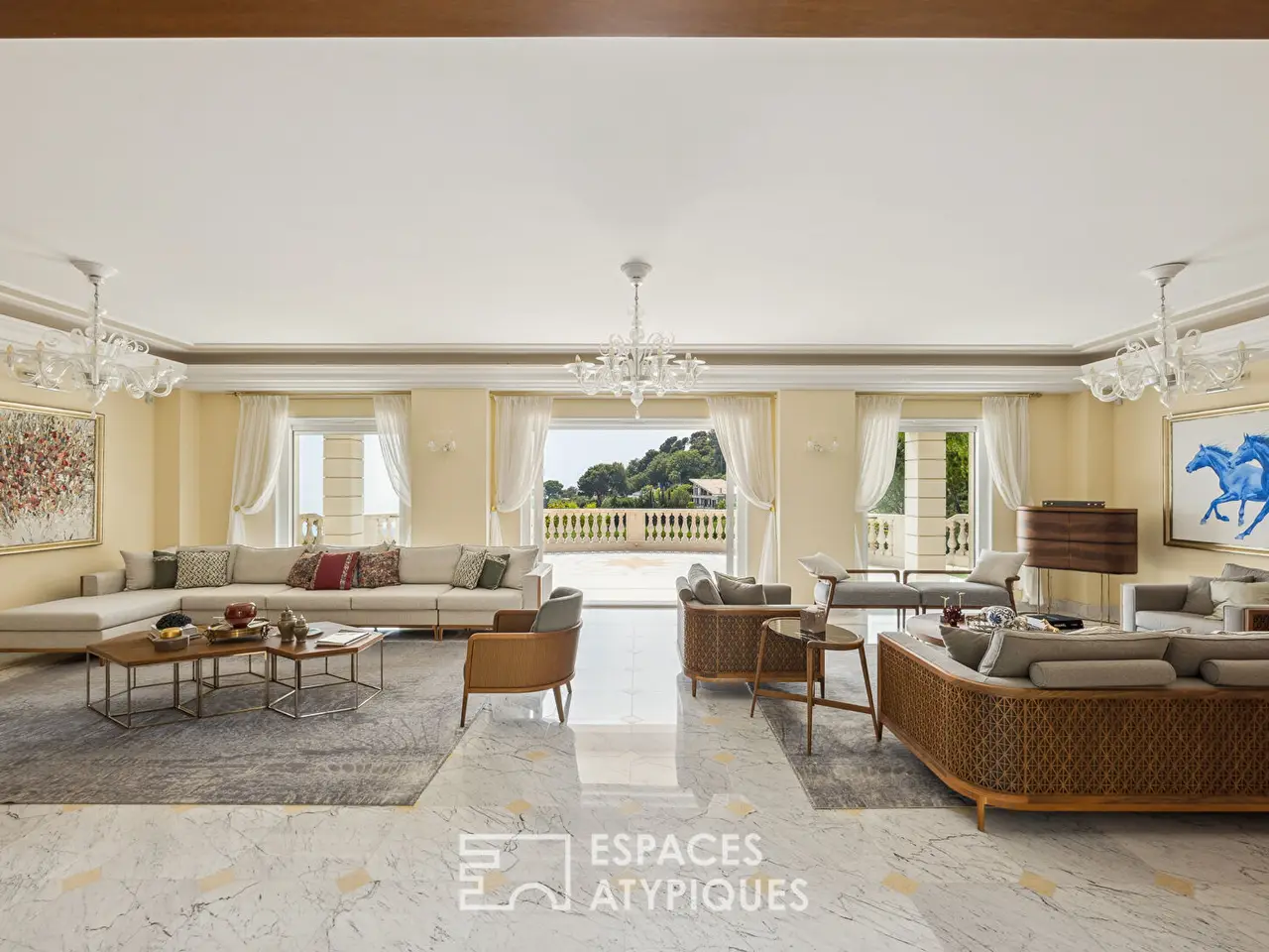 Perched in an idyllic setting, this sumptuous property with Palladian architecture exudes all the charm of a Mediterranean lifestyle. It is set in the heart of a landscaped park of approximately 2,300 sqm, a true haven of serenity where nature expresses itself in complete freedom. Bathed in light, this luxury villa offers 402 sqm of elegant interiors, designed to combine refinement, comfort, and generous volumes. From the ground floor, the 80 sqm living spaces open harmoniously onto the exterior. A large, bright living room, a cozy dining room with a fireplace, and a fully equipped kitchen naturally extend to a large terrace offering unobstructed sea views. Upstairs, five spacious bedrooms, some with direct access to the panoramic terrace, are served by four elegantly appointed bathrooms, combining modern comfort and quality materials. The lower level houses a vast 203sqm garage that can accommodate 6 to 8 vehicles, as well as a separate studio, ideal for guests or staff, and an office. This space can also be transformed into a reception room to host private events in an exclusive setting. High-end amenities enhance this residence: an elevator serving all levels, reversible air conditioning, a sophisticated alarm system, video surveillance, and a heated swimming pool inviting you to relax all year round. ENERGY CLASS: B / CLIMATE CLASS: A Estimated average annual energy expenditure for standard use, based on prices for the years 2021, 2022, 2023, is between EUR1,840 and EUR2,550. Information on the risks to which this property is exposed is available on the Georisques website: www.georisques.gouv.fr REF. 11971 Additional information * 7 rooms * 5 bedrooms * 5 bathrooms * 2 floors in the building * Outdoor space : 2311 SQM * Parking : 8 parking spaces Energy Performance Certificate Primary energy consumption b : 70 kWh/m2.year High performance housing
