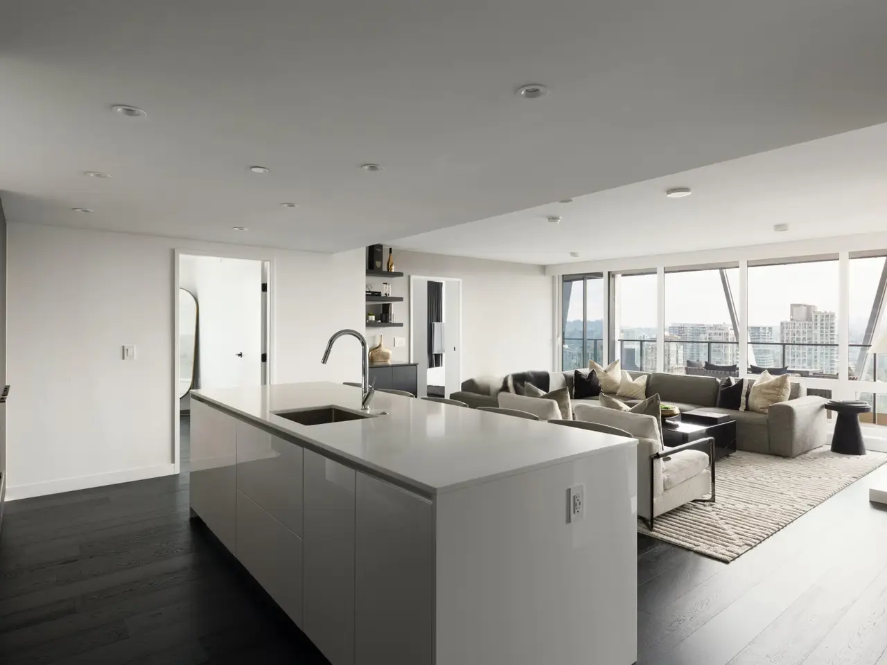 Elevated & updated corner home at 8X on the Park with panoramic views of False Creek, city, and mountains. This refined 3 bed, 2 bath residence features a 10ft natural stone island, integrated Miele appliances, custom millwork, powered blinds, and floor-to-ceiling windows. The open plan flows to an oversized covered patio with herringbone wood decking. Elegant bedrooms, a reimagined walk-in closet, engineered hardwood, natural tile, & A/C throughout complete the home. Includes 2 side-by-side parking, storage, and bike locker. Enjoy world-class amenities: concierge, fitness centre, and rooftop oasis. A rare, turnkey offering in one of Vancouver's premier buildings.