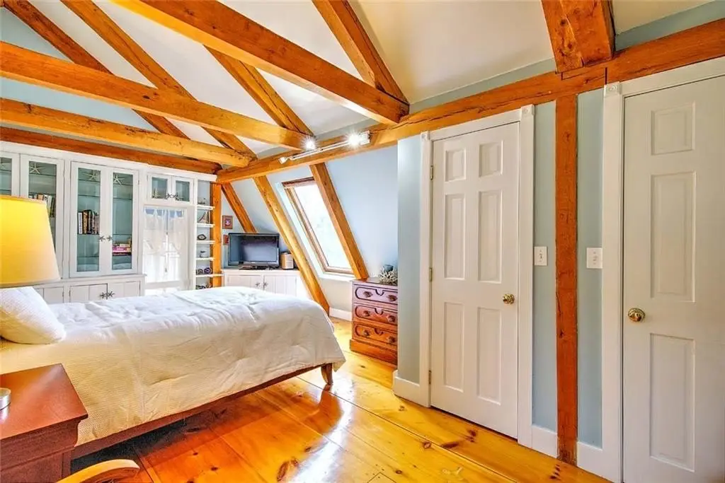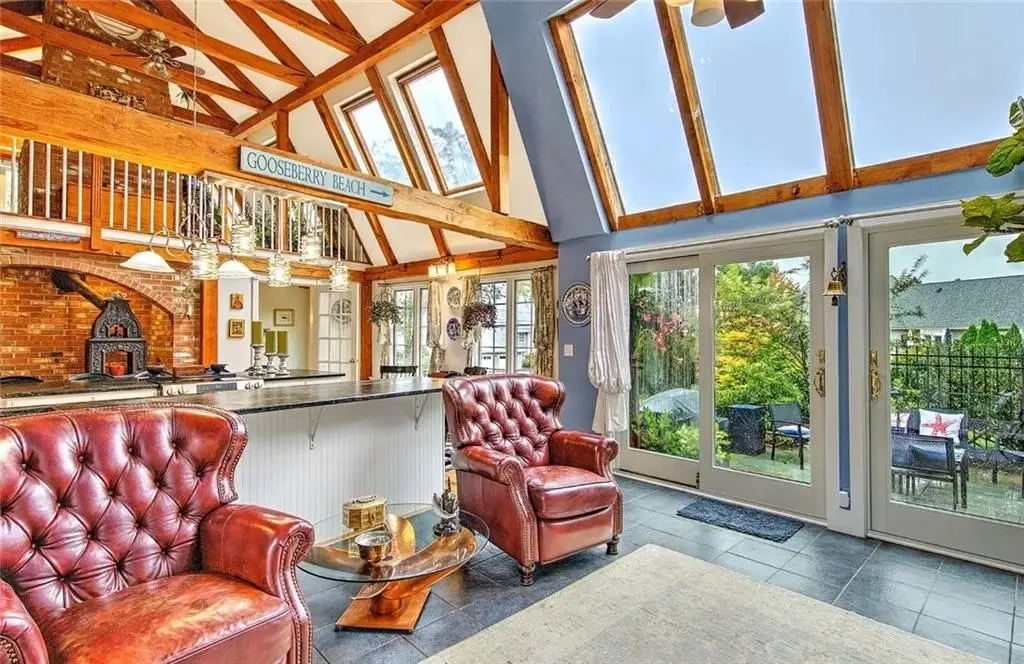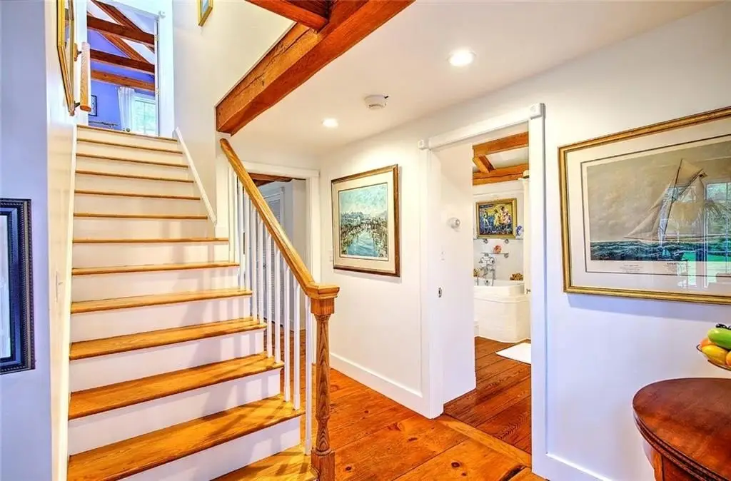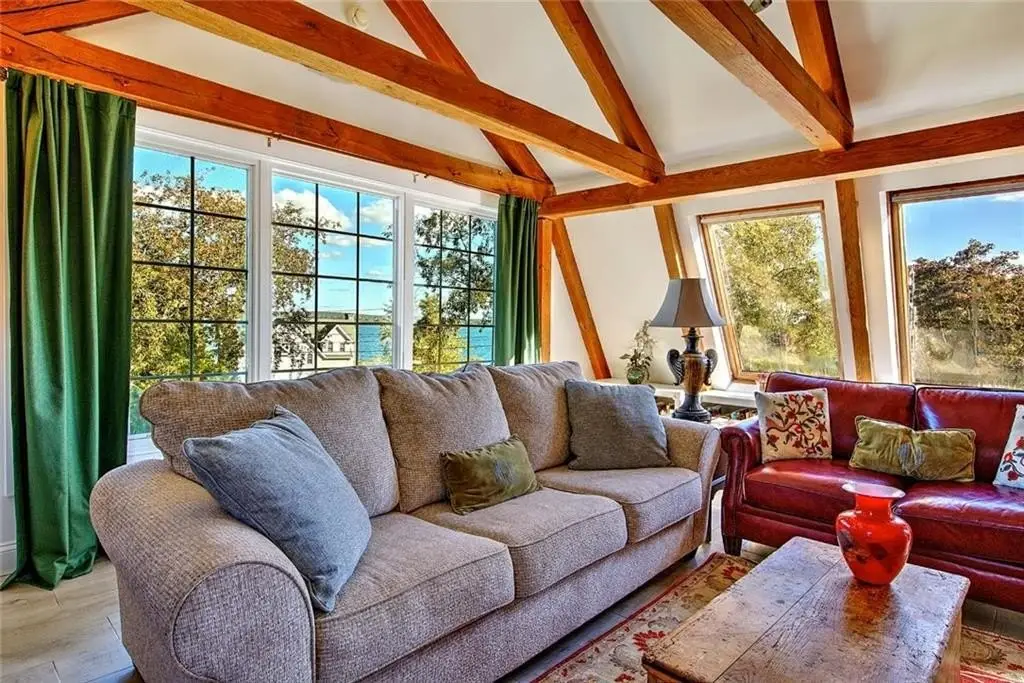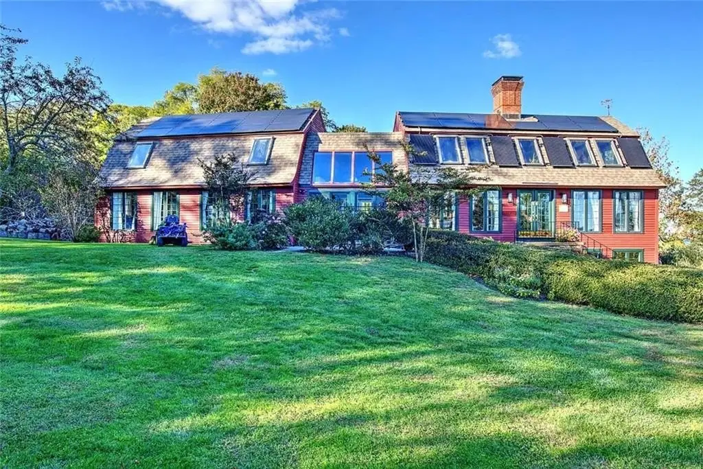 This one-of-a-kind hand-crafted post-and-beam home, named “Sakonnet Shores,” is a rare blend of artistry, sustainability, and connection to the land and sea. Built with traditional timber-frame techniques – without a single nail – the red oak beams were sourced from Massachusetts, hand-cut with wooden pegs, and raised on-site in the tradition of Amish barns. Red cedar siding, wide-plank antique pine floors milled from historic Fall River beams, and exposed timber throughout create warmth and timeless beauty. Built with SIP panels, solar design, and participation in the RI Energy program, the home is both efficient and income-generating. Natural light pours in through Pella and Andersen windows, French doors, sliders, and 10 skylights that frame saltwater views. Modern comforts include two dishwashers, dual laundry areas, a chef’s kitchen with cathedral ceilings, soapstone counters, bar seating for 12, and a walk-in pantry. The primary suite offers a spa bath, private patio, and outdoor shower, complemented by additional bedrooms, flexible office space, and multiple patios for entertaining. Fireplaces in the living room and upper salon invite cozy gatherings, while the lower-level gym doubles as a fifth bedroom with a sauna and steam shower. The 1.68-acre grounds feature flowering trees, hydrangeas, and saltwater frontage with rights to two moorings. Just minutes to Newport and 30 minutes to Providence, it’s a rare coastal retreat.