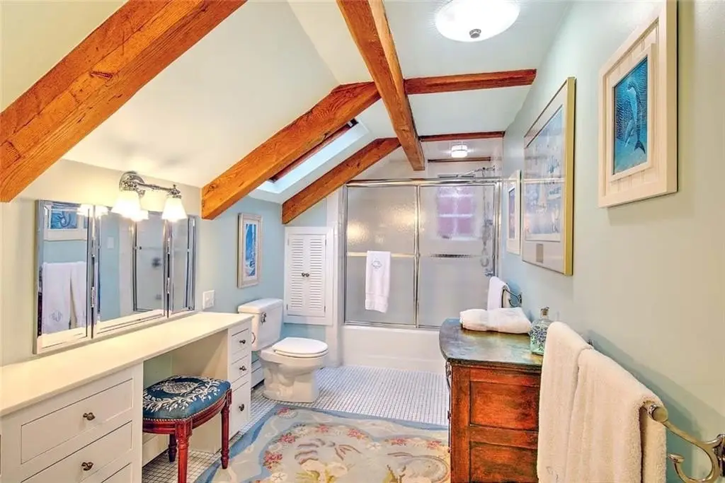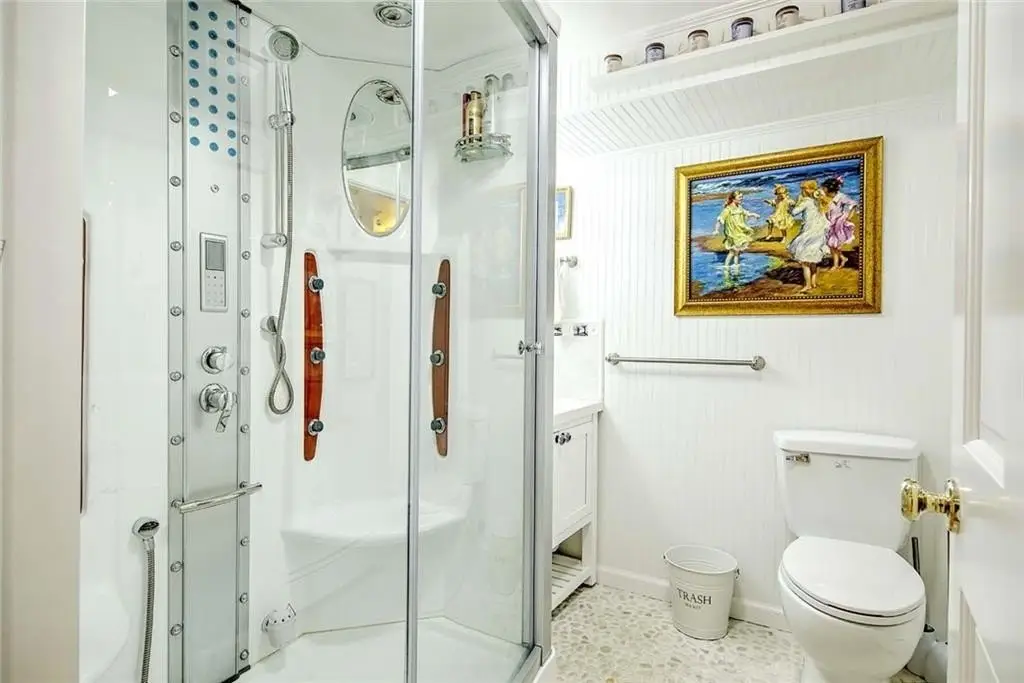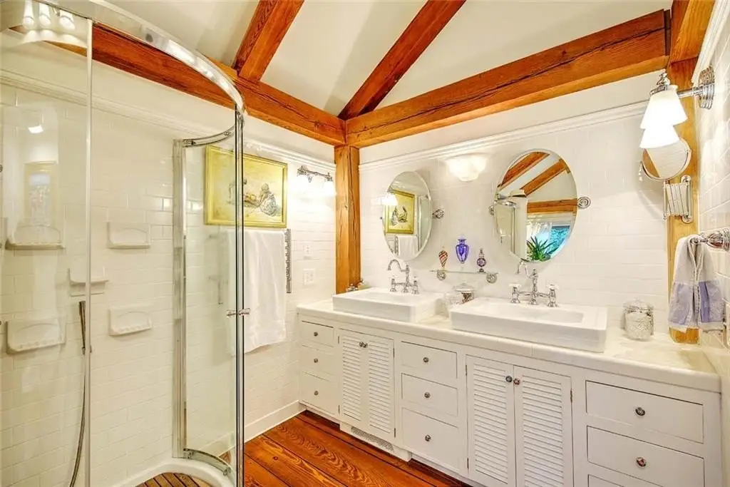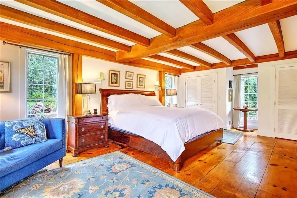 This one-of-a-kind hand-crafted post-and-beam home, named “Sakonnet Shores,” is a rare blend of artistry, sustainability, and connection to the land and sea. Built with traditional timber-frame techniques – without a single nail – the red oak beams were sourced from Massachusetts, hand-cut with wooden pegs, and raised on-site in the tradition of Amish barns. Red cedar siding, wide-plank antique pine floors milled from historic Fall River beams, and exposed timber throughout create warmth and timeless beauty. Built with SIP panels, solar design, and participation in the RI Energy program, the home is both efficient and income-generating. Natural light pours in through Pella and Andersen windows, French doors, sliders, and 10 skylights that frame saltwater views. Modern comforts include two dishwashers, dual laundry areas, a chef’s kitchen with cathedral ceilings, soapstone counters, bar seating for 12, and a walk-in pantry. The primary suite offers a spa bath, private patio, and outdoor shower, complemented by additional bedrooms, flexible office space, and multiple patios for entertaining. Fireplaces in the living room and upper salon invite cozy gatherings, while the lower-level gym doubles as a fifth bedroom with a sauna and steam shower. The 1.68-acre grounds feature flowering trees, hydrangeas, and saltwater frontage with rights to two moorings. Just minutes to Newport and 30 minutes to Providence, it’s a rare coastal retreat.
