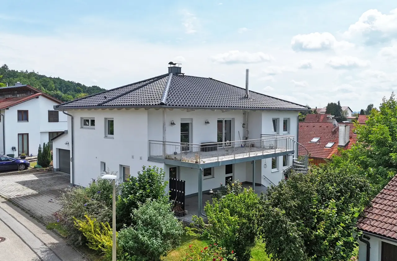 Spacious two-family house with granny apartment and modern living ambience in Bruckberg-Gündelkofen This attractive two-family house impresses with a successful combination of contemporary comfort, generous space and flexible usage options. Originally built in 1982, the building was extensively renovated and almost completely rebuilt in 2014. The total living space of approx. 260 m² includes the large terraces on a pro rata basis. The total living space is therefore around 230 m². The upper floor offers a modern living ambience with high ceilings, a spacious living and dining area, separate kitchen and a stylish panoramic fireplace, which gives the room a special atmosphere. A contemporary bathroom rounds off the attractive overall picture. The lower residential unit still retains its original character in some areas and is ideal for individual design ideas. Both apartments have a well thought-out room layout and offer plenty of space for several generations to live together comfortably or for a combination of owner-occupation and rental. Features include a high-quality fitted kitchen, parquet and tiled floors, guest WC, fireplace and modern building services with air/water heat pump. The house comprises a total of 7 rooms and 3 bathrooms. Two large terraces and a low-maintenance garden create ideal retreats for relaxing hours outdoors. There is also approx. 100 m² of additional usable space, 3 outdoor parking spaces and 2 garage parking spaces. Thanks to the modern technical equipment and the extremely well-kept condition, you will enjoy a high level of living comfort and energy efficiency (efficiency class A). A versatile house with many possibilities - for sophisticated living, cross-generational use or as a stable investment. You can call up the 360-degree digital tour under this link: https://tour.giraffe360.com/ff1323a9ac704e6986c75516be466c85/
