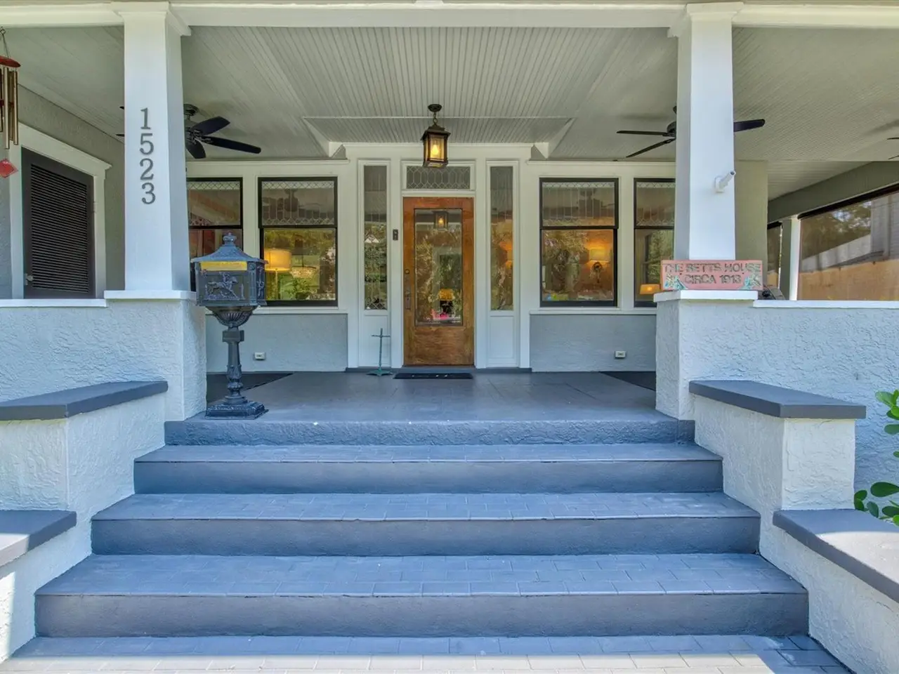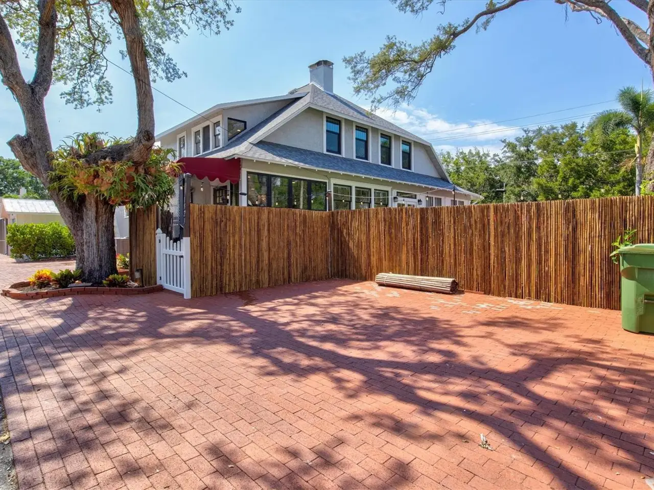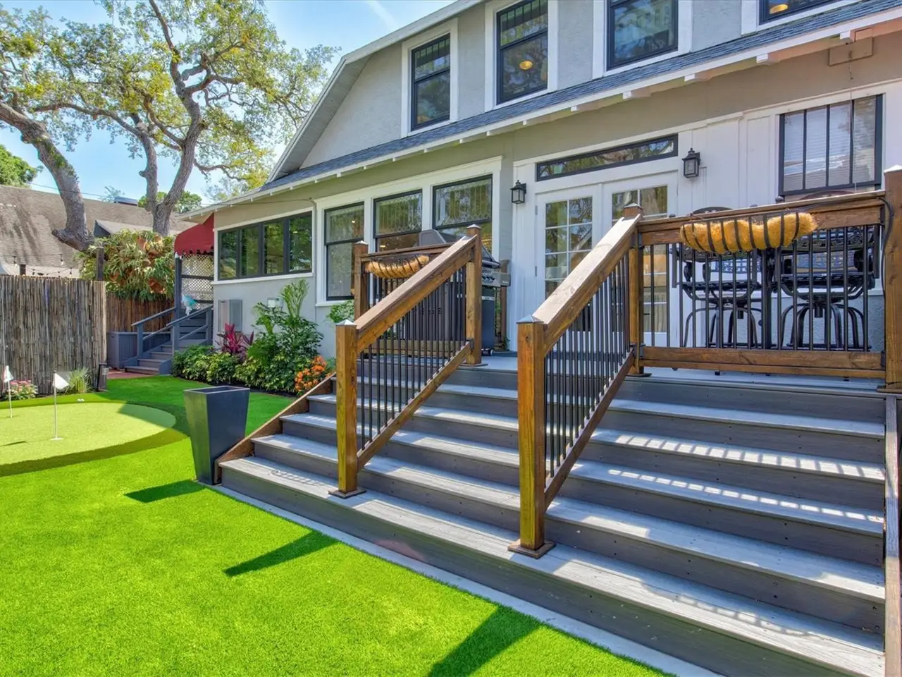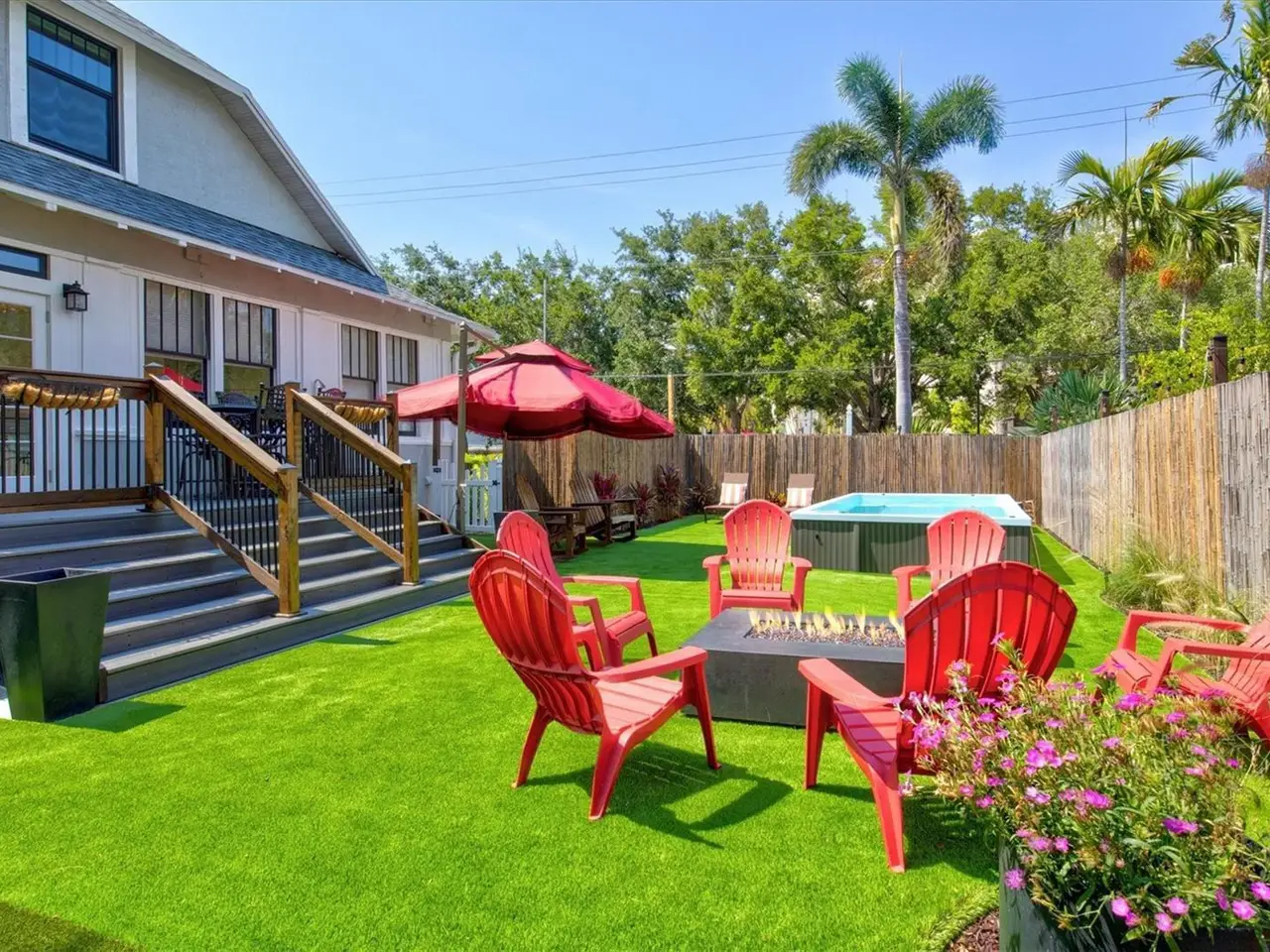 Immerse yourself in the rich history and timeless elegance of this meticulously renovated historic home located in the heart of Point Pleasant in downtown Bradenton. This distinguished two-story, 4-bedroom, 5-bathroom American Four Square home offers a harmonious blend of classic architectural charm and contemporary luxury. Originally built in 1913, the Betts House stands as a testament to Bradenton's storied past, with every detail meticulously preserved and enhanced for modern living. The newly landscaped front yard leads to the inviting, large wrap-around porch evoking a sense of nostalgia, reminiscent of days gone by. The grand living area has the original leaded windows with a fireplace and leads to both the family room and kitchen. The spacious family room has impact windows and a convenient full bath with the stairway leading to the four bedrooms and four additional baths. The remodeled kitchen and dining area is an open and inviting space overlooking the side yard. Crafted with care, the kitchen features impact windows, KraftMaid cabinetry, new LG appliances, a Bosch paneled dishwasher, exquisite butcher block counters, and complemented by an island topped with Dekton Entzo quartz. The large dining area still has the vintage leaded windows and leads to the impressive added butler's pantry that was formerly a side porch. It offers a wine refrigerator, two refrigerated drink drawers, a sink, and additional cabinetry also with Dekton Entzo quart. This area offers a seamless transition between indoor and outdoor entertaining. Once upstairs, you will find three bedrooms with three remodeled ensuite baths and a fourth bedroom serviced by an updated hall bath. The added primary bath has a spacious walk-in shower, dual vanities, and a private water closet. Step outside and discover a private oasis, complete with a composite side deck, rebuilt back porch, and a partially submerged 15'x8'x5' dual swim jet lighted Swim Spa. Practice your putting skills on the professionally installed 4-hole putting green, surrounded by lush artificial turf and expertly landscaped gardens. After a busy day, relax by the gas fire pit or rinse off in the outdoor shower before your resistance swim. Enjoy privacy with new bamboo fencing and landscape lighting, while the addition of string lighting illuminates the side yard for enchanting evenings under the stars. Thoughtful updates include a new roof in 2022, a replacement of the upstairs HVAC unit in 2023, 16 new impact windows, and a complete refinished and staining of wood floors, stairway, and handrails. In addition, the interior has been freshly painted and has new light fixtures and new window treatments throughout. Perfectly situated a very short distance from historic Old Main Street with its charming shops, bars, and restaurants as well as the marina, Manatee River, and the Riverwalk. The Betts House offers unparalleled access to the best of Bradenton's waterfront living. Experience the perfect harmony of history and modern comforts by discovering the timeless allure of this exceptional residence.