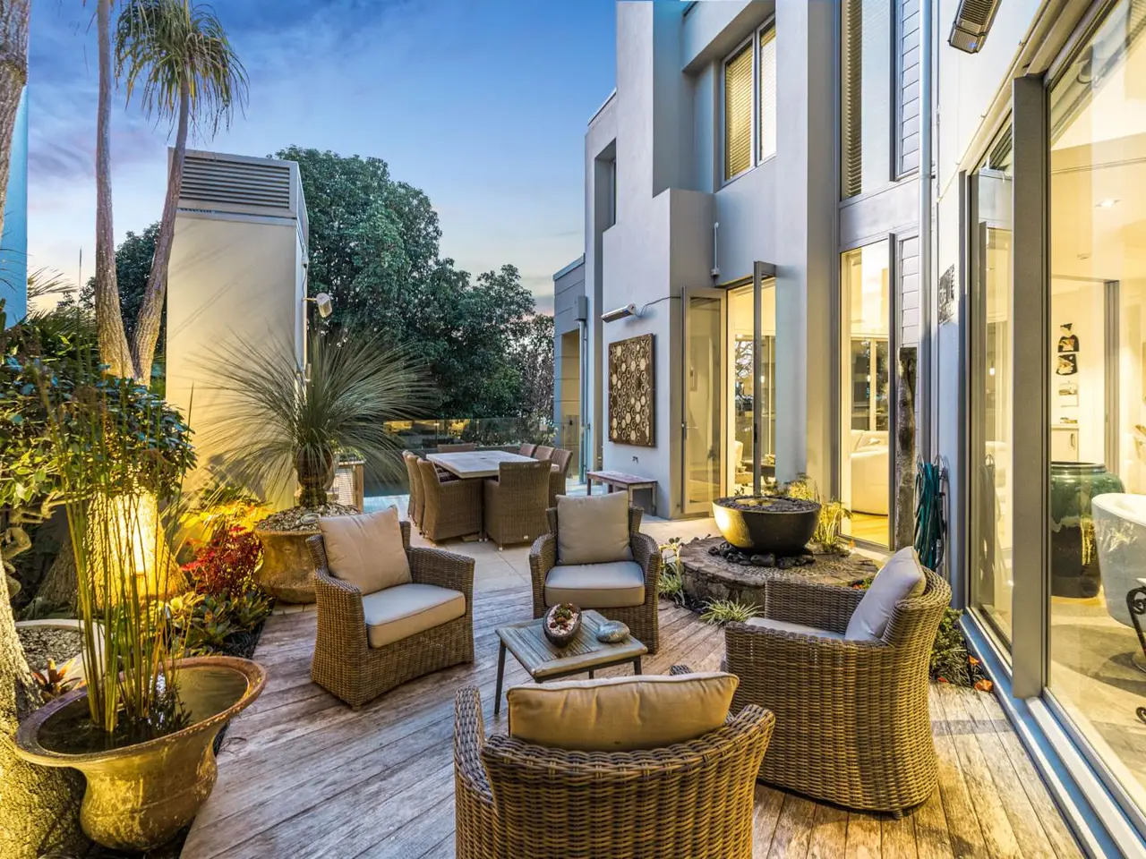 This majestic Brent Hulena-designed residence occupies a prized dual-access corner site in one of Auckland's most tightly held and exclusive beachside neighbourhoods. Constructed from concrete and spanning approximately 423 sqm across three luxurious levels with elevator access, the home combines timeless architecture with exceptional functionality. Bordering a reserve and footpath, the property enjoys a rare sense of seclusion while capturing framed views of the village, harbour, beaches, and distant city skyline. Set on 436 sqm (approx.) of lush subtropical gardens, it features a private in-ground saltwater pool and multiple sun-drenched outdoor living areas, including a sheltered alfresco zone with an open fireplace. Inside, a generous central foyer leads to two distinct living areas separated by cavity sliders-one a carpeted formal lounge, the other a timber-floored family and dining zone. Both offer gas fireplaces and seamless flow to outdoor spaces. The north-facing aspect bathes the interior in natural light, enhancing the sleek designer kitchen with Bosch dual ovens, gas hob, stone waterfall island, and warm timber cabinetry. Upstairs, four generous double bedrooms and three beautifully tiled bathrooms include a luxurious master suite with private balcony, walk-through wardrobe, and an opulent ensuite featuring a freestanding Victoria + Albert bathtub and dual vanities. Additional features include a powder room, full laundry, wine cellar, and internal access to triple garaging. Securely walled and gated, with select rooms air-conditioned and the gardens professionally landscaped, this outstanding home offers privacy, security, and effortless family living in a world-class coastal location-just a short stroll from village shops, cafes, restaurants, parks, and in zone for St Heliers School.