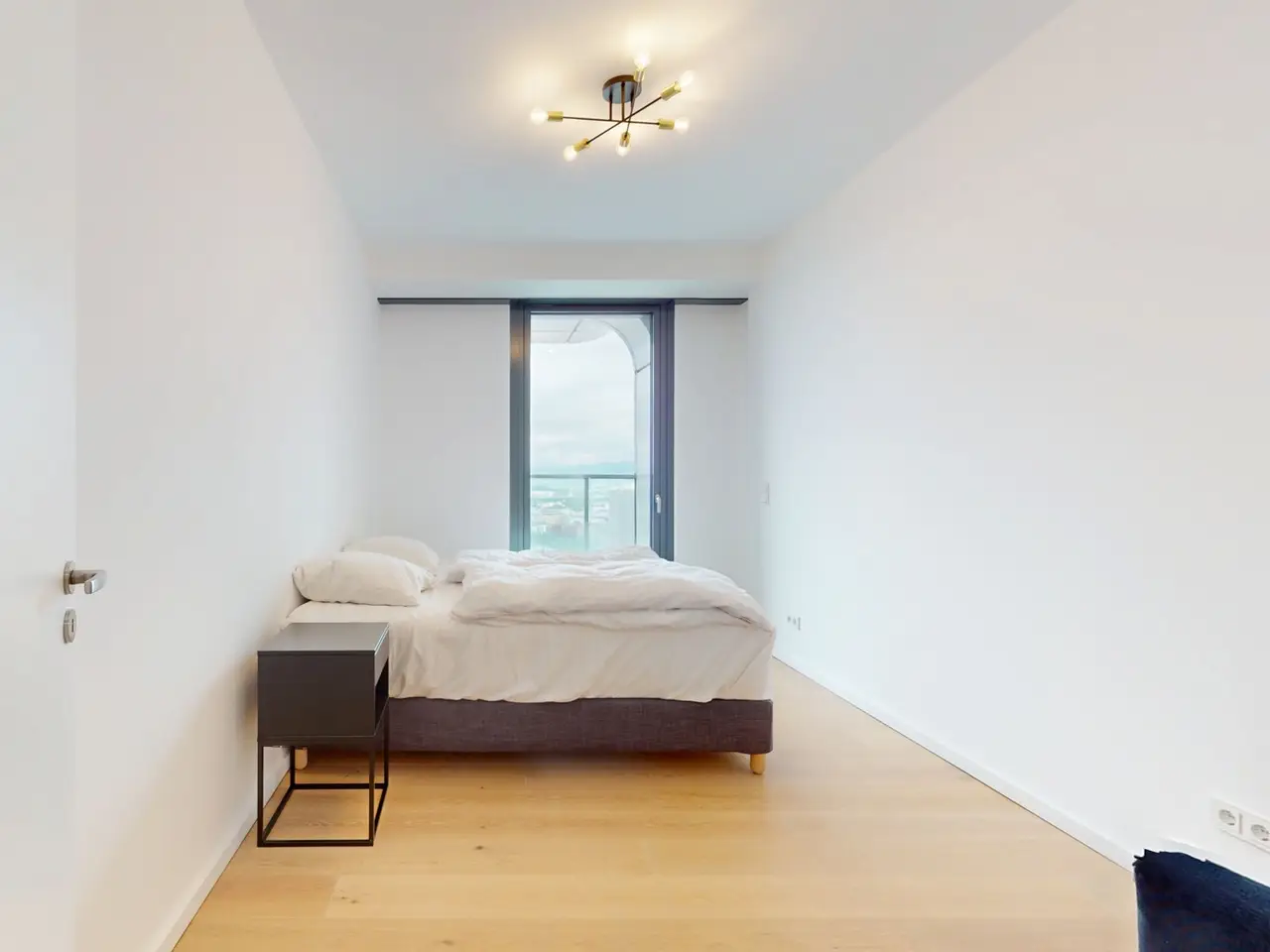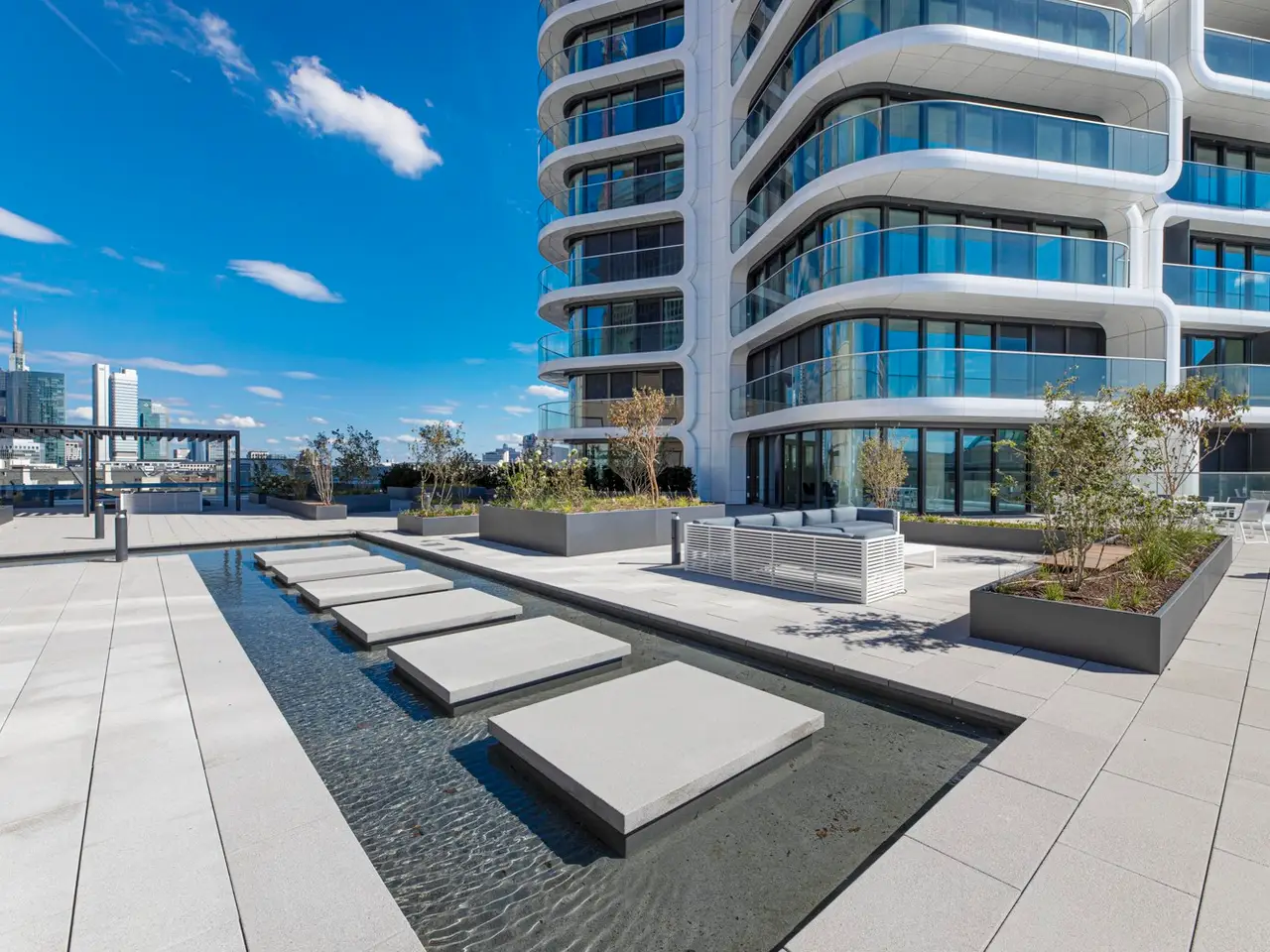This absolute premium apartment is located on the fortieth floor of the Grand Tower, currently Germany's tallest residential tower at 180 meters - the most sought-after landmark building in Frankfurt. The transparent architecture, reminiscent of honeycombs, and the floor-to-ceiling windows offer airy living and magnificent views. The living/dining area is flooded with light and features curved glass fronts. From here, you have access to the balcony with all-round glass balustrade and views of Frankfurt and its skyline, as well as the Taunus and the entire surrounding area. The three bedrooms, one of which has its own balcony, offer great and practical living space. The communal Grand Garden on the seventh floor with lounge areas and herb garden and the Sunset Terrace on the 43rd floor invite you to relax and provide a communicative, urban atmosphere and magnificent views of the sunsets. The 24-hour concierge service and the Club Kitchen on the seventh floor are further highlights of this exceptional apartment. An underground parking space is included in the purchase price. The apartment is ideal for singles, couples or small families with up to one child who appreciate urban living in the Grandtower, combined with a high level of living comfort and communal areas for relaxing.